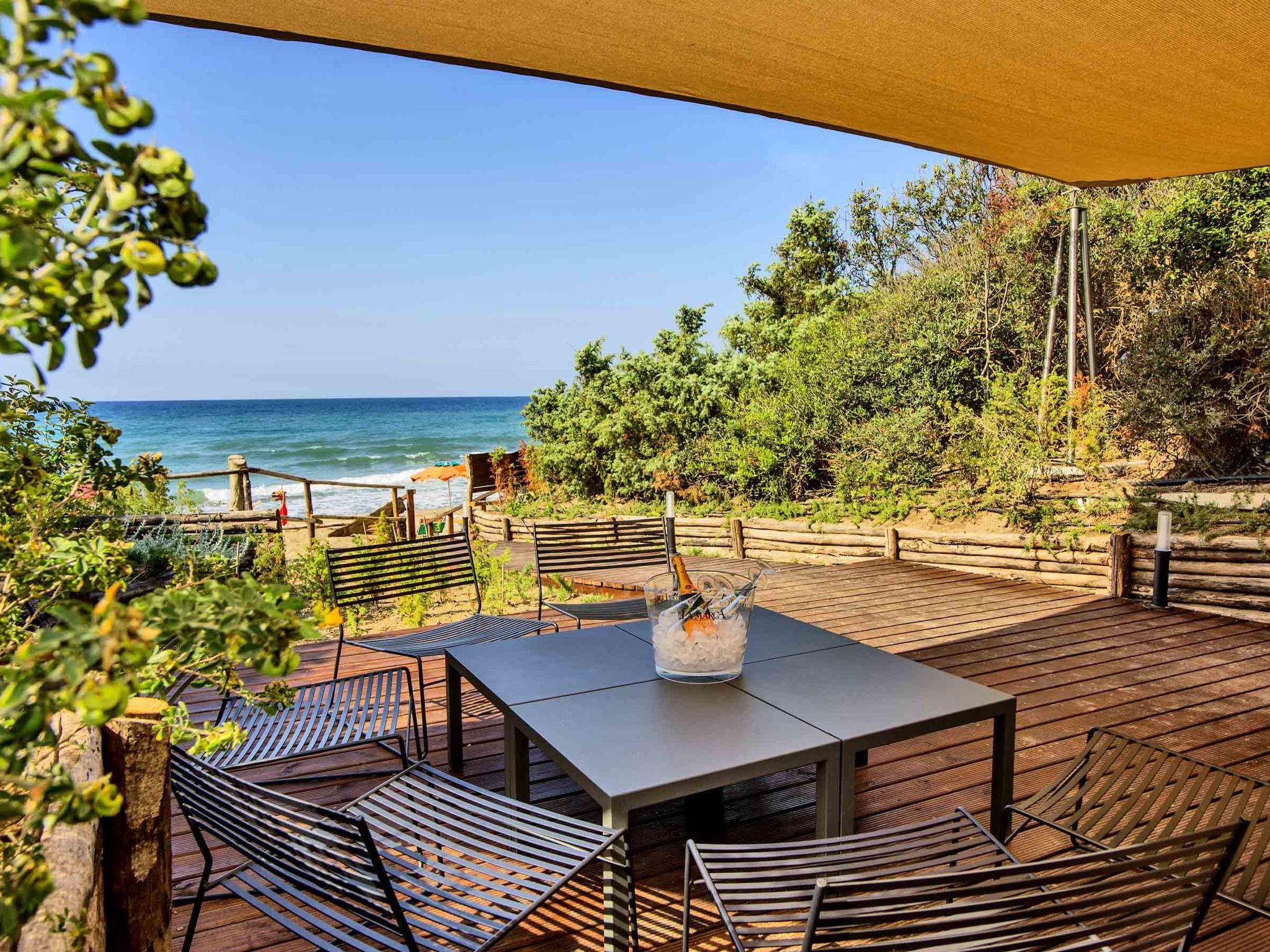 "Deluxe", 3-Zimmer-Haus 40 m2, im Erdgeschoss. Modern und stilvoll eingerichtet: Wohn-/Esszimmer mit 1 Doppeldiwanbett, Küchenblock und Digital-TV. Ausgang zur Terrasse. 1 Doppelzimmer mit Digital-TV. 1 kleines Zimmer mit 2 Betten. Kochnische (3 Induktionskochplatten). Dusche/Bidet/WC. Klimaanlage. Gartensitzplatz. Sitzplatz. Zur Verfügung: Internet (Wireless LAN, gratis). Die Unterbringun von Behinderten muss im Voraus beantragt werden.