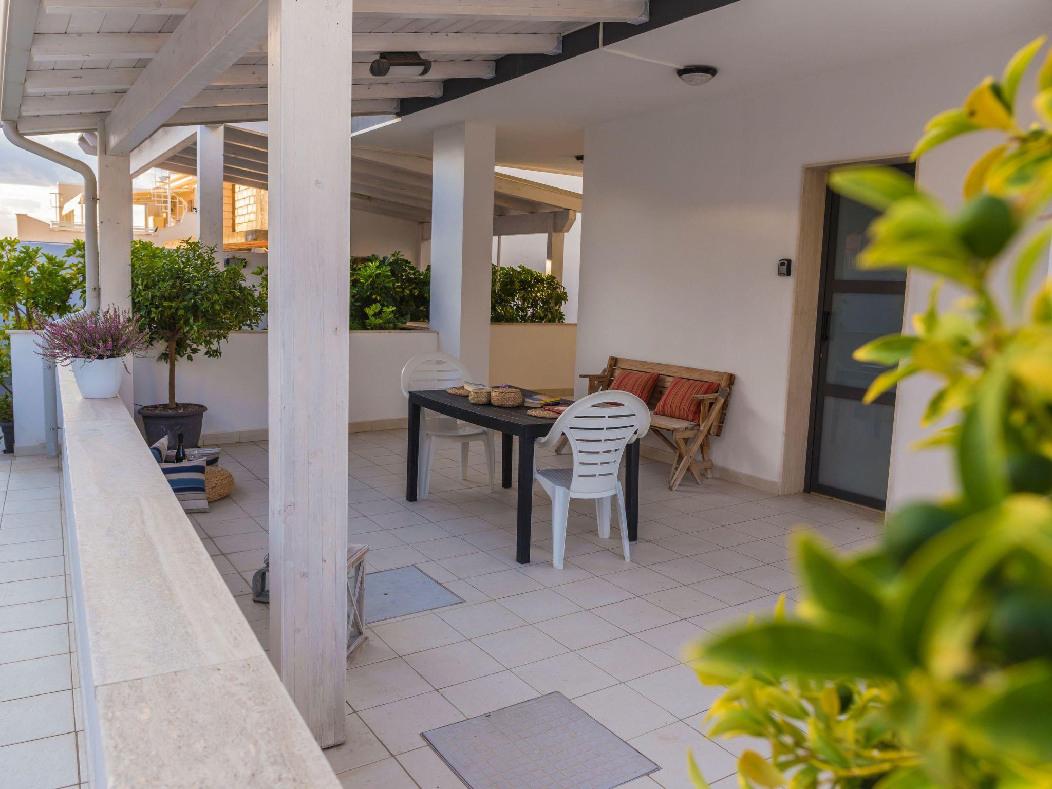 Penthouse mit Meerblick im zweiten Stock, bestehend aus einem Schlafzimmer mit Doppelbett, Wohnzimmer/Küche mit Doppelschlafsofa, Bad und Terrasse mit Tisch und Stühlen.