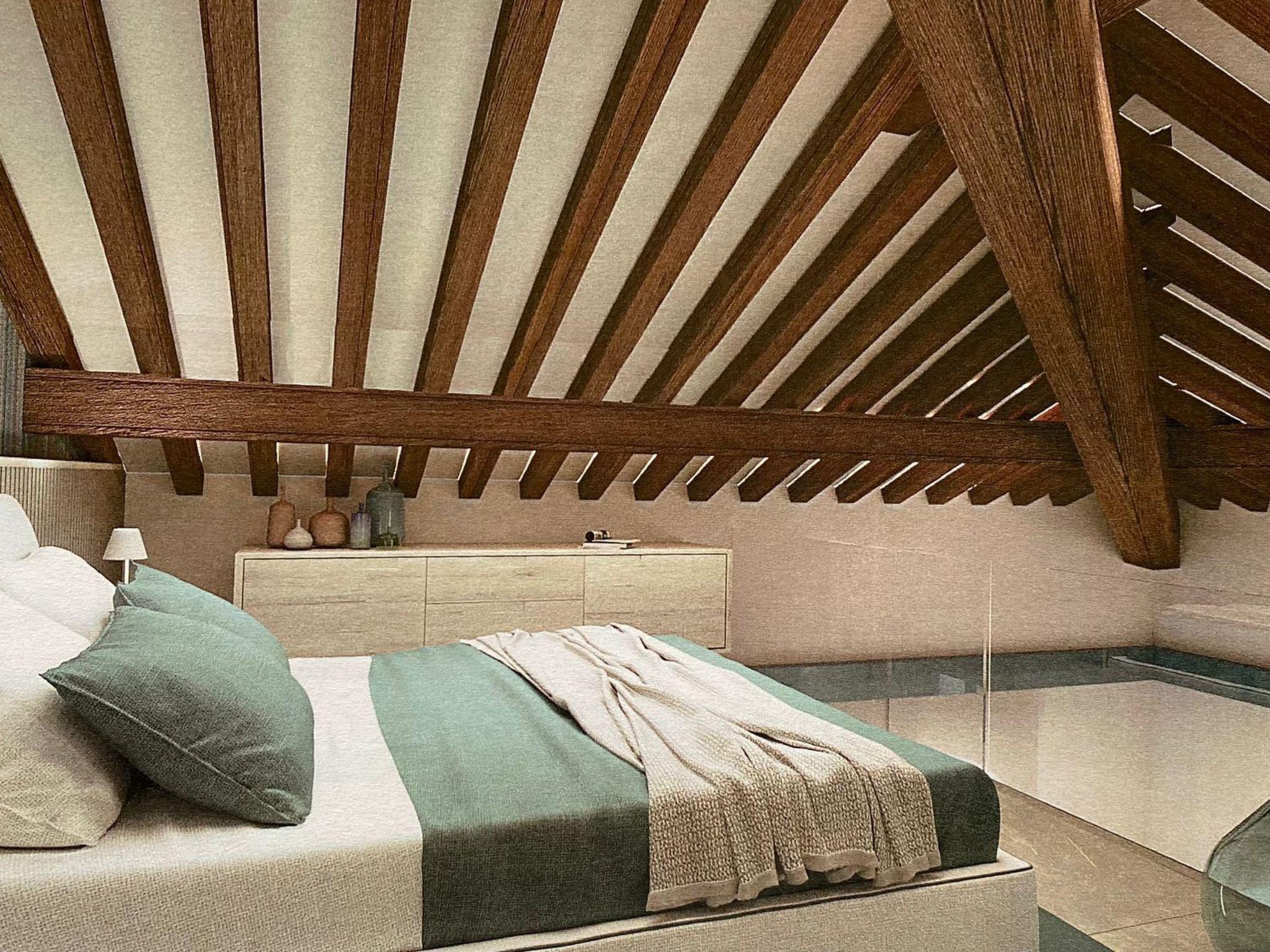 Von der Küche aus erreichen Sie einen zweiten Wohnbereich mit Schlafcouch für 2 Gäste und einem modernen en-suite Badezimmer mit Dusche. Über eine Treppe gelangen Sie zur zweiten Mansarde mit einem weiteren Doppelbett für 2 Gäste.