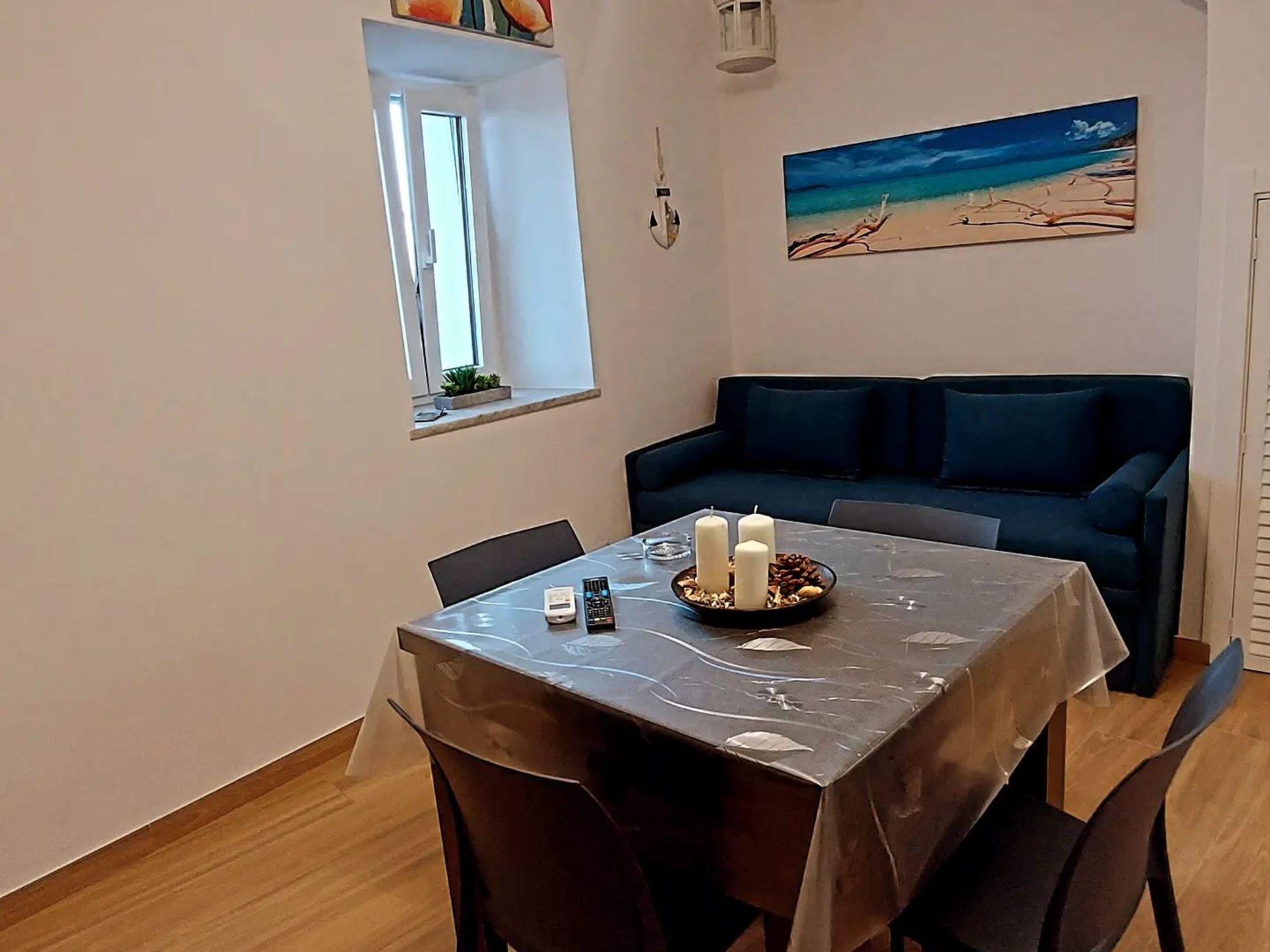Die Wohnung mit ihrer gemütlichen, heimeligen und warmen Atmosphäre verfügt über eine Wohnfläche von 30 m², die sich auf zwei Ebenen verteilt. Im Erdgeschoss befindet sich ein Esszimmer mit einfacher, funktioneller Einrichtung: ein Schlafsofa, ein Tisch mit Stühlen und ein Fernseher mit nationalen Programmen. Ein hübsches Fenster bietet einen herrlichen Blick auf das Meer. Es gibt eine kleine Küche mit einem Herd, einem Gasherd, einem neuen Schrank, einem Kühlschrank und einer Waschmaschine. Töpfe, Pfannen, Teller, Gläser, eine italienische Kaffeemaschine, Besteck und alles, was man zum Kochen braucht, sind vorhanden. Vom Esszimmer aus gelangt man auch in das Badezimmer. Es ist klein und verfügt über eine Dusche, ein Waschbecken, eine Toilette, einen Haartrockner und eine Waschmaschine. Vom Esszimmer führt eine Treppe zum Entspannungsbereich. Die Möbel sind funktionell, aber bequem. Es gibt einen Kleiderschrank, ein Doppelbett und zwei Nachttische mit Lampen. Die Wohnung ist mit Heizung und Klimaanlage ausgestattet.