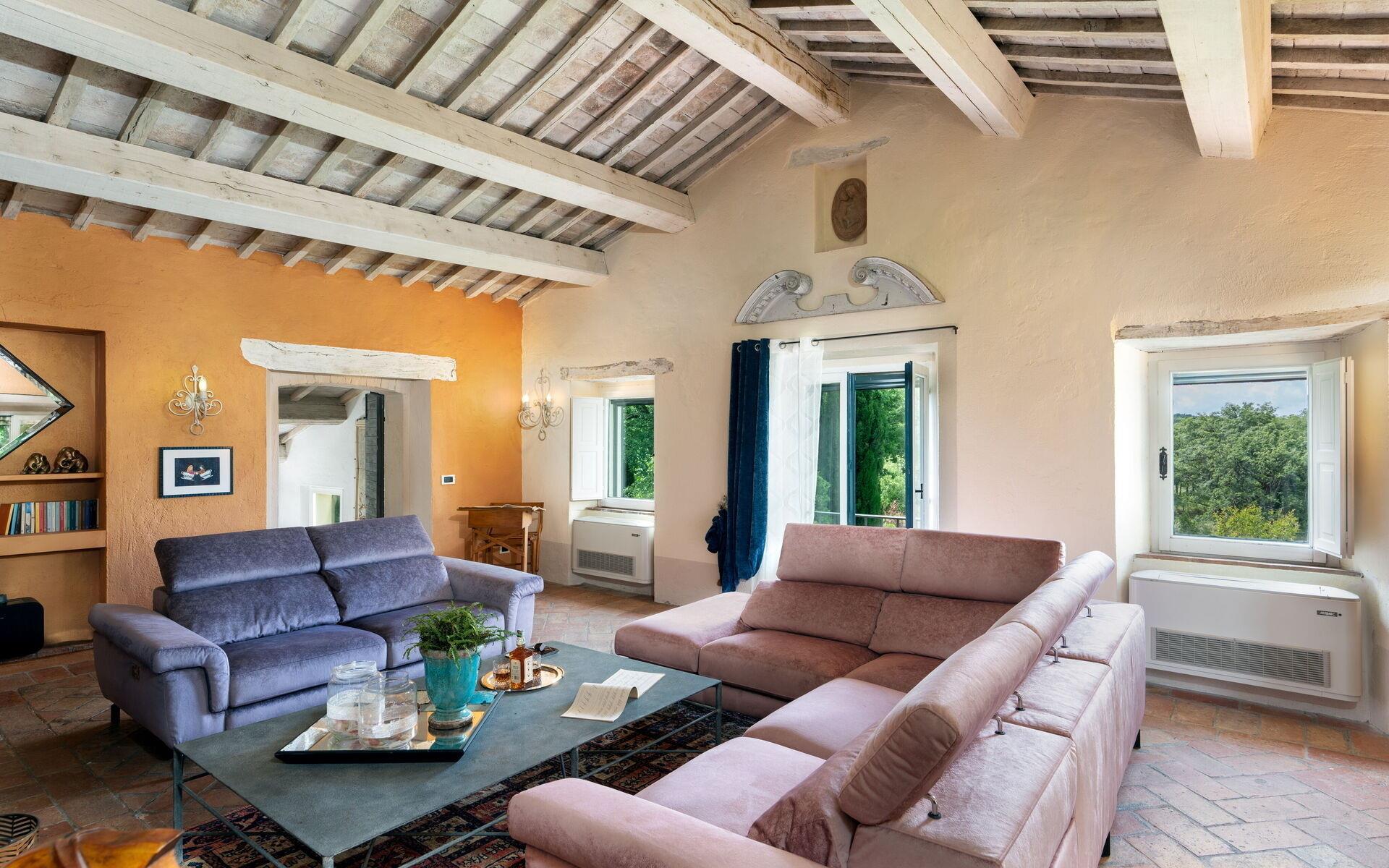 Im ersten Stock befindet sich ein Wohnzimmer mit Blick auf die Terrasse. Hier können sich die Gäste auf den bequemen Sofas entspannen, ein Buch lesen oder fernsehen. Das Wohnzimmer ist mit Designermöbeln und feinen Details ausgestattet, die den neu interpretierten toskanischen Stil der Villa widerspiegeln.