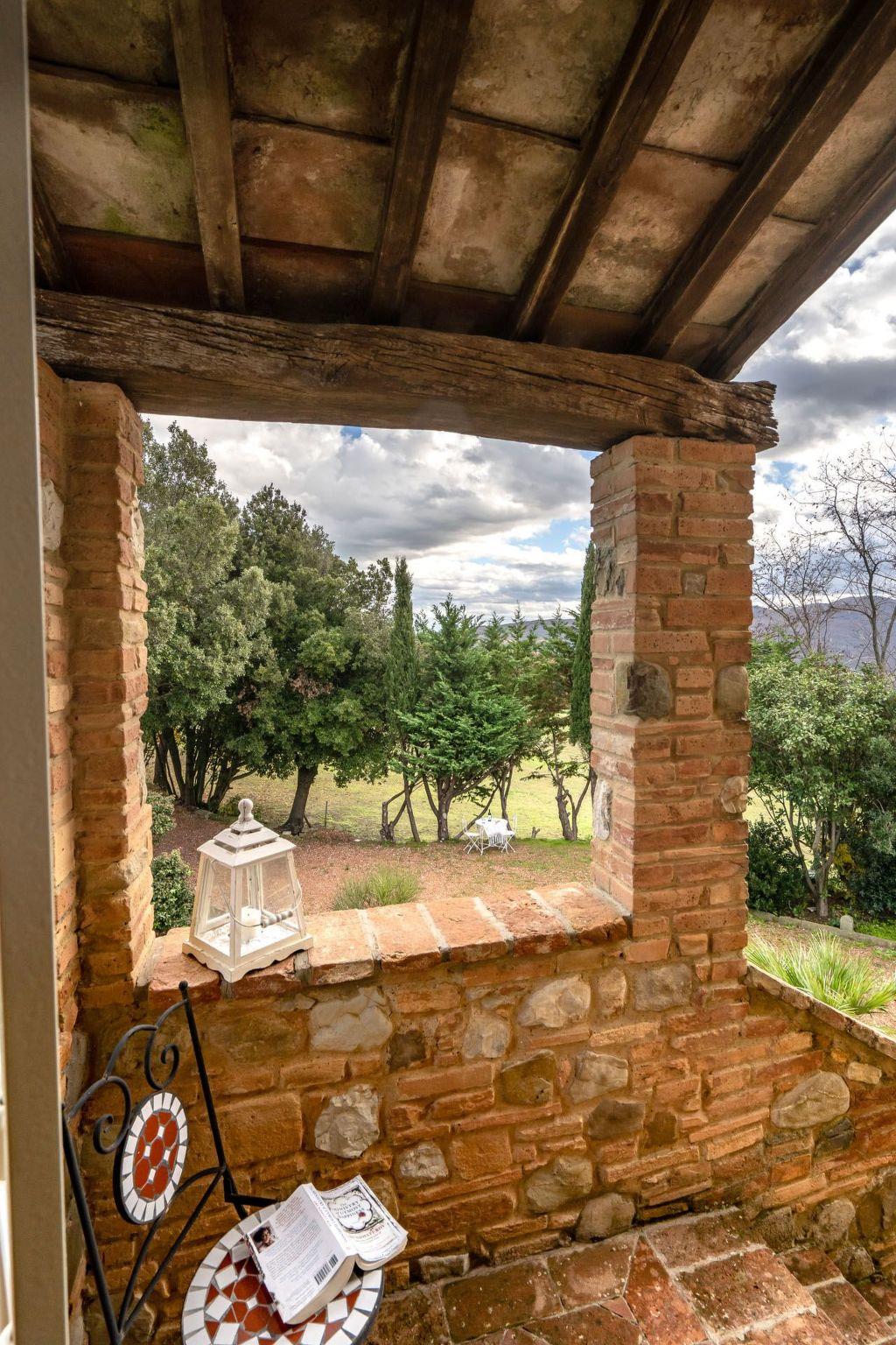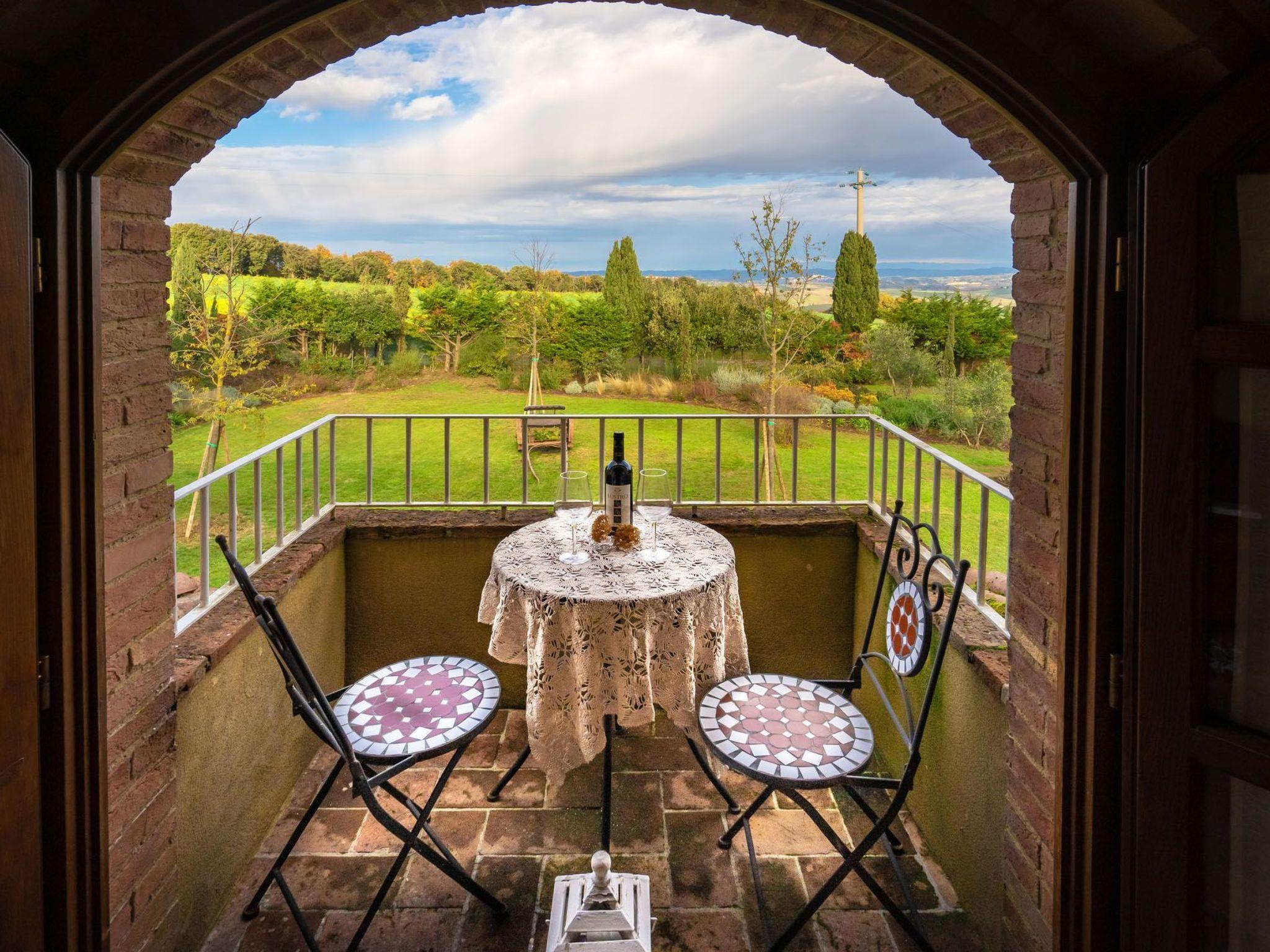 Über eine Außentreppe, die typisch für toskanische Bauernhäuser ist, gelangt man in das Innere der Wohnung, das aus einem großen Wohnzimmer, einer voll ausgestatteten Küche und zwei Terrassen mit Panoramablick besteht. Der Schlafbereich besteht aus zwei eleganten Doppelschlafzimmern mit eigenem Bad. Im Erdgeschoss befindet sich ein schöner Laubengang, der vom Garten umgeben ist und mit einem Sofa und Sesseln ausgestattet ist. Vor der Veranda befindet sich eine Außenküche mit einer überdachten Veranda, die für Abendessen für bis zu 8 Personen ausgestattet ist und exklusiv genutzt werden kann. Von hier aus, wie auch von allen Seiten des Hauses, hat man einen fantastischen Blick auf die umliegenden Hügel und die Stadt Volterra.