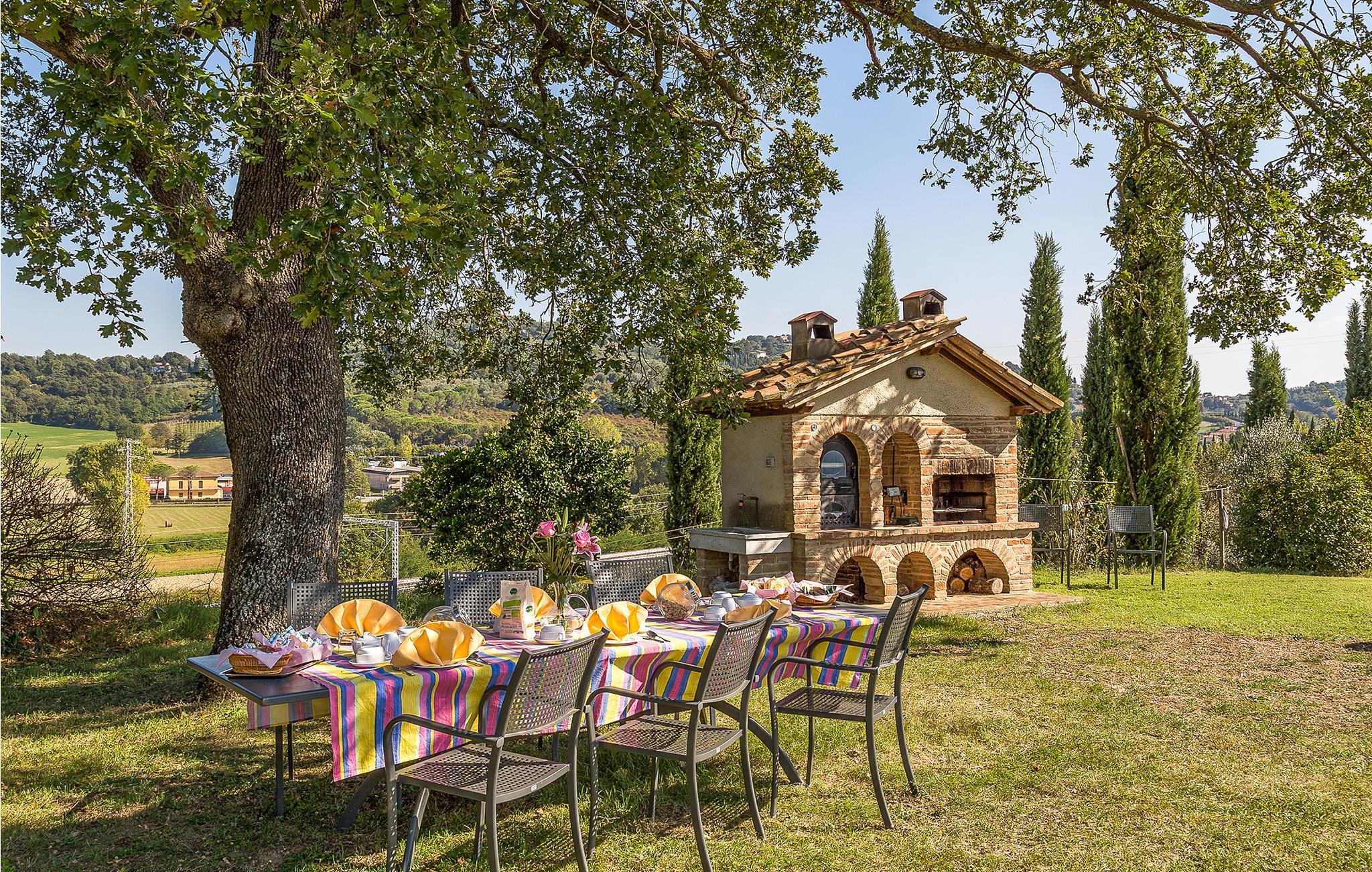 Dieses schöne Ferienhaus bietet Platz für bis zu 12 Gäste. Der große private Garten mit eigenem Pool ist herrlich um zu Entspannen und um das wundervolle Wetter der Toskana zu genießen. Hier können Sie morgens frühstücken oder den Tag bei einem Glas Wein aus der Region ausklingen lassen, während Sie den Ausblick auf die umliegende Hügellandschaft bewundern.