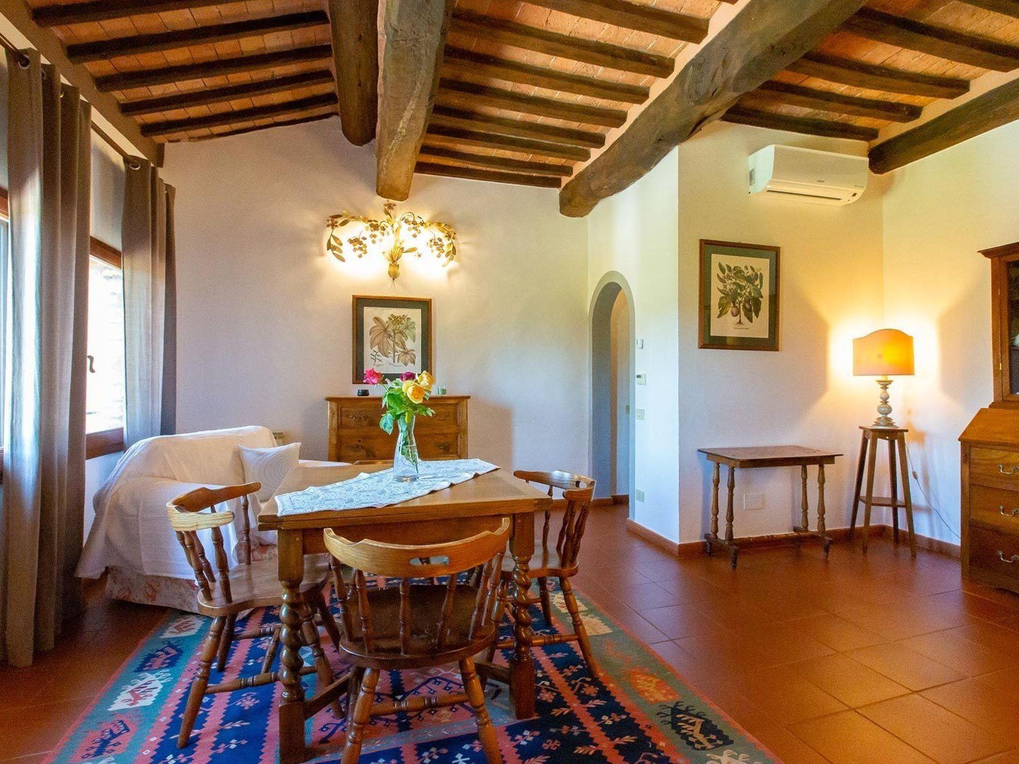 Standort Macciano. Mitten im herrlichen "Val di Chiana", im ersten Stock eines prächtigen Bauernhauses aus dem 16. Jahrhundert gelegen, das komplett renoviert wurde, genießt die Wohnung dank eines Wohnzimmers, das aus einer alten Fensterloggia entstanden ist, einen wunderbaren Blick auf das gesamte umliegende Tal.Vali Apartment im ersten Stock mit Blick auf den schönen Rosengarten der Villa. Es besteht aus einem Wohn-Esszimmer mit Schlafsofa, einer offenen Küche, einem Schlafzimmer mit Doppelbett und einem Bad mit Dusche. Der Außenbereich ist mit Sonnenschirm, Tisch und Stühlen ausgestattet.