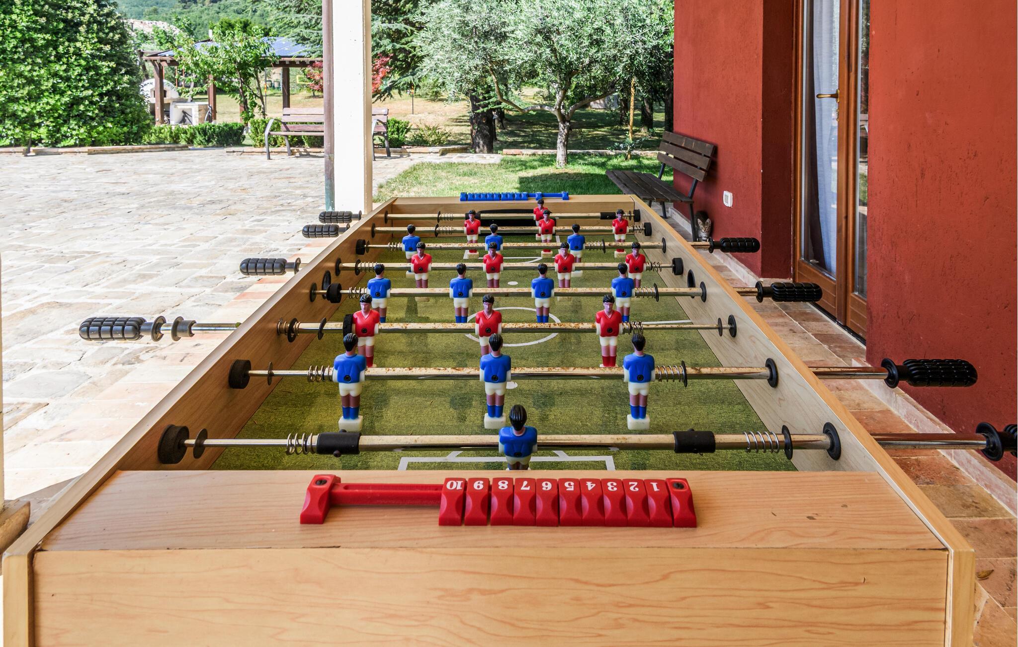 Etwas außerhalb von Cingoli heißt Sie dieses charmante Ferienhaus, umgeben von der malerischen Landschaft der Marken, willkommen zu einem erholsamen Aufenthalt. Vielleicht springen Sie ja gleich morgens in den großzügigen Pool, der von gepflegten Grünflächen und schattigen Bäumen umgeben ist. Ihr Frühstück können Sie auf der überdachten Terrasse, die mit einem großen Esstisch ausgestattet ist, genießen. Hier können Sie die frische Luft und die Ruhe der Natur genießen. Das Wohnzimmer ist mit Holzbalkendecken und bequemen Möbeln ausgestattet, die eine gemütliche Atmosphäre schaffen.