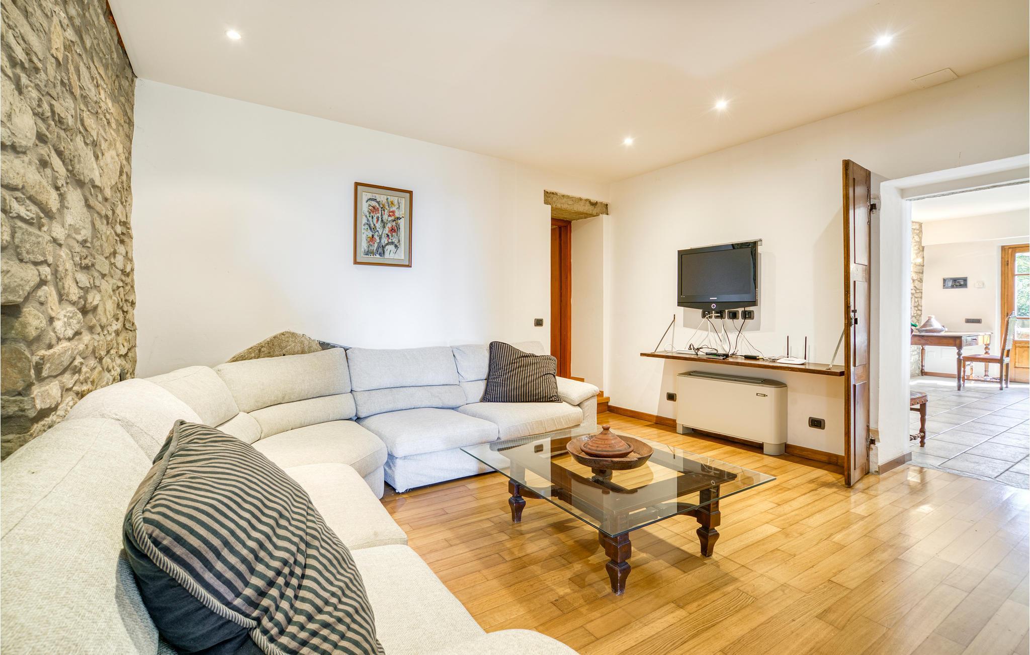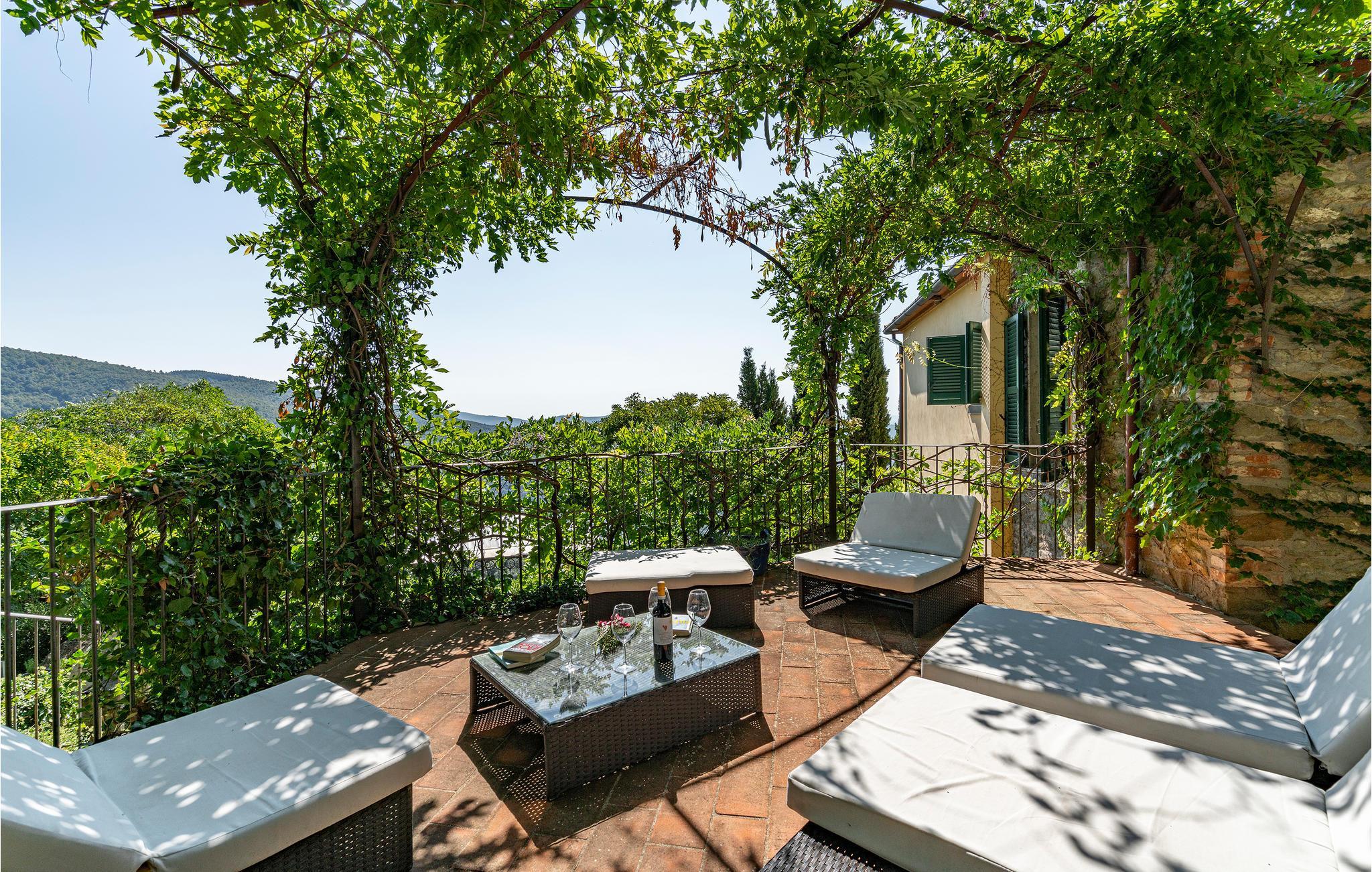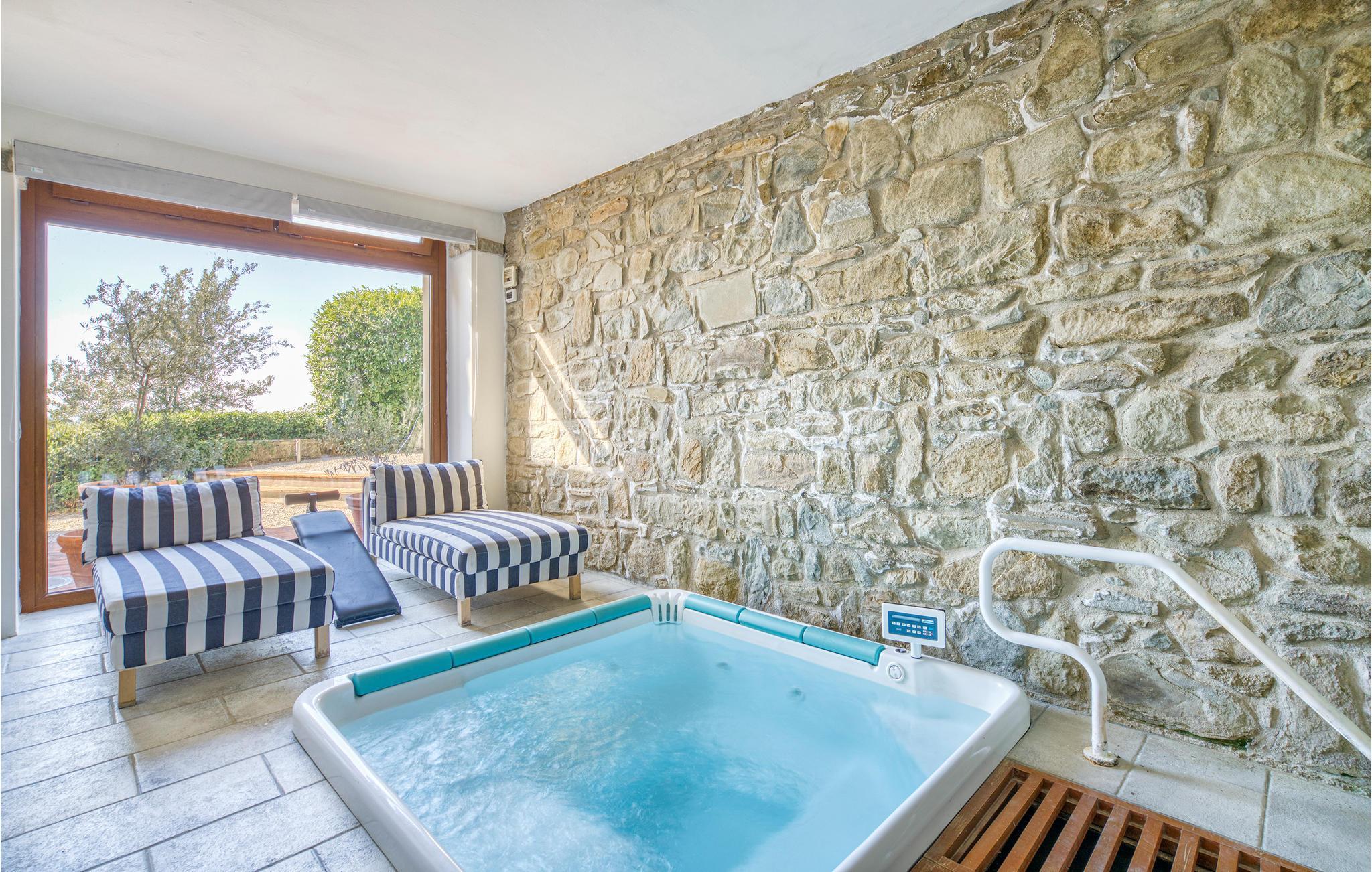 Etwa 5 km oberhalb von Cortona liegt dieses komfortable Landhaus mit einzigartigem Panoramablick auf das Chiana-Tal. Im Erdgeschoss finden Sie den Eingangsbereich, das Esszimmer und eine offene, bestens ausgestattete Küche; das Wohnzimmer mit TV sowie den Wellnessbereich mit Whirlpool und Sauna. Im 1. Stock vier Schlafzimmer mit Bädern, ein Wohnzimmer mit Schlafcouch. Etwa 50m oberhalb liegt die Dependance, ein rustikales Nebengebäude mit Wohnraum (Schlafsofa) und weiteren zwei Schlafzimmern im 1. Stock. Der zweite Stock des Hauses mit unabhängigem Zugang von der Hinterseite ist vom Angebot ausgeschlossen und wird gelegentlich vom Eigentümer bewohnt. Eine überdachte Terrasse mit Barbecue und tollem Blick ist der gesellige Mittelpunkt der beiden Gebäude. Der Poolbereich mit Sonnenterrassen liegt auf einer oberhalb gelegenen Terrasse, mit atemberaubendem Blick! Außerdem weitere Gartensitzplätze, Pizzaofen, Tischfußball, verschiedene Spiele und vor allem: Beste Möglichkeiten zum Trekken und Biken direkt vom Ferienhaus ab! Auch Cortona ist zu Fuß gut erreichbar: Entdecken Sie die malerischen Sträßchen und Gassen der pittoresken Etruskerstadt. Beobachten Sie das lebendige Treiben vor einer der zahlreichen Bars und Weinstuben, gemütlich bei einem Cappuccino oder Aperitif. Das etruskische Museum sollten Sie nicht auslassen und auch ein Spaziergang hinauf zur Festung lohnt sich. Besonders beeindruckend ist das nahe gelegene Franziskanerkloster Le Celle, ein romantischer Ort der Besinnung, auch gut zu Fuß zu erreichen. Ausflugsziele: Im Nu erreichen Sie den Lago Trasimeno mit seinen Sandstränden und kleinen Inseln (20 km). Den Rosso di Montepulciano können Sie vor Ort in der mittelalterlichen Hügelstadt (30 km) probieren und erwerben; das reizende Renaissance-Städtchen Pienza mit atemberaubender Sicht über das einmalige Orcia-Tal (45 km) wird Ihnen in Erinnerung bleiben. Besuchen Sie Arezzo mit seiner beeindruckenden mittelalterlichen Altstadt (35 km); Siena mit dem schönsten Platz der Welt, dem "Campo" (80 km) sowie die umbrische Hauptstadt Perugia (70 km). Schmale unasphaltierte Zufahrt über 750 m.