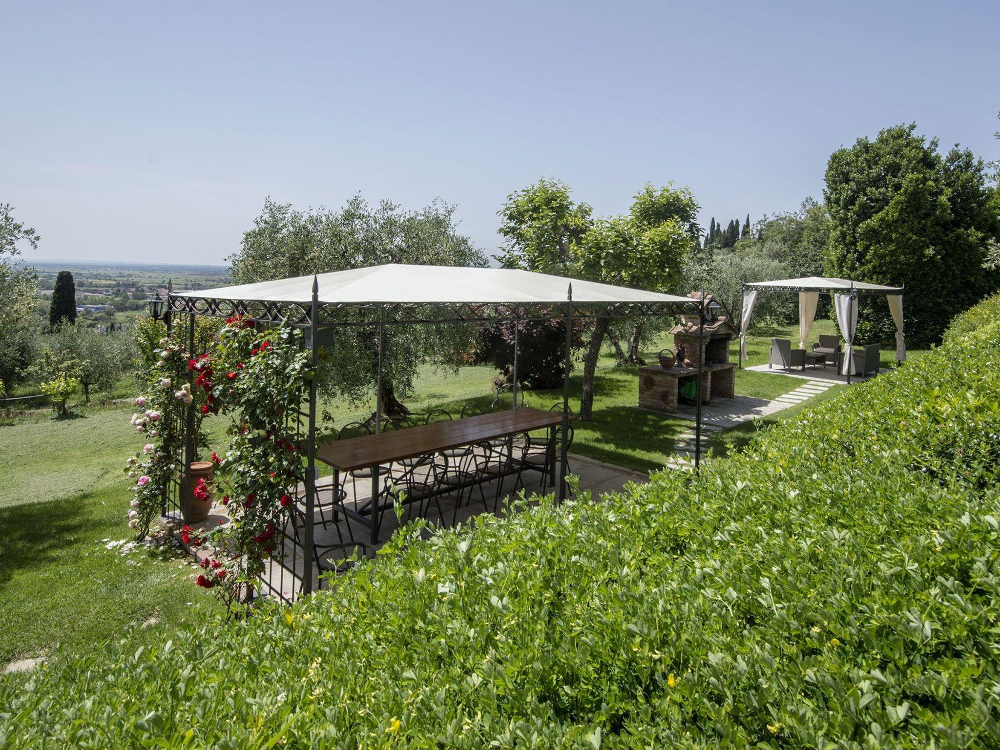 Die Außenanlagen sind großzügig und bis ins Detail gepflegt. Das Grundstück ist komplett eingezäunt, hat einen elektrisch gesicherten Eingang und einen überdachten Parkplatz. Vor der Villa befindet sich eine schöne Pergola, die mit einem großen Tisch und Stühlen ausgestattet ist, ideal für Mahlzeiten im Freien. Neben der Pergola gibt es auch einen schönen gemauerten Grill, sehr praktisch und funktionell. Das Schwimmbad (10 x 5 m, Mindesthöhe 1,20 m - Maximalhöhe 1,80 m, eingezäunt und durch ein Tor geschützt, geöffnet vom 30. April bis 30. September) ist den ganzen Tag der Sonne ausgesetzt und mit Liegestühlen, Sonnenschirmen und einer Außendusche ausgestattet. Vom Pool aus genießt man einen bezaubernden Blick auf die Stadt Cortona und die umliegende Landschaft.