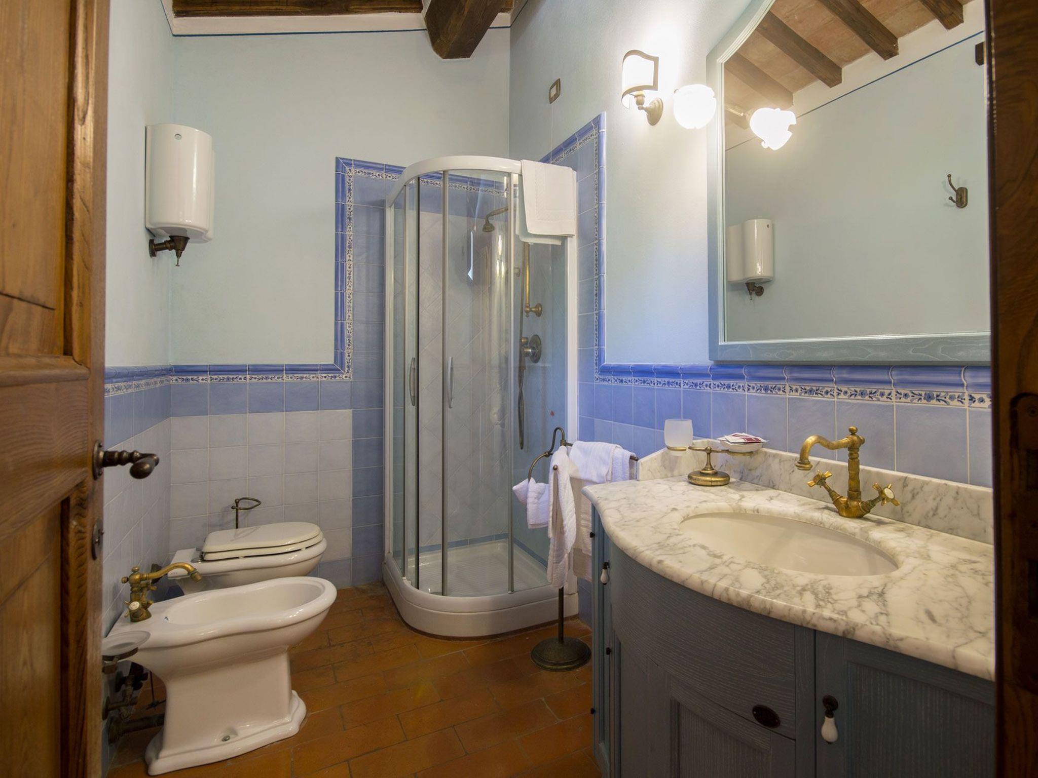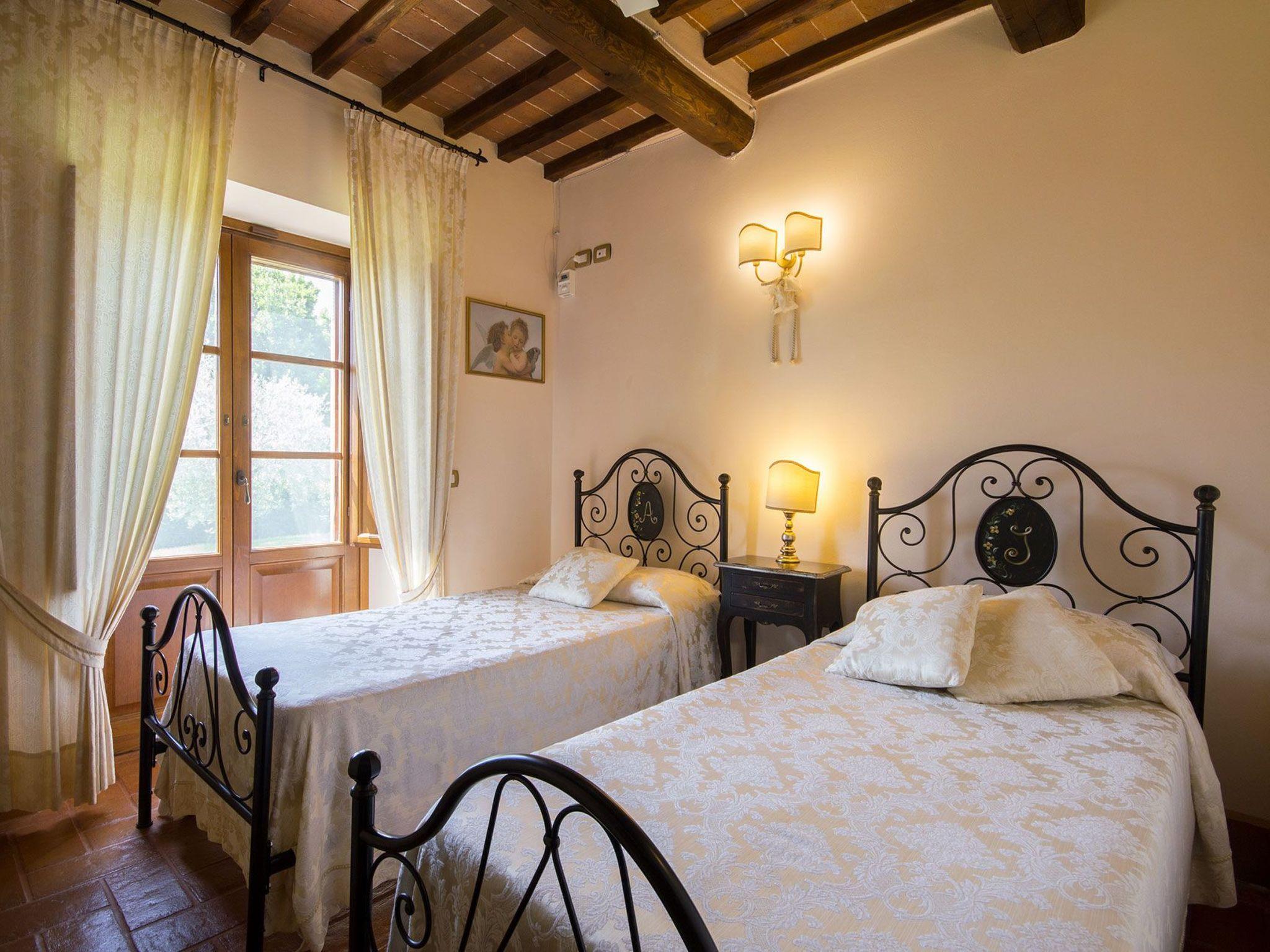 Die Innenräume der Villa Poggio (350 Quadratmeter) sind mit viel Liebe zum Detail eingerichtet, eine wunderbare Mischung aus klassischem toskanischem Stil und modernen Elementen. Jedes Zimmer ist hell und die Einrichtung ist von großer Qualität und Charme. Die schönen Decken mit freiliegenden Holzbalken, Terrakotta- und Parkettböden sind die wahren Highlights dieses Anwesens.