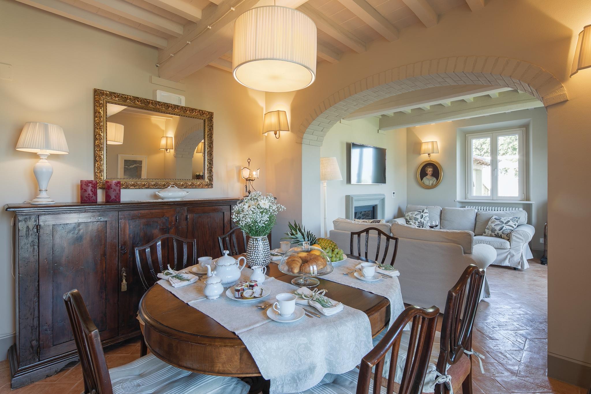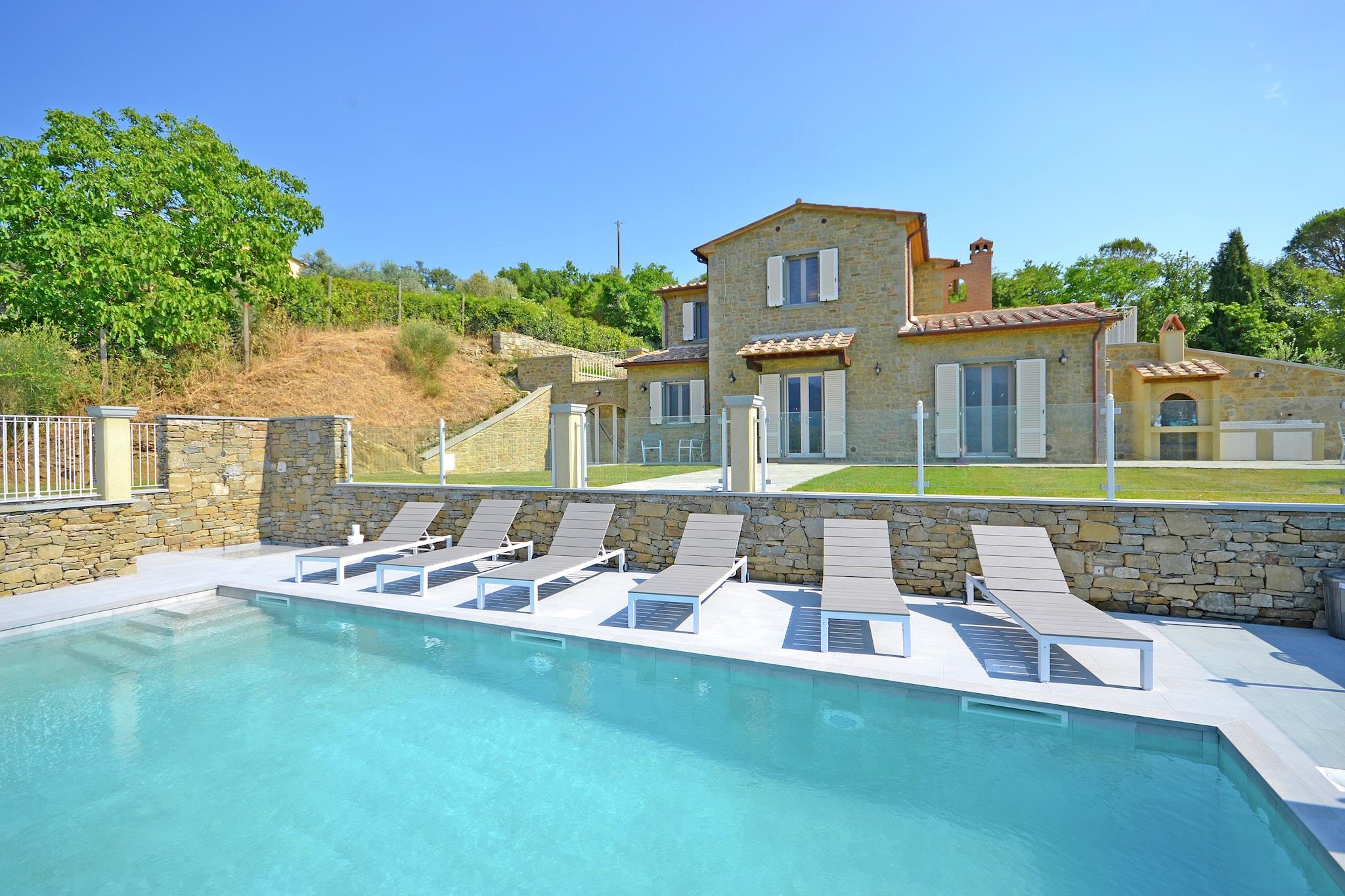 Die Villa Laura ist der ideale Ort, um einen Urlaub in der wunderschönen Landschaft der Toskana zu verbringen. Die Villa befindet sich in den Hügeln in der Nähe der etruskischen Stadt Cortona. Die Villa befindet sich in ruhiger und abgelegener Lage mit atemberaubendem Blick über das Valdichiana-Tal und Cortona. Die Villa wurde komplett renoviert und der Innenraum ist wunderschön, eine Mischung aus antiken Möbeln und modernen Elementen. Wegen der Lage der Villa können Sie schöne Sonnenuntergänge mit einem schönen Glas Wein genießen. Die Villa ist komplett von Olivenbäumen, Weinbergen und Sonnenblumen umgeben. Es gibt einen großen Garten mit Gartenmöbeln, eine Außenküche und einen Grillplatz, ideal für Mahlzeiten im Freien. An der Vorderseite des Hauses befindet sich der Infinity-Pool mit wunderschönem Panorama. Der Pool hat eine Dusche und es gibt Liegen. Sie können über das Tal schauen und sich entspannen. Durch die zentrale Lage erreichen Sie bequem alle berühmten Kunststädte in der Toskana und Umbrien.