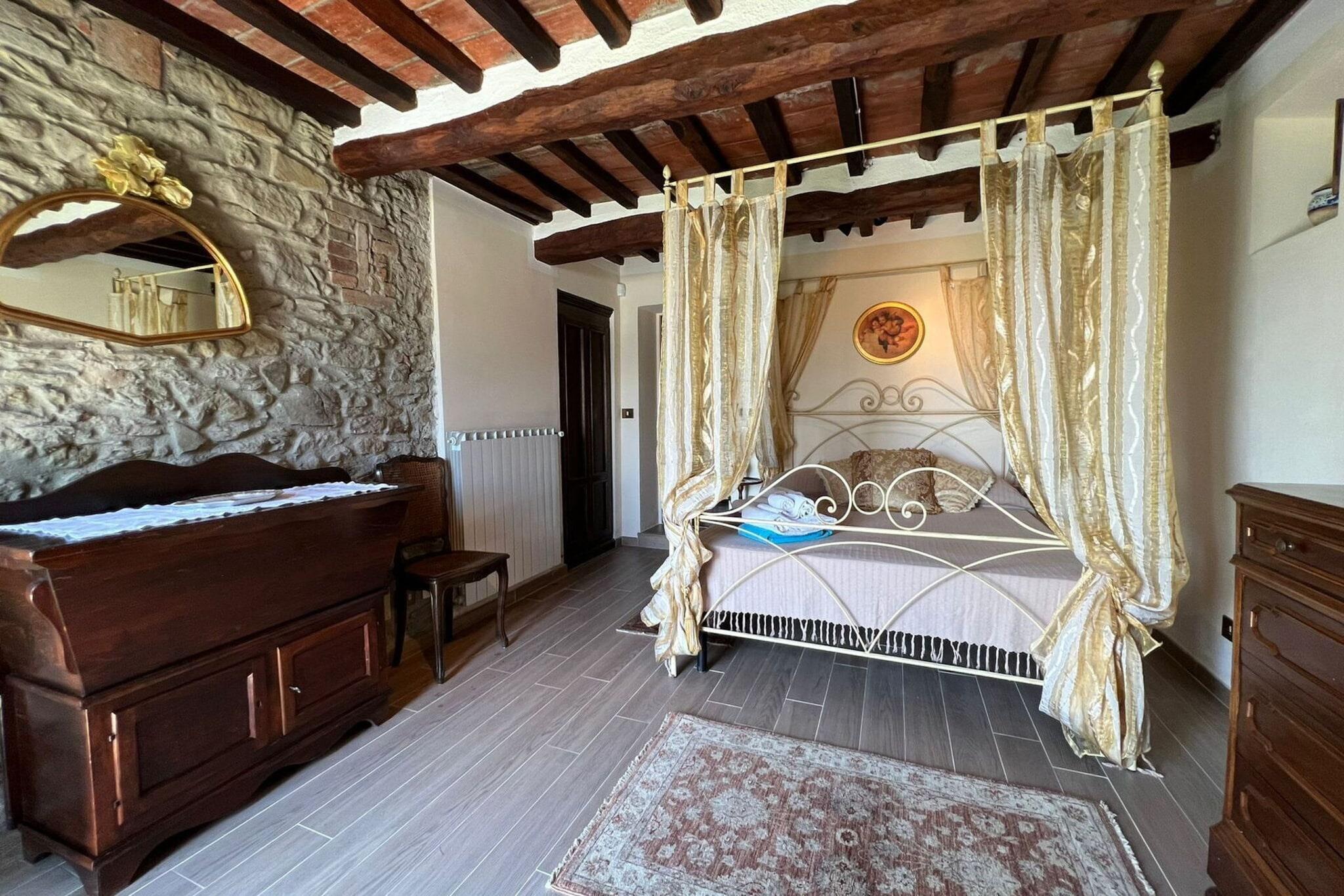 Nur 1,5 km von Cortona entfernt verbindet diese wunderschön restaurierte Villa toskanischen Charme mit modernem Komfort und bietet einen Panoramablick auf die Landschaft. Umgeben von einem 5000 m² großen, eingezäunten Garten bietet sie einen privaten Pool (4 x 8 m, geöffnet von Mai bis September), einen Whirlpool im oberen Stockwerk unter Olivenbäumen und mehrere Terrassen, die zum Essen oder Entspannen einladen. Der Garten verfügt über Sonnenliegen, einen schattigen Pavillon und gepflasterte Bereiche mit Grill und Sitzgelegenheiten im Freien. Die Villa erstreckt sich über drei Ebenen und bietet Platz für bis zu 12 Gäste in fünf klimatisierten Schlafzimmern. Das Erdgeschoss verfügt über ein gemütliches Wohnzimmer mit Kamin, eine gut ausgestattete Küche, ein Doppelzimmer, ein Badezimmer und ein zweites Schlafzimmer mit einem Doppelbett. Im Obergeschoss befindet sich ein Familienzimmer mit einem Doppel- und zwei Einzelbetten sowie ein Badezimmer. Das Untergeschoss umfasst einen zweiten Wohn-/Küchenbereich, ein Schlafzimmer mit einem Doppel- und einem Einzelbett, ein weiteres Doppelzimmer mit eigenem Bad und Zugang zum Garten. Zu den weiteren Annehmlichkeiten gehören Moskitonetze, WLAN (drinnen/draußen), Sat-TV, ein Essbereich im Freien, Parkplätze und ein Wäschebereich. Haustiere sind gegen Aufpreis willkommen. Die Villa ist ideal für Familien oder Gruppen und bietet eine gute Anbindung an Cortona, den Trasimenischen See, Montepulciano und weitere Orte.
