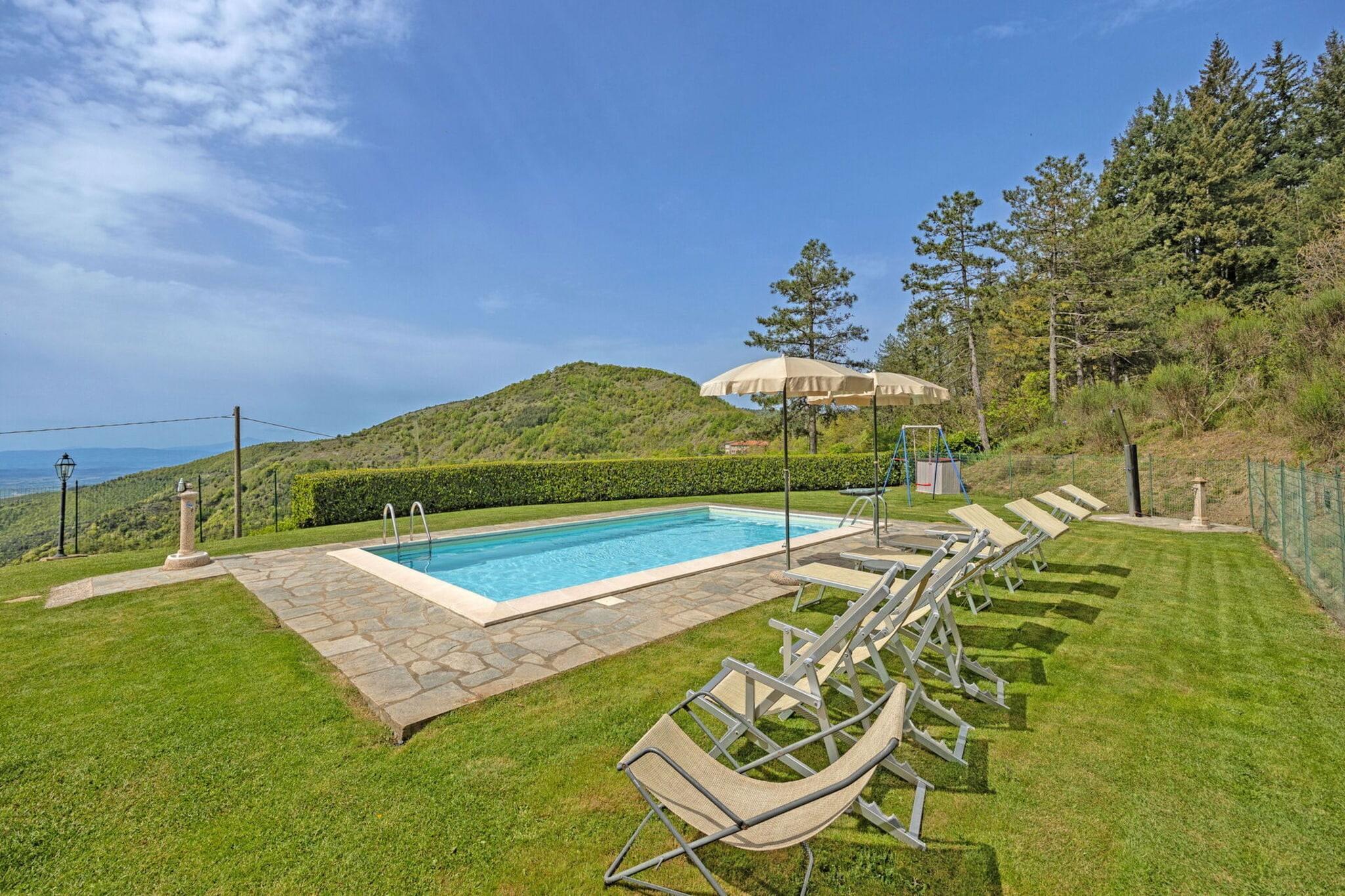 Nur 7 km von der bezaubernden Etruskerstadt Cortona entfernt, bietet diese reizende Villa einen ruhigen Rückzugsort inmitten der sanften Hügel der Toskana. Das Anwesen ist ideal für Paare oder kleine Familien, die einen erholsamen Rückzugsort oder einen Ausgangspunkt zur Erkundung der kulturellen Schätze der Toskana und Umbriens suchen. Der Außenbereich ist mit Pavillon, Grill und Esstisch ausgestattet und lädt zum Essen im Freien ein. Das Highlight des Anwesens ist der komplett eingezäunte private Pool (8 x 4 m, 140 cm tief), der perfekt der Sonne ausgesetzt ist und durch eine Außendusche, Sonnenliegen, Sonnenschirme und einen zweiten schattigen Pavillon für Komfort tagsüber oder mondhelle Abende ergänzt wird. Ein kleiner Kinderspielplatz bietet jungen Gästen einen sicheren und spielerischen Ort zum Toben. Die ebenerdige Villa verfügt über ein gemütliches Wohnzimmer mit Fernseher, Stereoanlage, Essbereich, Sofa und Sesseln. Angrenzend befindet sich eine voll ausgestattete Küche mit allem, was Sie zum Zubereiten von Mahlzeiten benötigen. Der Schlafbereich umfasst ein Doppelzimmer und ein Zweibettzimmer, jeweils mit eigenem Bad mit Dusche. Annehmlichkeiten wie kostenloses WLAN, Klimaanlage, Moskitonetze und ein privater Parkplatz sorgen für einen komfortablen Aufenthalt. Haustiere sind auf Anfrage willkommen, was diese Villa zu einer idealen Wahl für einen erholsamen Urlaub in der Nähe von Cortona macht.