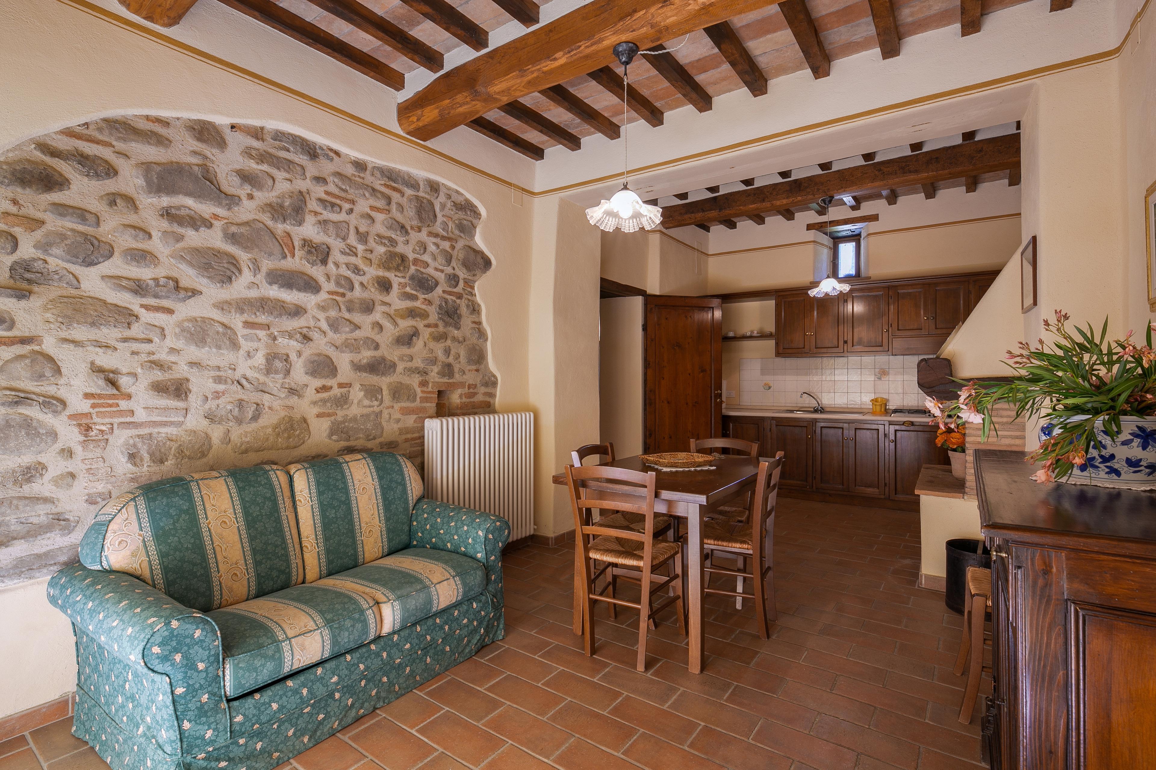 Die Innenräume der Villa il Gelso sind im toskanischen Stil gehalten: Terrakottaböden und freiliegende Holzbalken charakterisieren die Umgebung und geben uns einen Einblick in die toskanische Architektur. Die Villa ist groß (etwa 400 Quadratmeter insgesamt) und auf zwei Ebenen durch eine Außentreppe verbunden unterteilt. Sie kann bequem 16 Personen beherbergen und verfügt über Hochstühle und Kinderbetten (auch auf Anfrage). Ursprünglich in Appartements aufgeteilt, wird die Villa il Gelso heute als exklusiver Wohnblock vermietet, behält aber eine Unterteilung bei, die es sowohl Familien als auch Freundesgruppen ermöglicht, einen gemeinsamen Aufenthalt zu verbringen und gleichzeitig den verschiedenen Gruppen ihre Unabhängigkeit zu lassen. Sie verfügt über 8 Schlafzimmer und 8 Bäder und eine große, voll ausgestattete Küche im Erdgeschoss mit Wohnzimmer, das zum Treffpunkt der ganzen Gruppe im Namen der Geselligkeit wird.