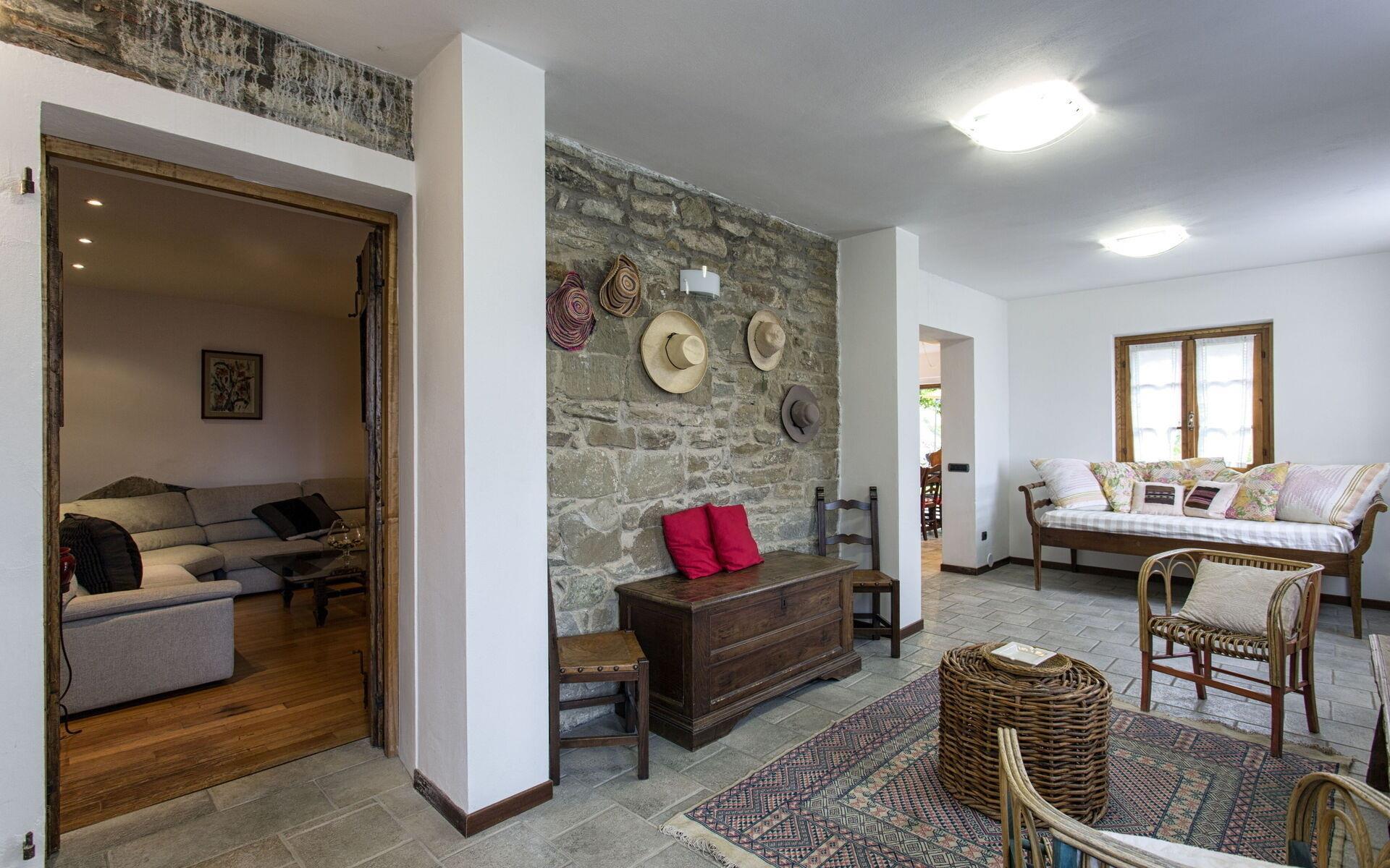 Wenn Sie die Treppe in den ersten Stock hinaufgehen, finden Sie ein großes Wohnzimmer mit Kamin und Zugang zur Außenterrasse mit Blick auf das Tal, die mit Tischen ausgestattet ist. Im Wohnzimmer gibt es auch ein Schlafsofa (auf Anfrage).