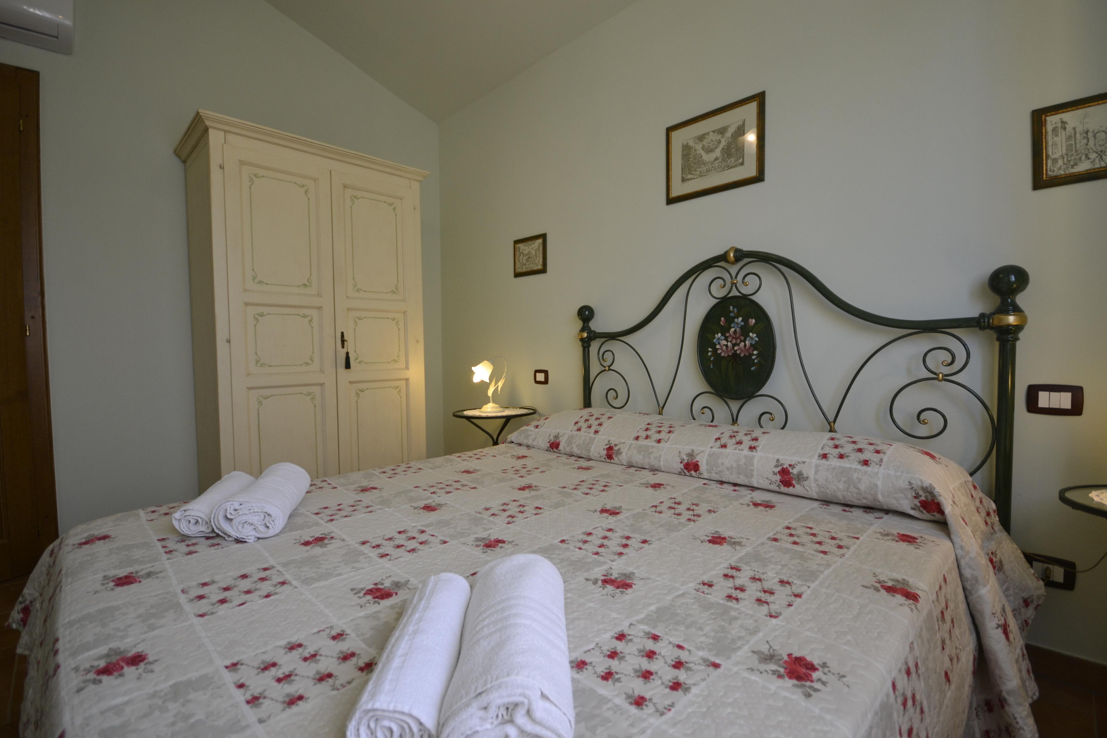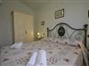 Über eine Treppe gelangt man zu den beiden anderen Schlafzimmern: das erste mit zwei Einzelbetten und direktem Zugang zum Gartenteil, in dem sich der Swimmingpool befindet, und das zweite mit einem Doppelbett.