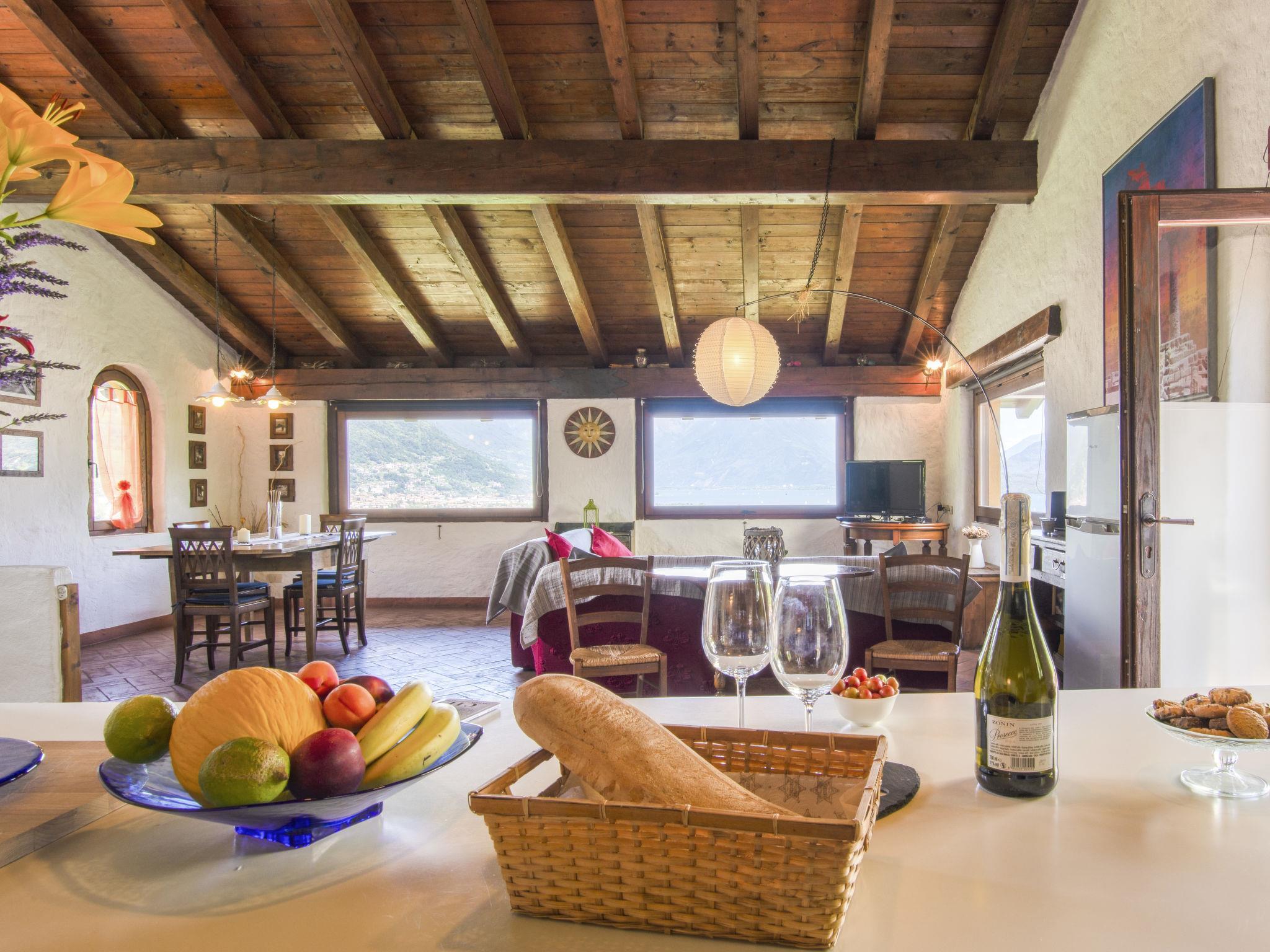 3-Zimmer-Haus 140 m2 auf 2 Stockwerken. Geschmackvoll und gemütlich eingerichtet: 1 Zimmer mit begehbarem Kleiderschrank mit 1 Doppelbett (160 cm). Ausgang zum Garten. 1 Zimmer mit 2 Betten und 1 Schlafmöglichkeit. Bad/Dusche/WC. Obergeschoss: grosses Wohn-/Esszimmer mit Panoramafenster mit Esstisch und TV (Flachbildschirm). Ausgang zur Terrasse. Offene Küche (Backofen, Geschirrspüler, 4 Flammen, Toaster, Wasserkocher, Mikrowelle, elektrische Kaffeemaschine). Ausgang zur Terrasse. G-Heizung (extra). Kleine Terrasse überdacht, 2 grosse Terrassen, Westlage. Terrassenmöbel, Gartengrill, Liegestühle (5). Panoramasicht auf den See. Zur Verfügung: Waschmaschine, Bügeleisen, Kinderhochstuhl, Babybett. Internet (WLAN, gratis). Bitte beachten: geeignet für Familien. Nichtraucher-Unterkunft. Maximal 1 Haustier/Hund erlaubt. IT013090C2UGWRMYHT