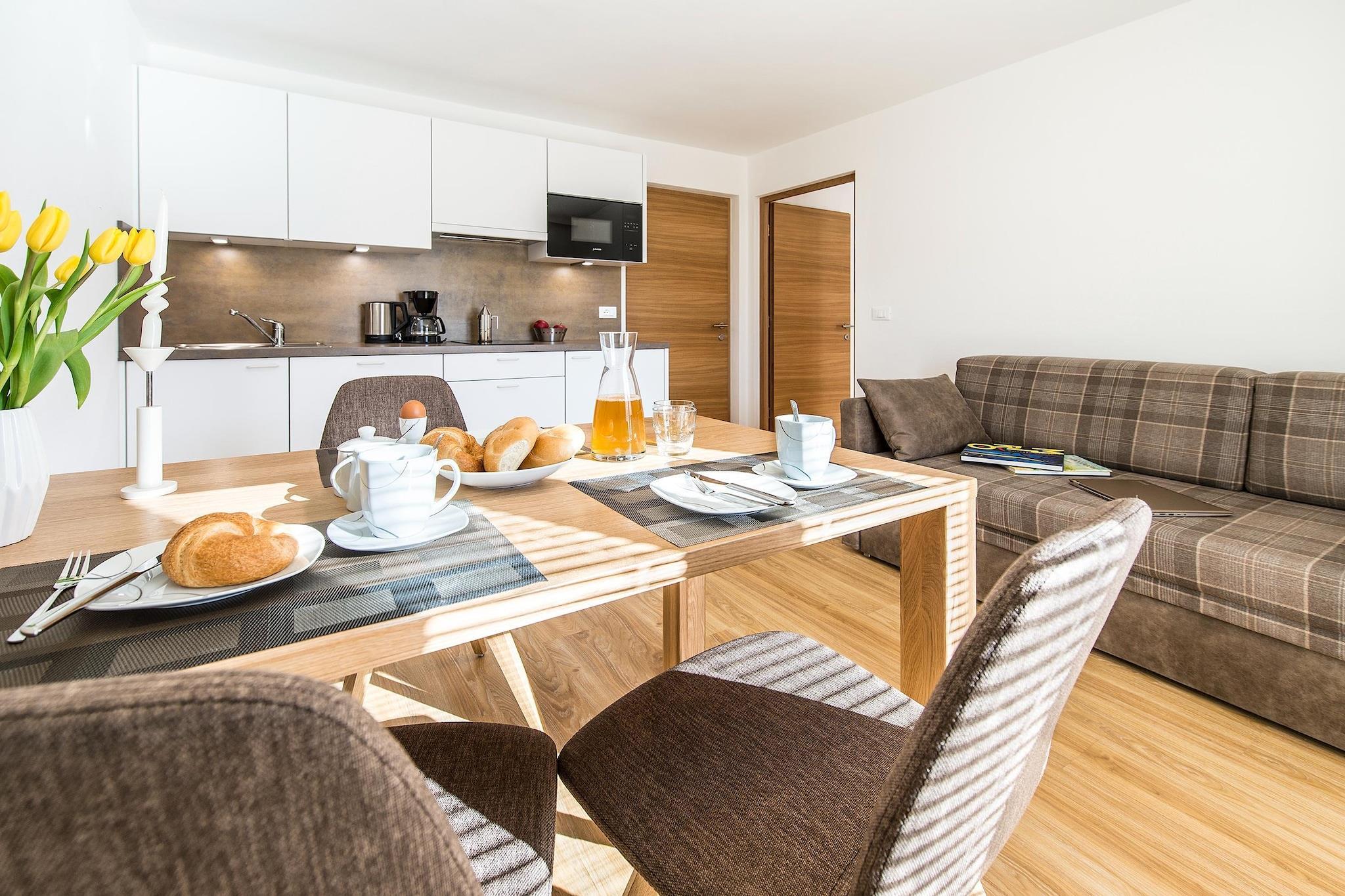 Von außen typisch südtiroler Alpenstil, doch innen werden Sie die neu renovierten Appartements überraschen: Großzügige Räume und eine mit Liebe zum Detail gestaltete Einrichtung tragen zu einer besonderen Wohlfühlatmosphäre bei. Dazu können Sie einen atemberaubenden Ausblick von Ihrem Balkon genießen. Das Appartement ist ideal für 2 Erwachsene und 2 Kinder. Dank der idealen Lage sind hier Erholung, Sightseeing, Kultur und sportliche Aktivitäten bestens miteinander kombinierbar. An sonnigen und warmen Tagen können Sie sich im nahe gelegenen Freibad "Wasserpark Dorf Tirol" abkühlen. Dorf Tirol ist umgeben von Obstwiesen und Weingärten, klimatisch mit rund 300 Sonnentagen im Jahr überaus verwöhnt und kulturell und historisch von großer Bedeutung - gab doch Schloss Tirol, das bedeutendste Schloss der Region, dem ganzen Land den Namen. Highlights: *freier Eintritt ins nahegelegene Schwimmbad *Südtirol Guest Pass: mit diesem Ticket können alle öffentlichen Verkehrsmittel in Südtirol bequem und flexibel genutzt und zum Teil noch weitere Angebote in Anspruch genommen werden. Nordwestlich von Dorf Tirol, liegen auf einer Höhe von rund 2.500 Metern die zehn Spronser Seen, die größte hochalpine Seenplatte. Diese zauberhaften Bergseen bilden eine der schönsten und bedeutendsten Seengruppen Südtirols, die mit einer Rundwanderung erkundet werden können. Ein Wanderweg liegt direkt vor der Tür: In nur fünf Gehminuten ist der Tirolersteig zu erreichen. Dieser führt direkt durch den Wald zum Tappeinerweg. Von hier aus können Sie nach weiteren 20 Minuten weiter ins Stadtzentrum von Meran gelangen. Nur fünf Minuten entfernt befindet sich ein öffentliches Freibad. Von Mai bis September erhalten Sie hierfür einen Eintritt gratis.
