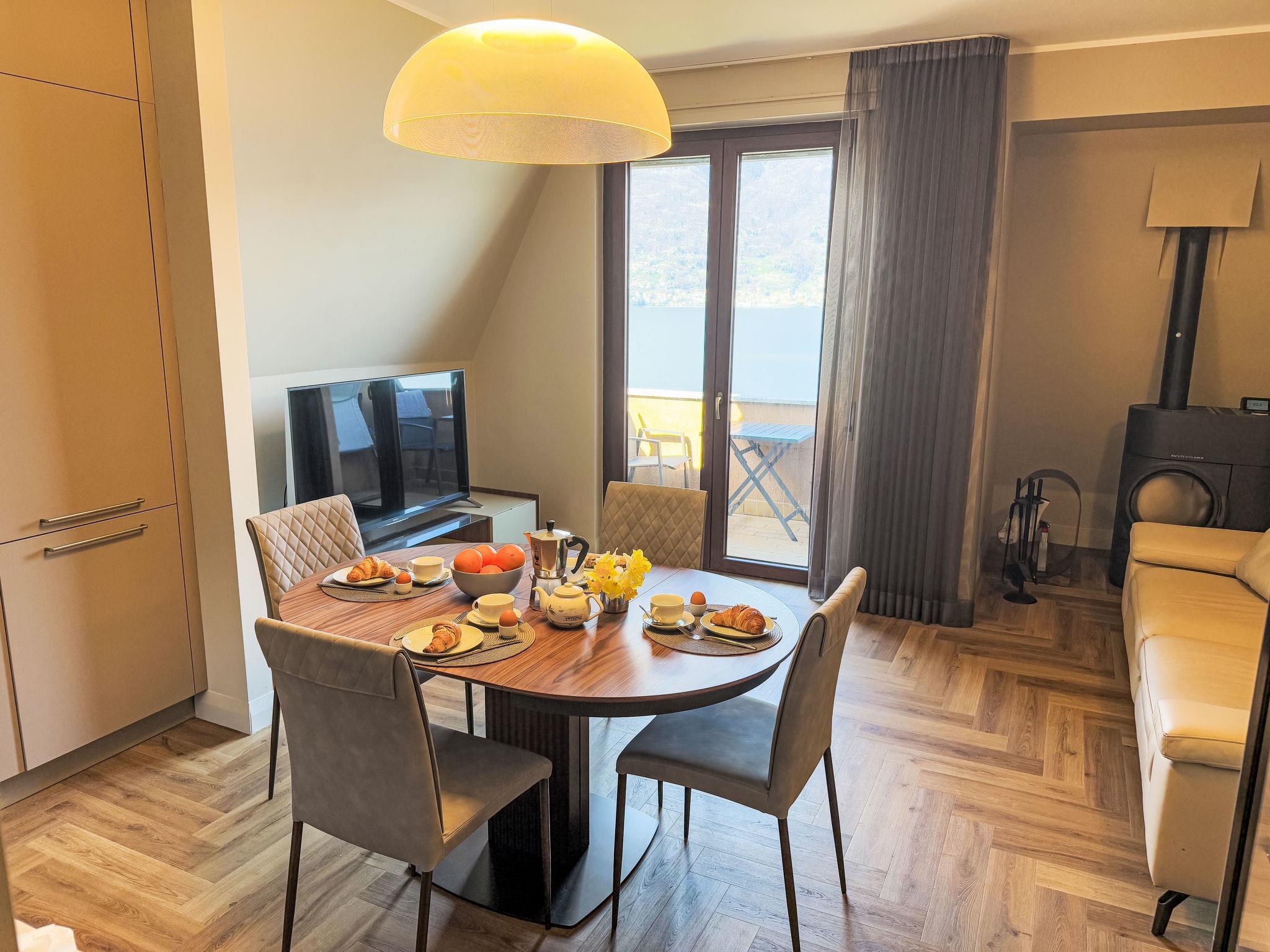 "Vento Errante", 3-Zimmer-Wohnung 70 m2 im 3. Stock. Vollständig renoviert im Jahre 2025, modern und geschmackvoll eingerichtet: Wohn-/Esszimmer mit Esstisch, TV und Heizofen. Ausgang zum Balkon. 1 Zimmer mit 1 Doppeldiwanbett. Ausgang zum Balkon. 1 Doppelzimmer mit Klimaanlage. Ausgang zum Balkon. Küche (Backofen, Geschirrspüler, 4 Induktionskochplatten, Wasserkocher, Tiefkühler, elektrische Kaffeemaschine). Ausgang zum Balkon. Dusche/Bidet/WC. Klimaanlage. Balkon 4 m2, 2 kleine Balkone. Balkonmöbel. Herrliche Panoramasicht auf den See, die Berge und die Landschaft. Zur Verfügung: Haartrockner. Internet (WLAN, gratis). Parkplatz, Garage (1 Auto) beim Haus. Bitte beachten: Nichtraucher-Unterkunft. Feuerlöscher. IT097032C2YM73SKY2