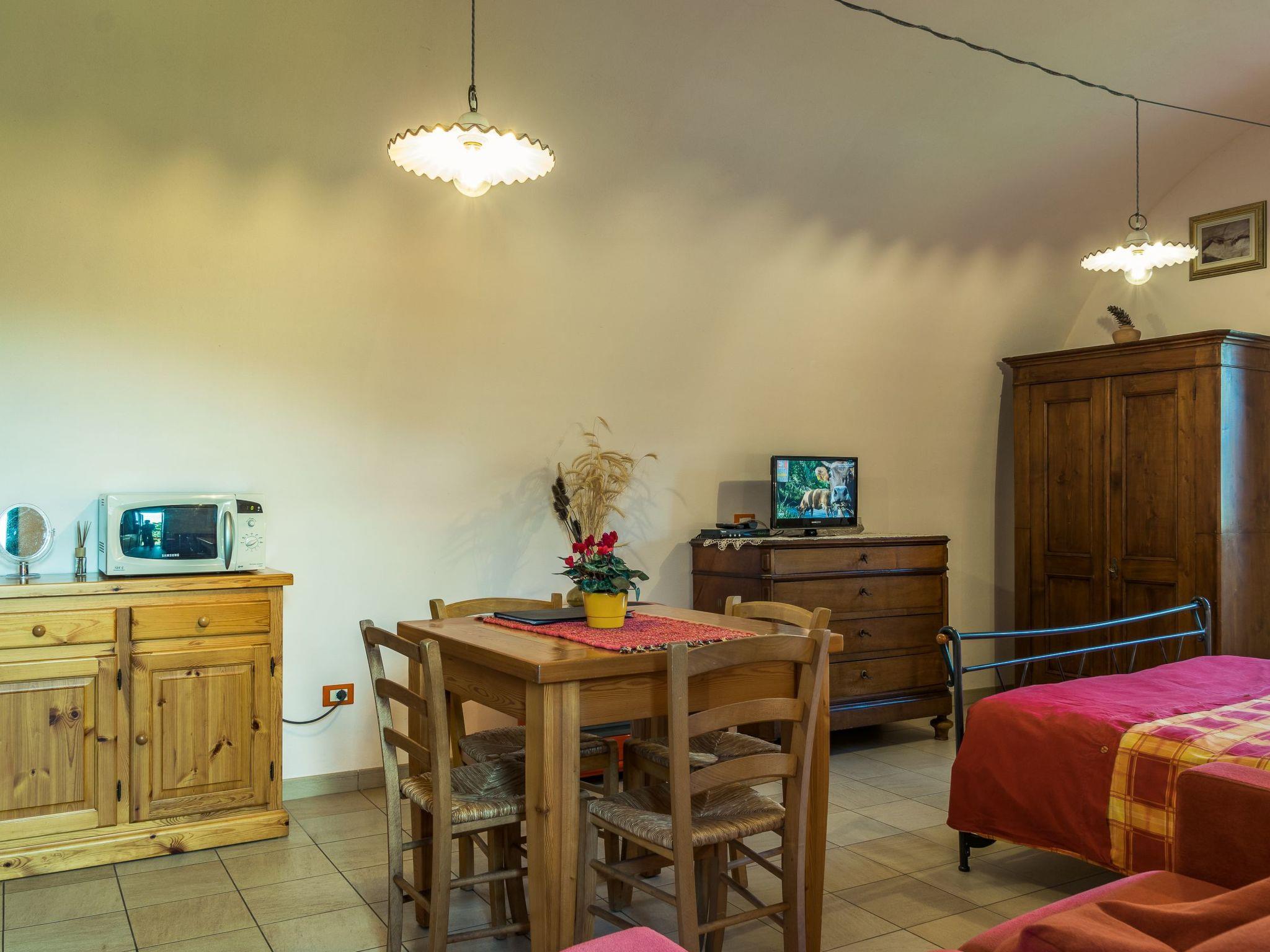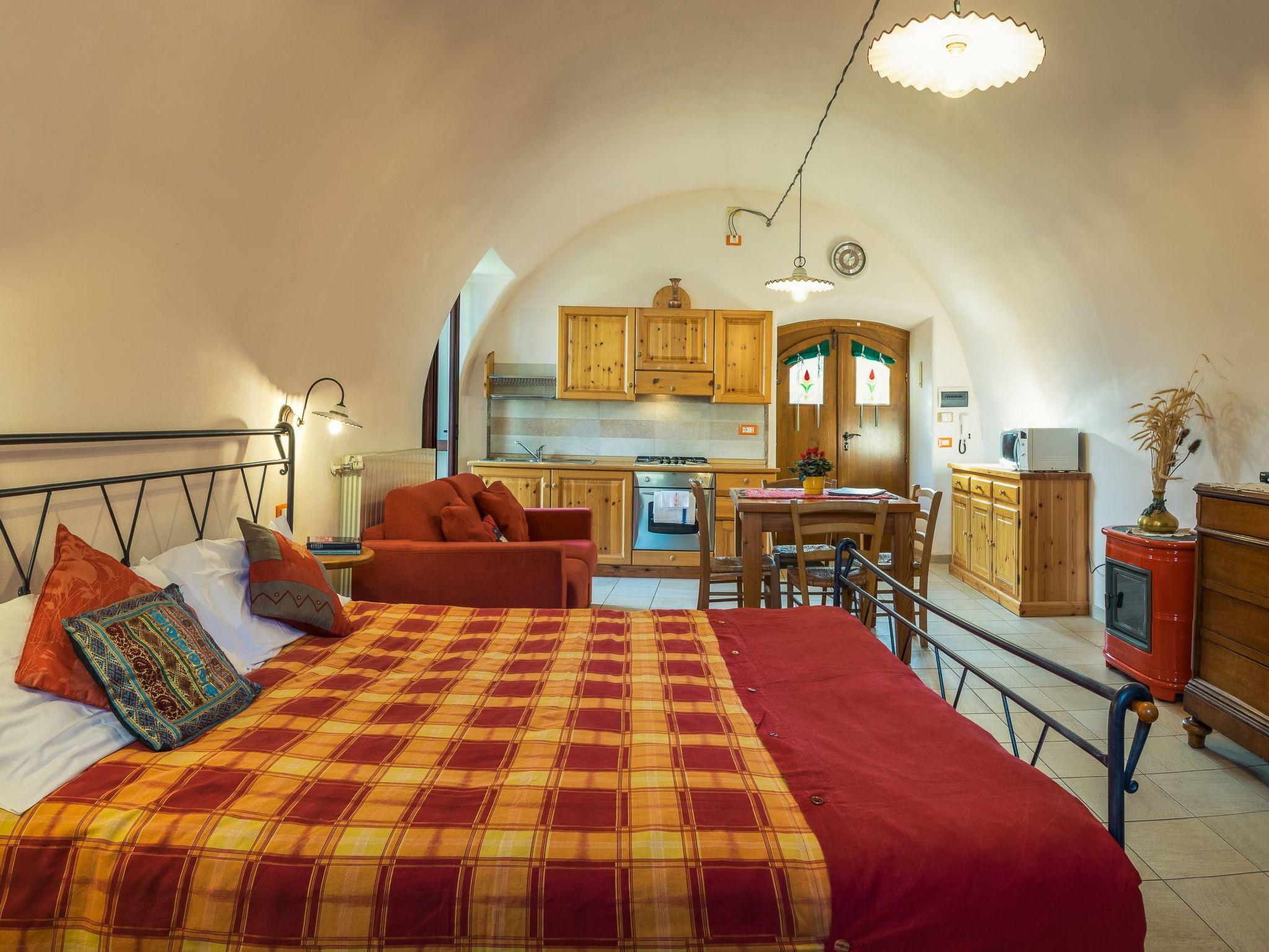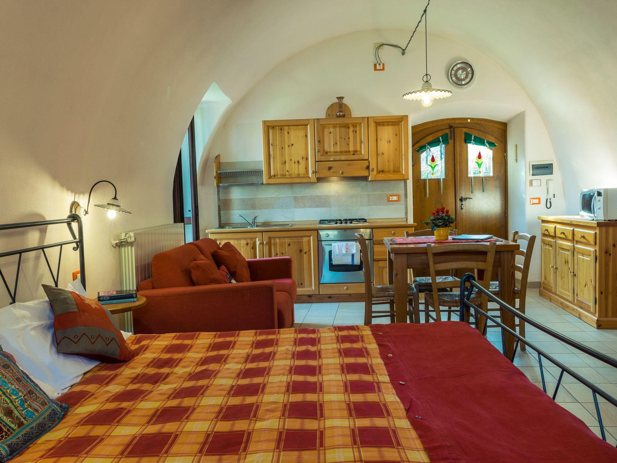 Die gewölbte Decke und die Massivholzmöbel verleihen ihm eine gemütliche mittelalterliche Atmosphäre. Die große Küche ist mit einer Mikrowelle, einem Gasherd, einem Backofen und einem Kühlschrank mit Gefrierfach ausgestattet. Die Wohnung verfügt über einen Esstisch, ein Schlafsofa für eine Person und Sat-Smart-TV, ein Doppelbett (160 x 190 cm) und einen Kleiderschrank. Das Badezimmer liegt außen und grenzt an das Wohn- und Schlafzimmer an und verfügt über einen eigenen Außeneingang. Es verfügt über eine Dusche und eine Waschmaschine. Das Studio-Apartment ist mit einer unabhängigen Heizungsanlage ausgestattet.