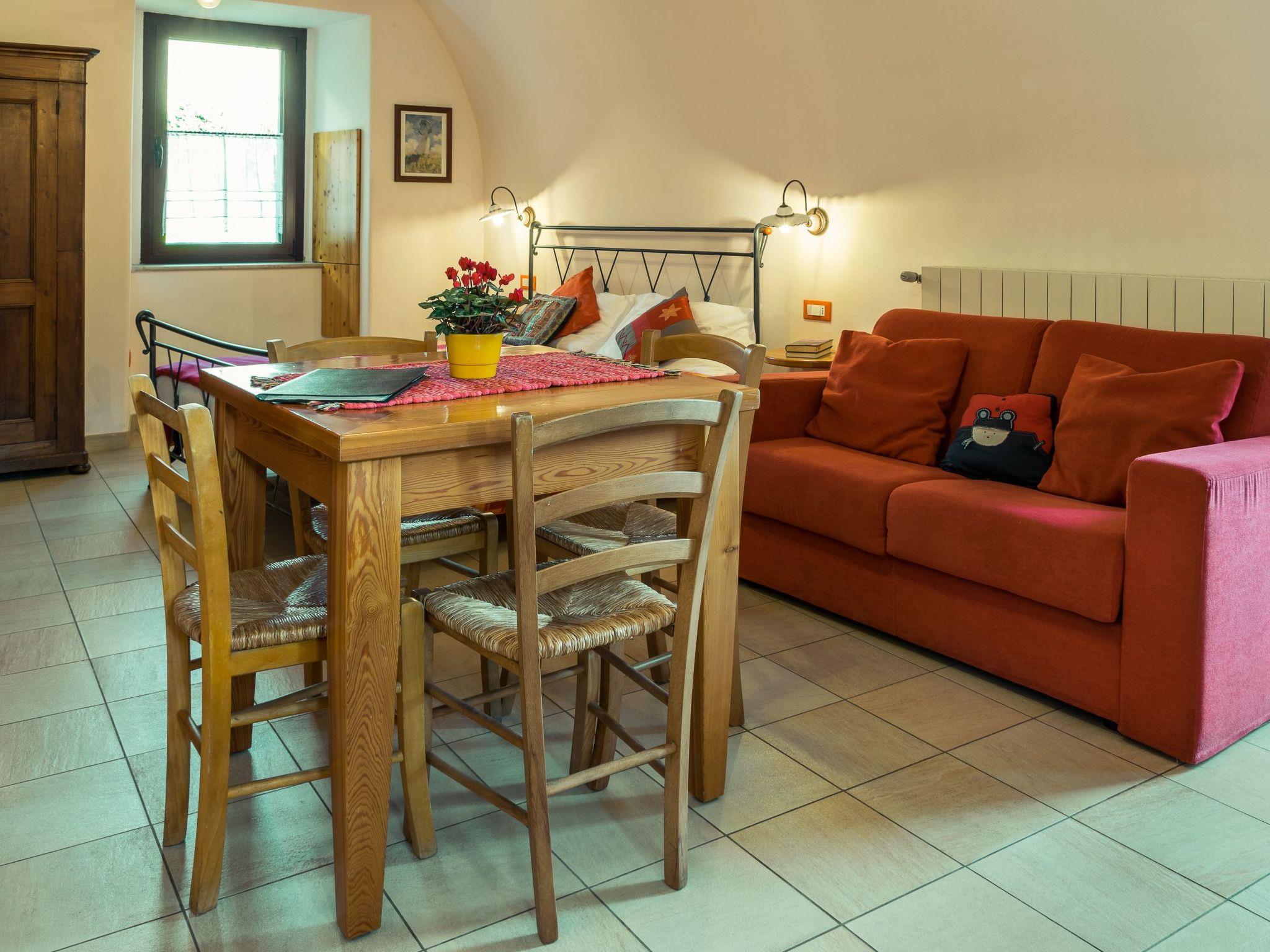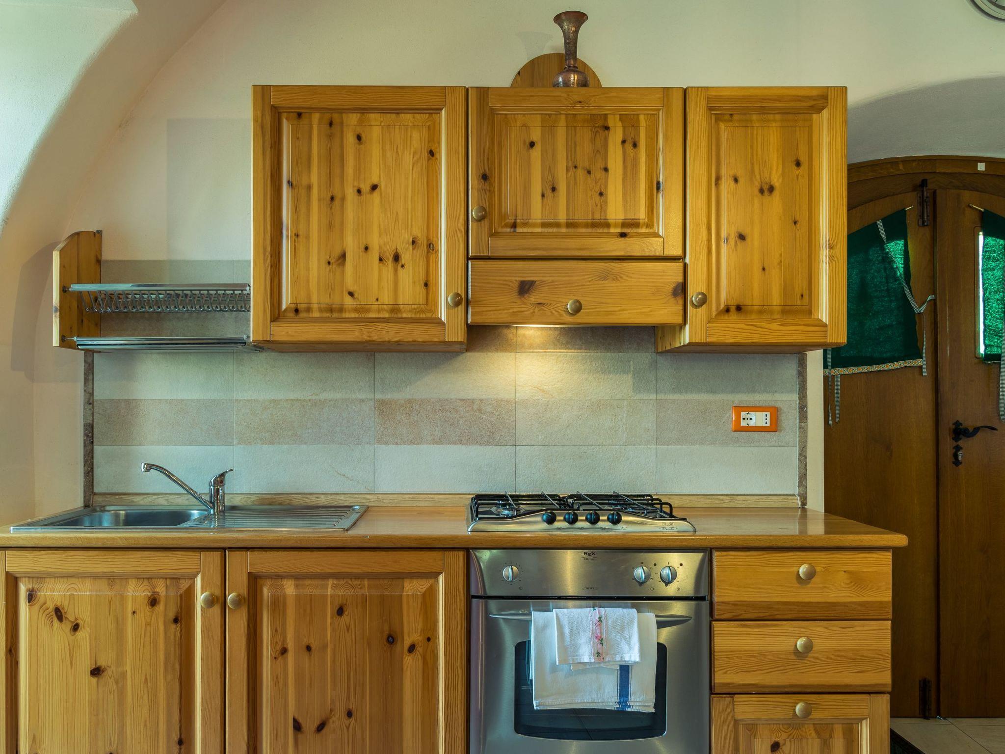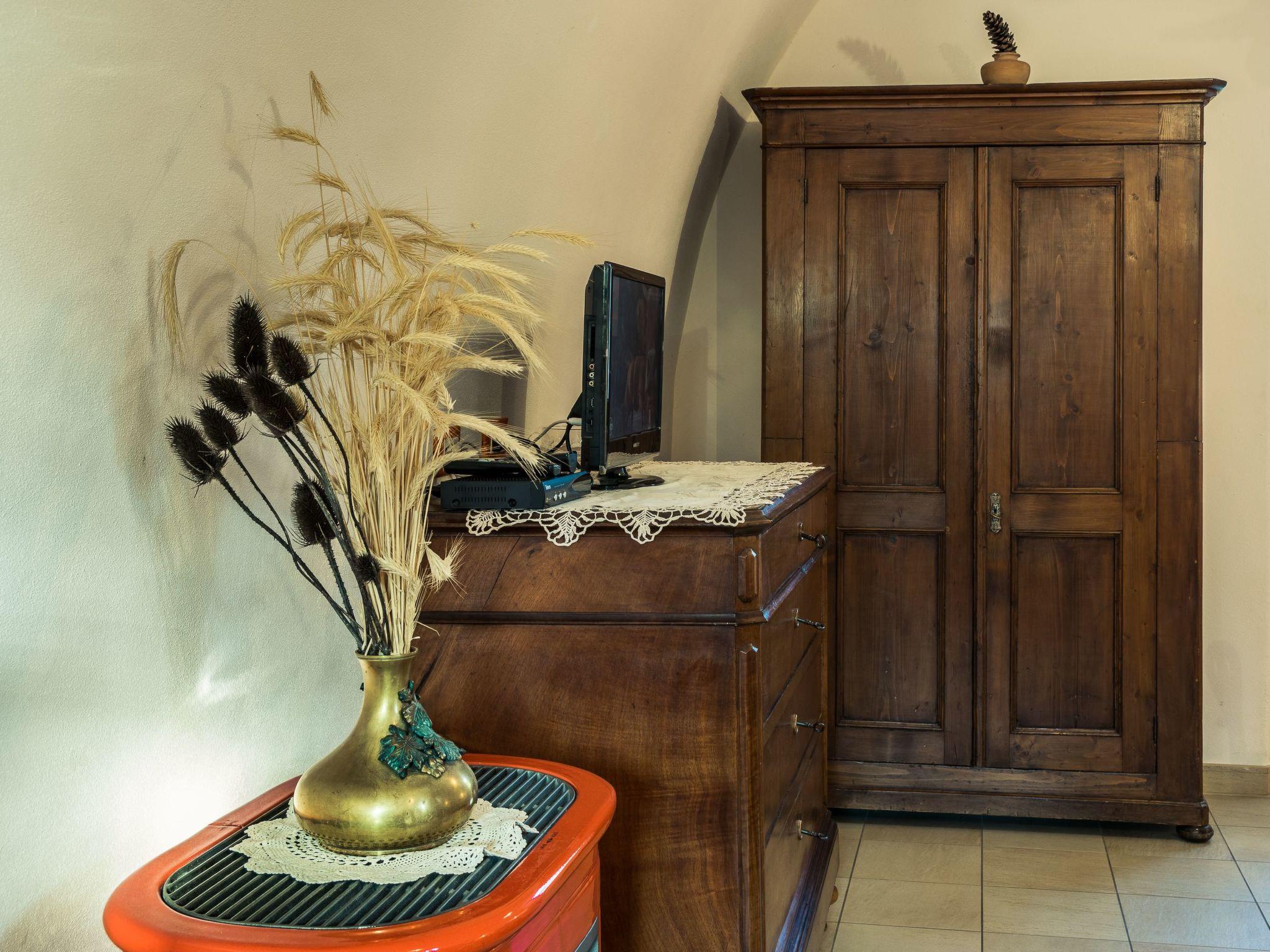 Die gewölbte Decke und die Massivholzmöbel verleihen ihm eine gemütliche mittelalterliche Atmosphäre. Die große Küche ist mit einer Mikrowelle, einem Gasherd, einem Backofen und einem Kühlschrank mit Gefrierfach ausgestattet. Die Wohnung verfügt über einen Esstisch, ein Schlafsofa für eine Person und Sat-Smart-TV, ein Doppelbett (160 x 190 cm) und einen Kleiderschrank. Das Badezimmer liegt außen und grenzt an das Wohn- und Schlafzimmer an und verfügt über einen eigenen Außeneingang. Es verfügt über eine Dusche und eine Waschmaschine. Das Studio-Apartment ist mit einer unabhängigen Heizungsanlage ausgestattet.