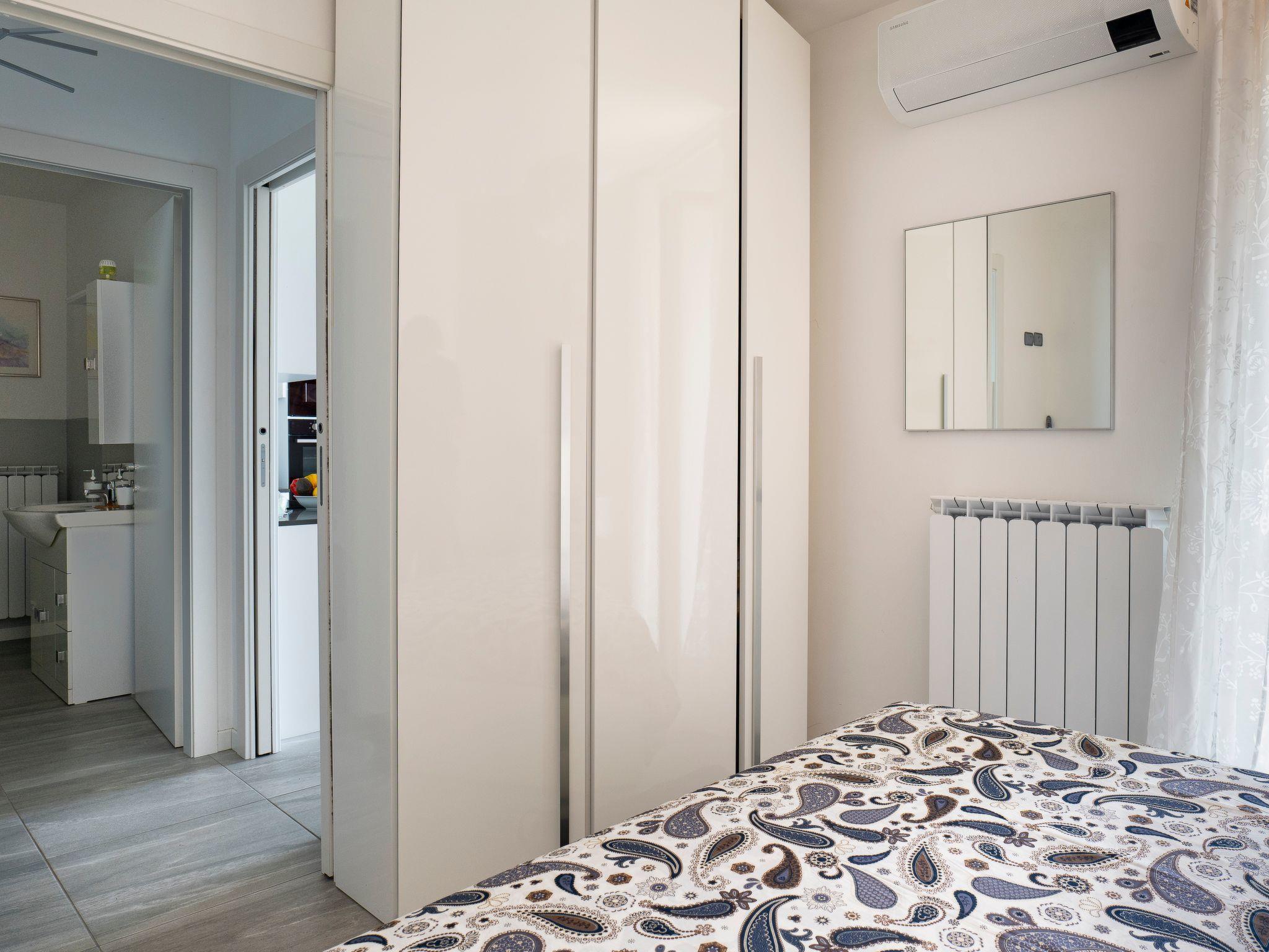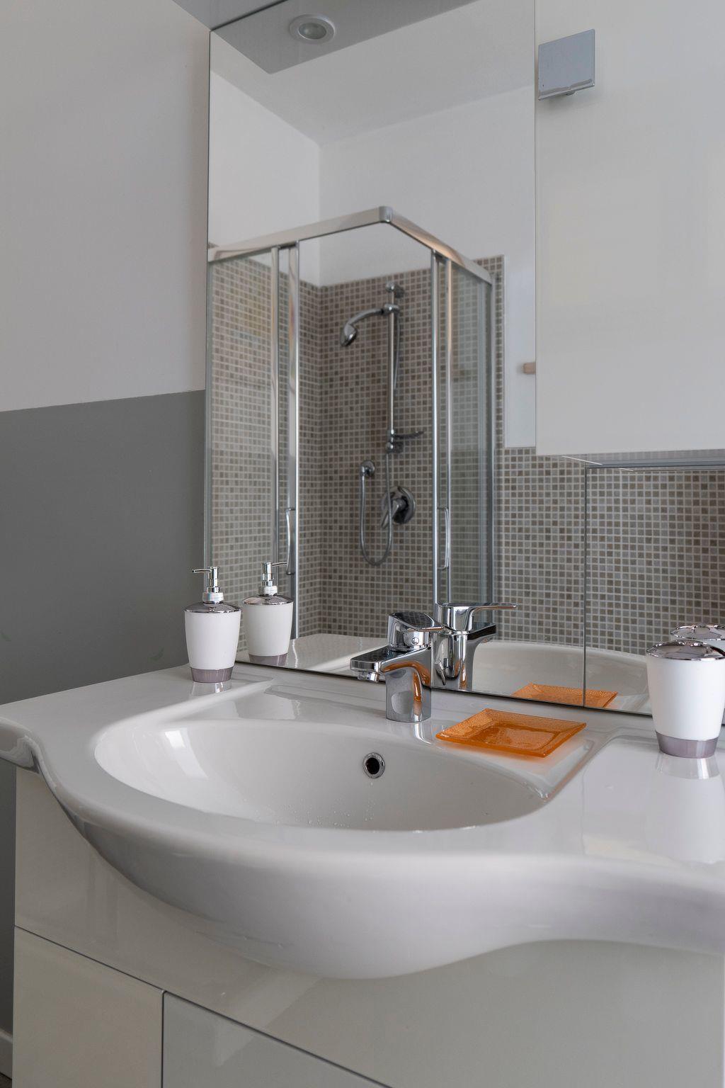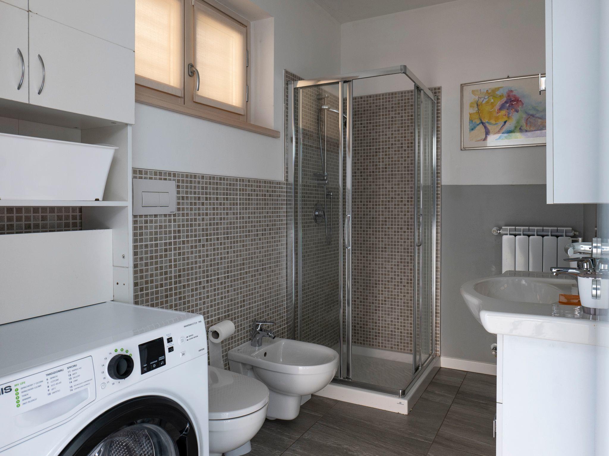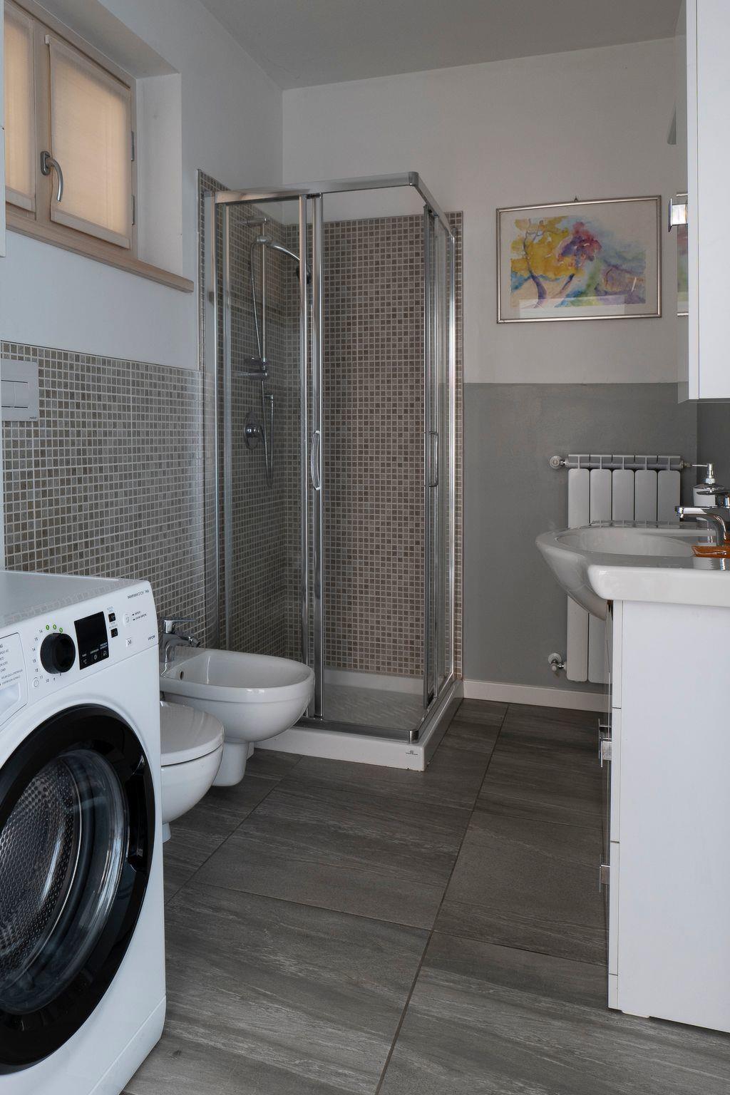 Das Badezimmer ist groß und komplett: Neben den wandhängenden Armaturen - Waschbecken, Toilette und Bidet - gibt es eine Duschkabine und eine Waschmaschine. Das Schlafzimmer ist ein gemütliches und erholsames Zimmer: es ist dank der Fenstertür mit Blick auf die Terrasse auch sehr hell und verfügt über ein Doppelbett und deckenhohe Schränke. Die Split-Klimaanlage ist auch hier vorhanden. Der Bodenbelag der gesamten Wohnung besteht aus großen Platten aus Feinsteinzeug in den typischen melierten Farben des Travertins. Lights on the Lake ist mit W-Lan ausgestattet.