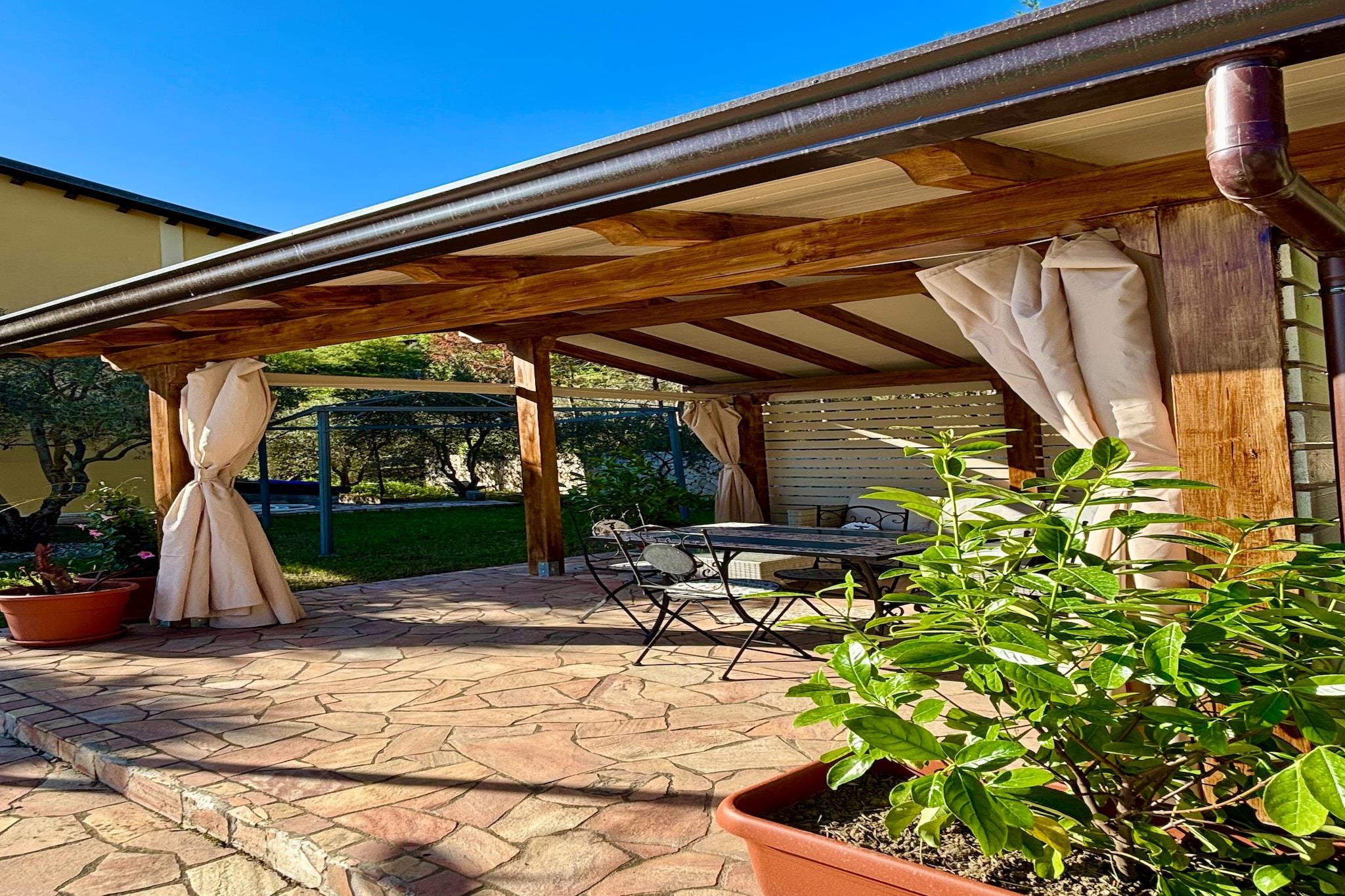 Parterre: (Wohnzimmer(TV, Kaminofen, Sitzecke, Klimaanlage), Badezimmer(Dusche, Waschbecken, Toilette)) In der 1. Etage: (Schlafzimmer(Doppelbett), Schlafzimmer(Einzelbett, Einzelbett), Badezimmer(Badewanne, Waschbecken, Toilette, Bidet)) Souterrain: (Wohnküche(Esstisch, Wasserkocher, Toaster, Kochherd(5 Kochplatten, Gas), Dunstabzugshaube, Kaffeemaschine, Backofen, Mikrowelle, Kühl-/Gefrierkombination)) Dusche, Terrasse(überdacht), Garten, Gartenmöbel, Grill, Parkplatz, Liegestühle, Sonnenschirm, Pool(alleinige Nutzung, im Garten, geöffnet von 1/2 Apr bis einschließlich Okt)