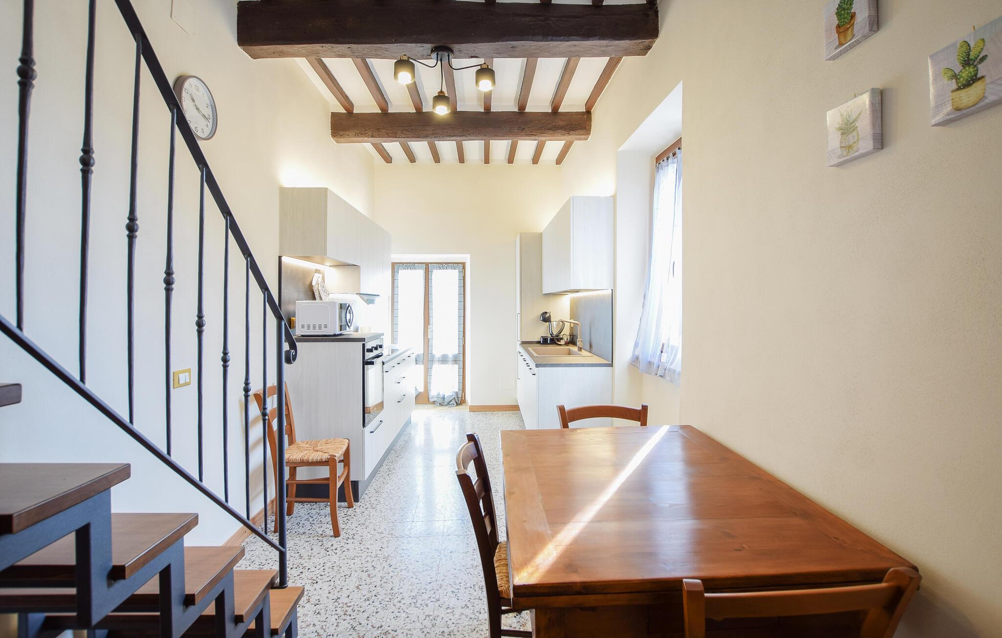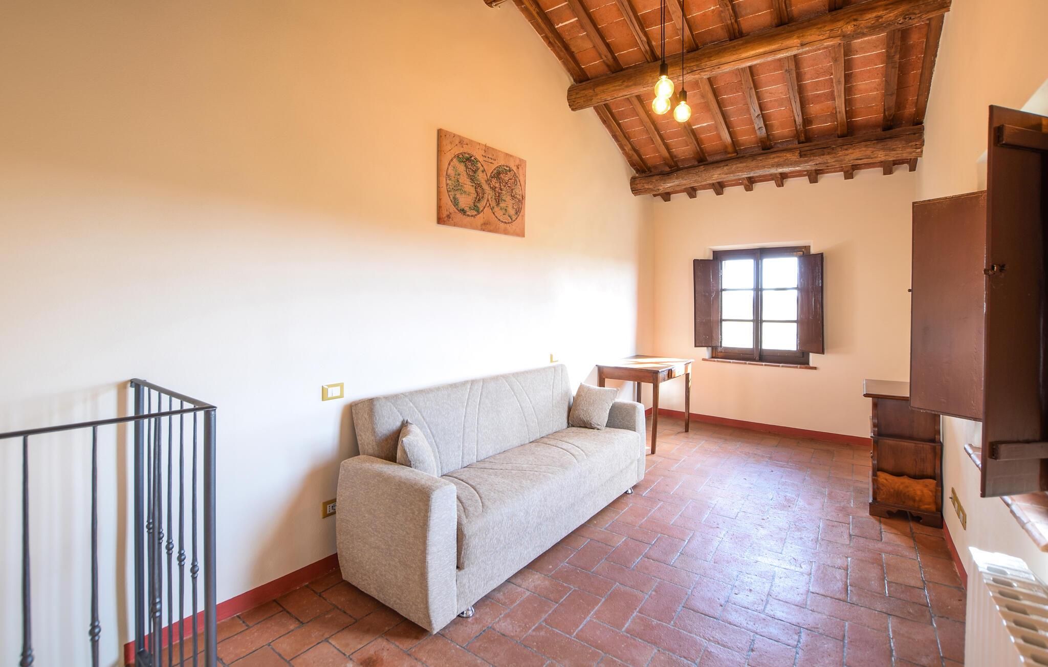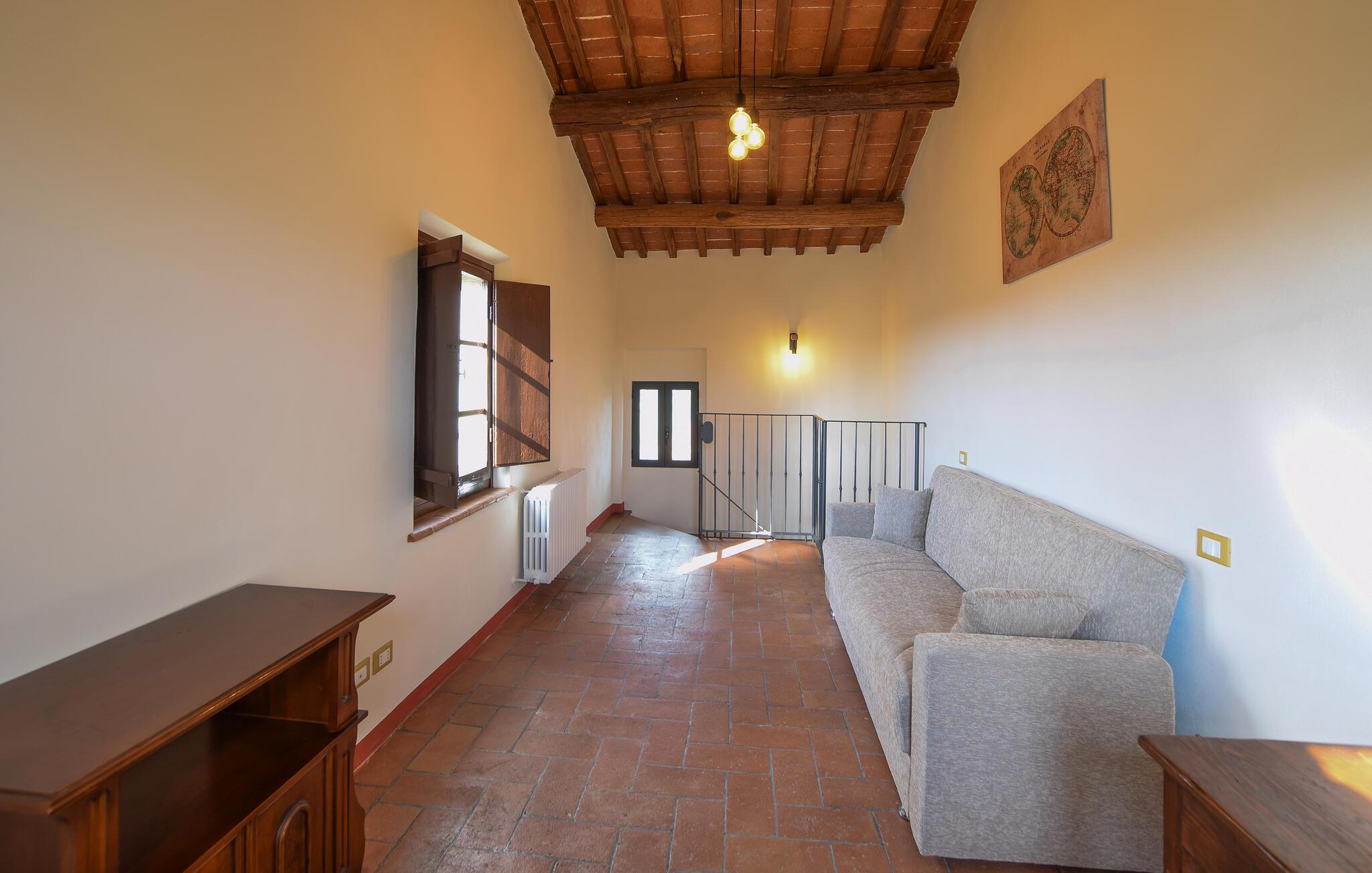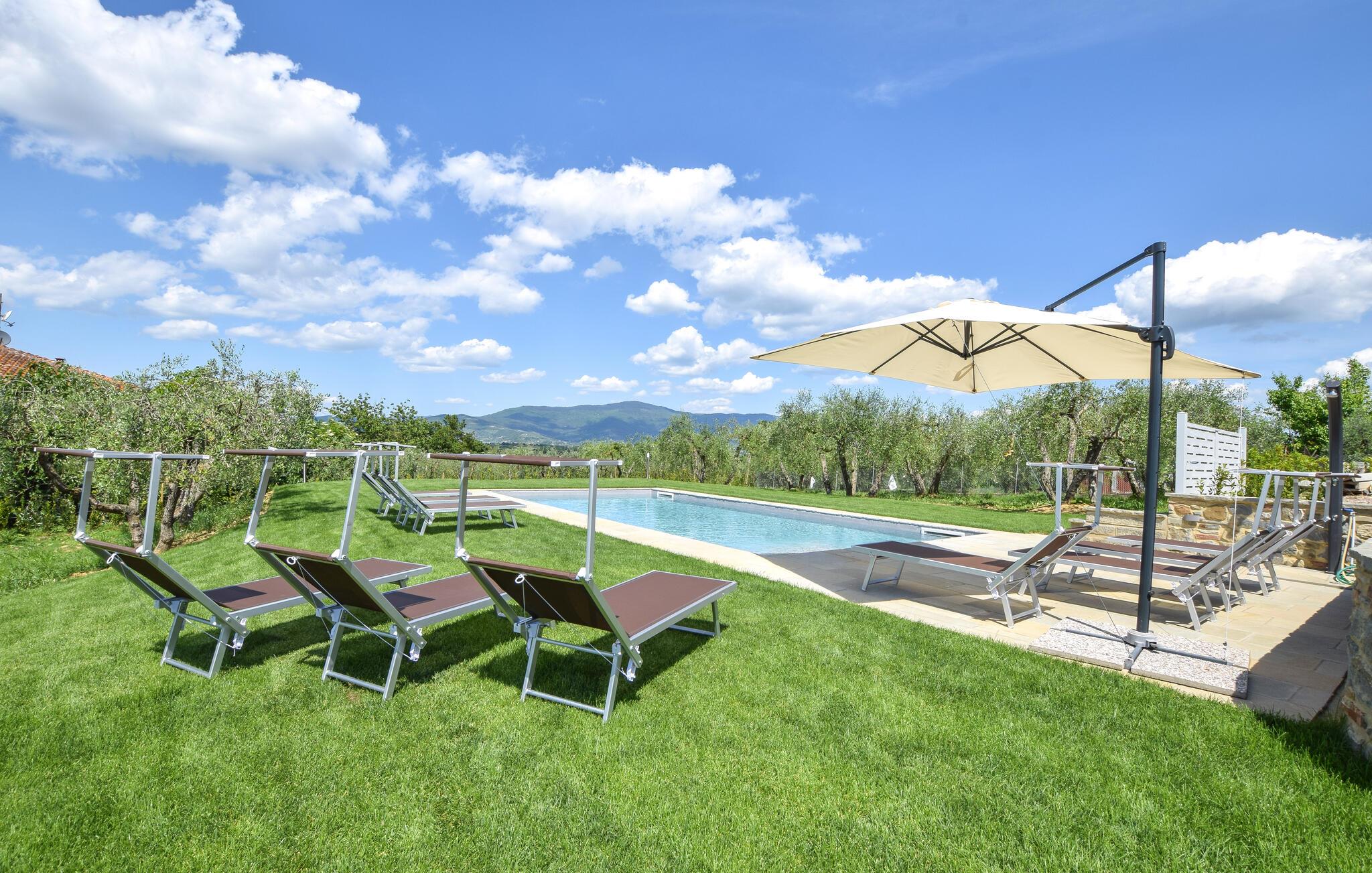 Willkommen in Ihrem Ferienhaus in Fratticciola di Cortona. Diese liebevoll renovierte Haushälfte eines historischen Bauernhofs bietet Ihnen eine ideale Mischung aus rustikalem Charme und modernem Komfort. Genießen Sie den Tag auf der Terrasse, wo bequeme Sitzmöglichkeiten und ein Sonnenschirm für Schatten sorgen. Entspannen Sie am privaten Pool, umgeben von einem gepflegten Rasen und Olivenhainen, und lassen Sie die Seele baumeln.