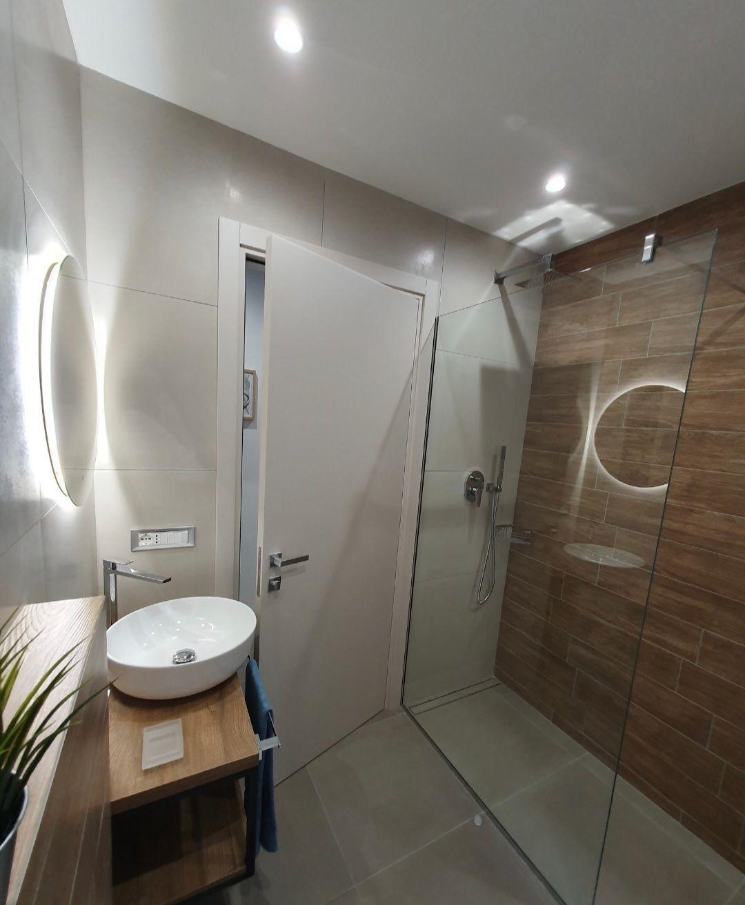 Komfortables Badezimmer mit Fenster, ausgestattet mit begehbarer Glasdusche und hellem Rundspiegel.