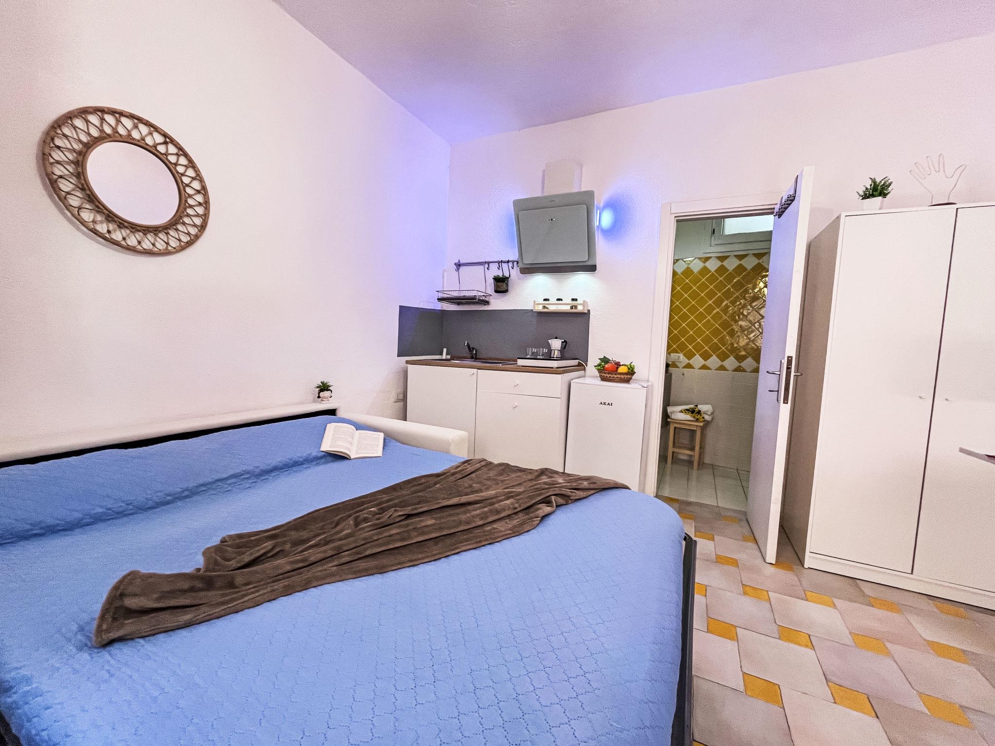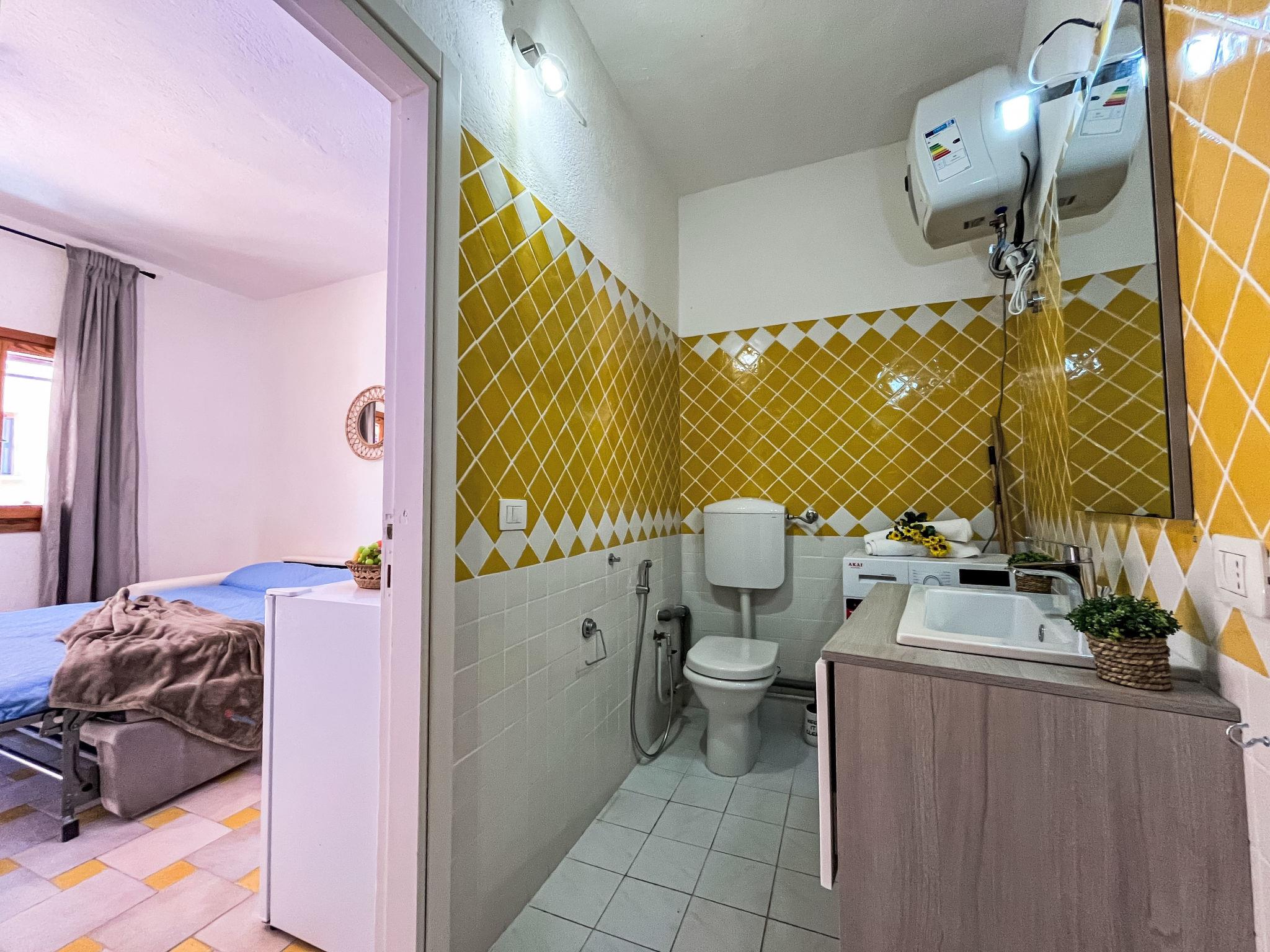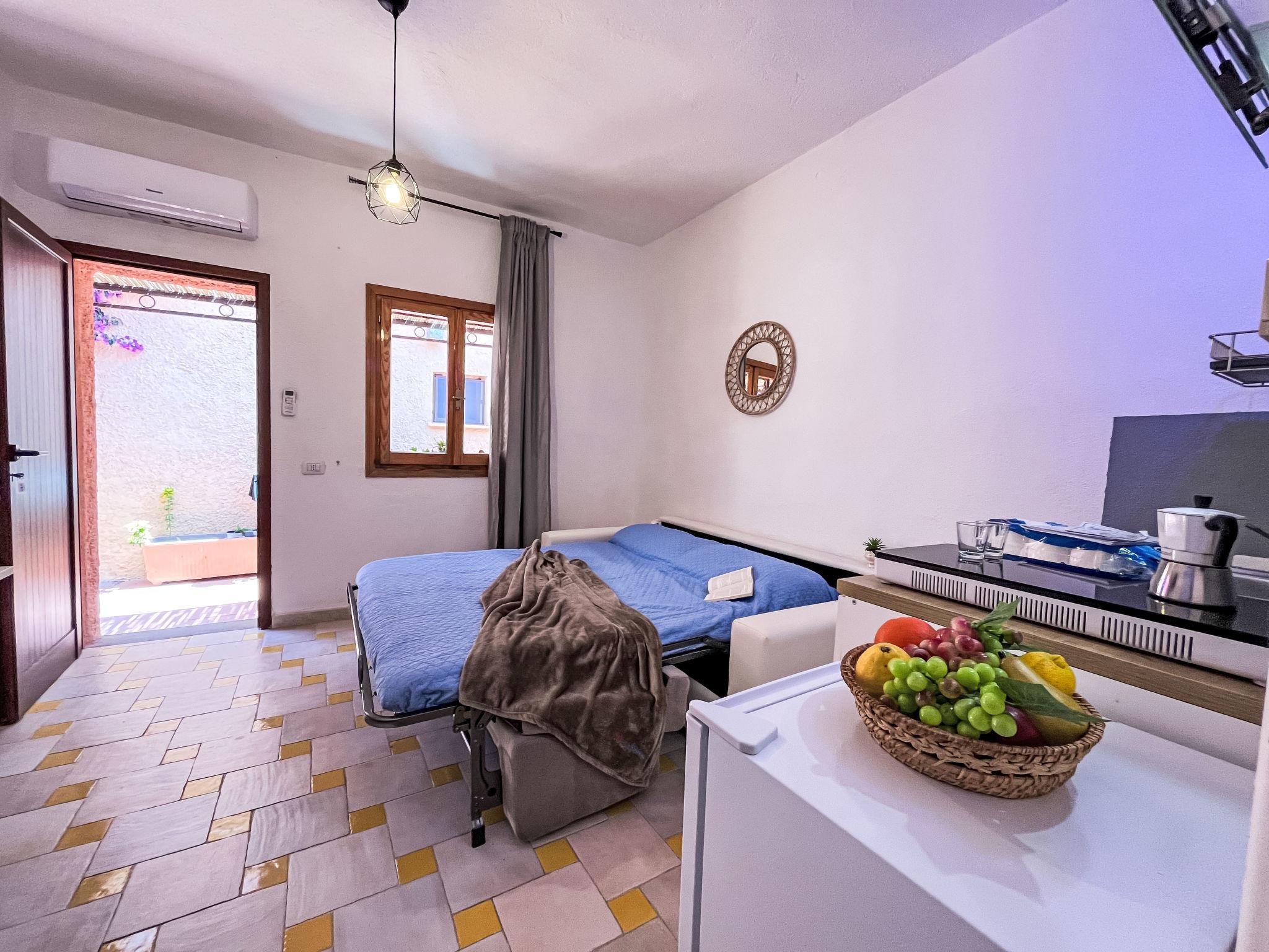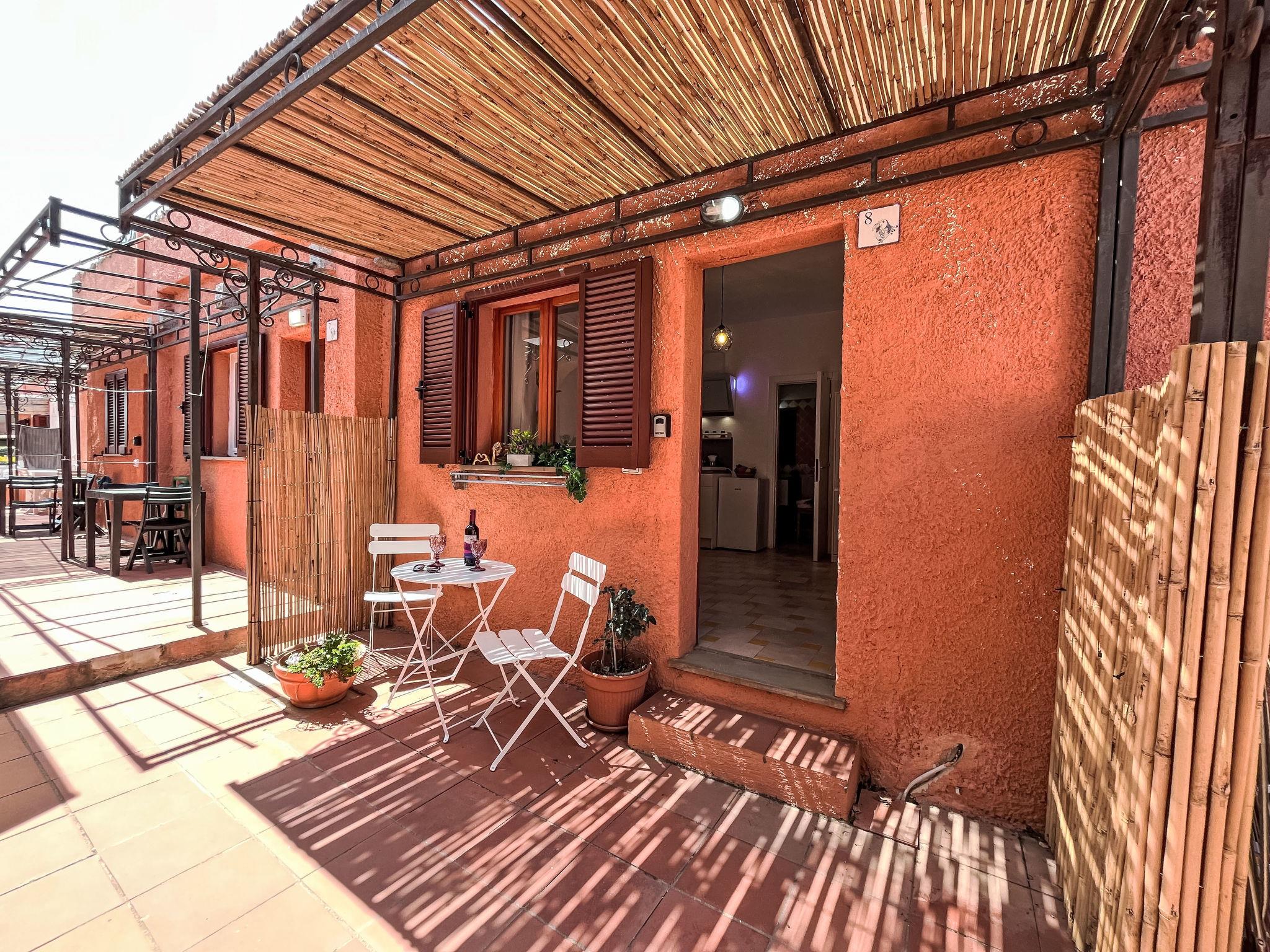 "Mono 0/8/M Marineledda", 1-Zimmer-Wohnung 18 m2, im erhöhten Erdgeschoss. Zweckmässig und geschmackvoll eingerichtet: Wohn-/Schlafzimmer mit 1 Doppeldiwanbett (140 cm, Länge 190 cm), TV. Kleine Kochnische (2 Induktionskochplatten, Toaster, Wasserkocher) mit kleinem Esstisch. Dusche/WC. Klimaanlage, Warmluftheizung, Boiler (30 Liter). Terrasse überdacht. Terrassenmöbel. Zur Verfügung: Waschmaschine, Bügeleisen, Haartrockner. Internet (WLAN, gratis). Bitte beachten: Kühlschrank ohne Gefrierfach, Nichtraucher-Haus. Maximal 1 Haustier/Hund erlaubt. Rauchmelder, Feuerlöscher. IT090083C2000T7829