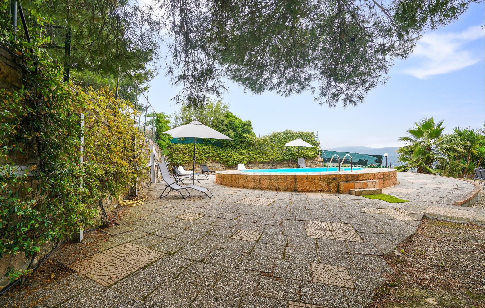 Auf der großen, überdachten Terrasse können Sie den Blick über das Meer schweifen lassen. Der runde, gemeinschaftlich genutzte Pool sorgt an warmen Tagen für Erfrischung. Tanken Sie neue Energie auf der Liege und atmen Sie die klare Bergluft ein.