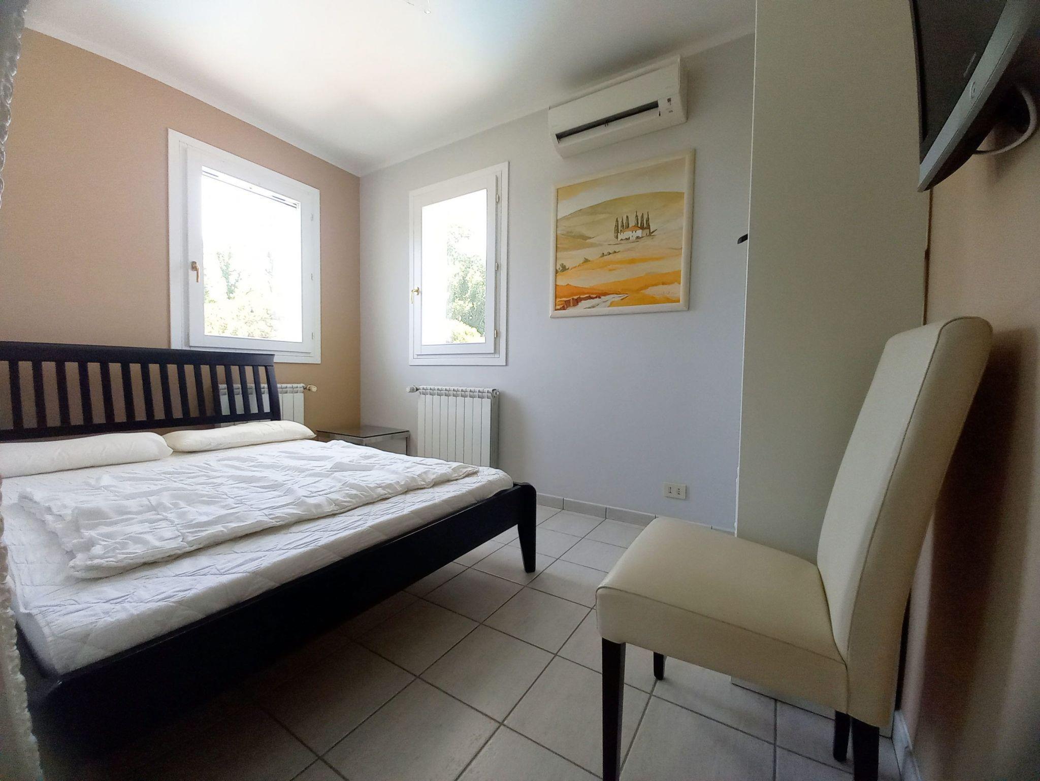 • Ein Schlafzimmer mit großem Schrank Doppelbett, Klimaanlage und Türe zur Terrasse Richtung Wasser