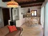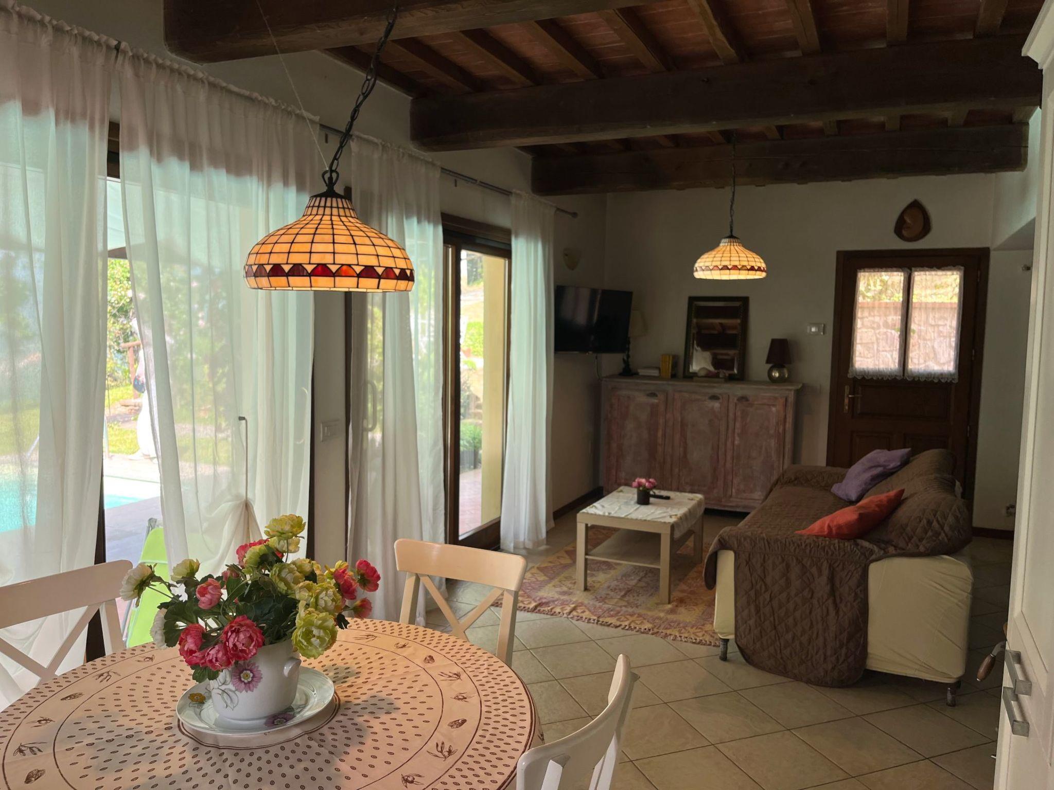 Auf zwei Ebenen, großes Wohnzimmer mit Sofa und TV sowie Küchenbereich mit Esstisch. Badezimmer mit Toilette, Bidet und Waschbecken sowie Waschmaschine. Im ersten Stock 2 Schlafzimmer, ein Doppel- und ein Zweibettzimmer, Bad mit Dusche, WC, Bidet und Waschbecken. Modern im Geschmack, aber mit dem Charme der toskanischen Häuser. Das Haus hat Heizung. Vom Wohnzimmer aus, durch ein großes, helles Fenster, gibt es Zugang zur Veranda mit Blick auf den Pool.