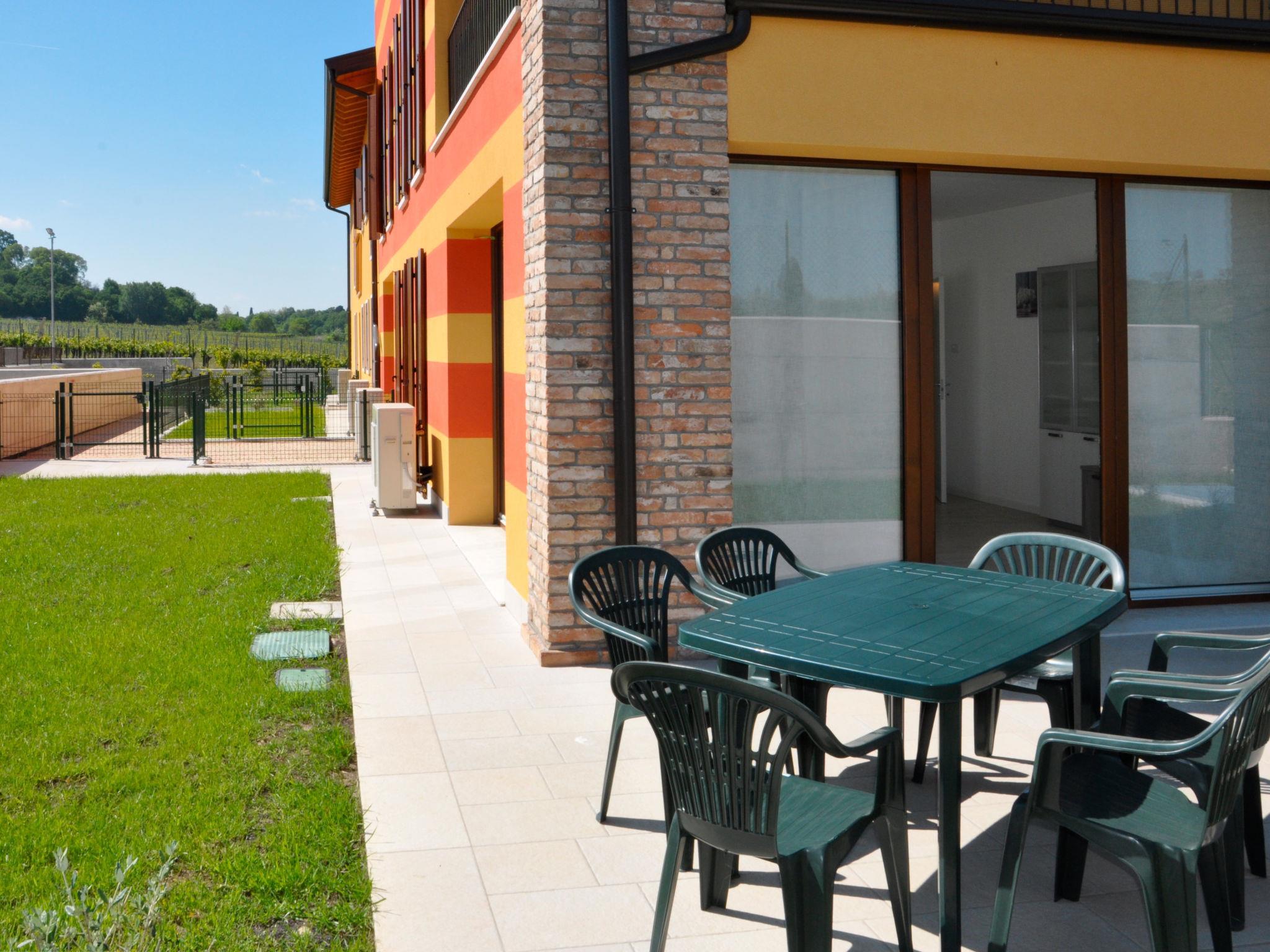 Moderne, schöne Residenz "I Molini", Baujahr 2018, umgeben von Wiesen und Weinbergen. 14 Wohnungen in der Residenz. Im Ortsteil Colà, 3 km vom Zentrum von Lazise, 6 km vom Zentrum von Bardolino, 2.5 km vom See, 2.5 km vom Strand. Zur Mitbenutzung: Grundstück (eingezäunt) mit Pflanzen, Liegewiese, Schwimmbad eckig (15 x 8 m, saisonale Verfügbarkeit: 01.Jun. - 30.Sep.). Aussendusche, Parkplatz (für 2 Autos), Gemeinschaftsgarage. Einkaufsgeschäft 1.5 km, Restaurant 1.5 km, Bahnstation "Peschiera del Garda" 8 km, Kieselstrand 2.5 km.