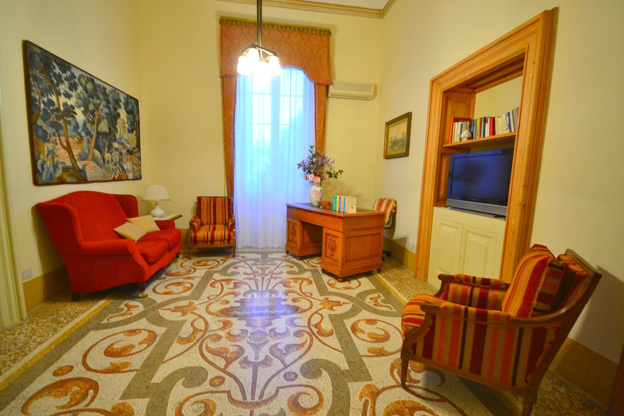 Im hinreißenden historischen Zentrum von Lecce, einer berühmten Barockstadt im Süden Italiens, steht das Palazzo Pio. Es ist ein elegantes Gebäude aus dem 19. Jahrhundert und gehört zu den eklektischsten der Stadt. Der Bau der Residenz wurde im Jahr 1872 begonnen und Ende des 19. Jahrhunderts vollendet. Eine gewölbte, abgesenkte Eingangshalle führt zu einem Säulenhof mit einer Treppe, die mit Statuen und venezianischem Putz verziert ist. Das bemerkenswerteste Merkmal des Palazzo ist jedoch der Mosaikboden im gesamten ersten Stockwerk des Gebäudes, der ihm seine Einmaligkeit, Stil und Eleganz gibt. Die Farbveredelung, das dargestellte Geschick und die ikonographische Fülle der Motive (geometrisch, floral, vegetativ, mit anthropomorphen Tierfiguren, fantastisch und menschlich zugleich) erzeugen eine intensive und emotionale Wirkung auf den Besucher. Komplett freistehend und ruhig gelegen, hat der Palazzo Pio einen luxuriösen, voll ausgestatteten Garten - den inneren Orangenhain, typisch für Behausungen dieser Zeit - der den Gästen einen angenehmen und entspannten Aufenthalt im Herzen der Stadt ermöglicht.