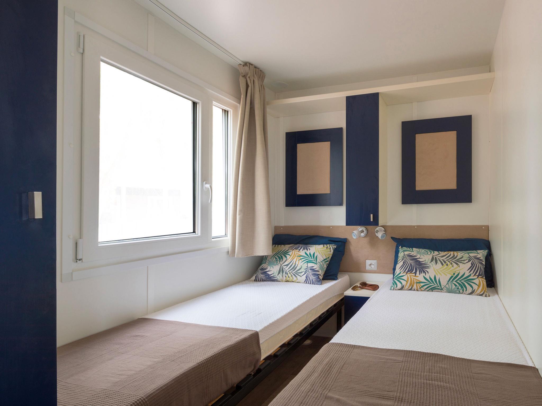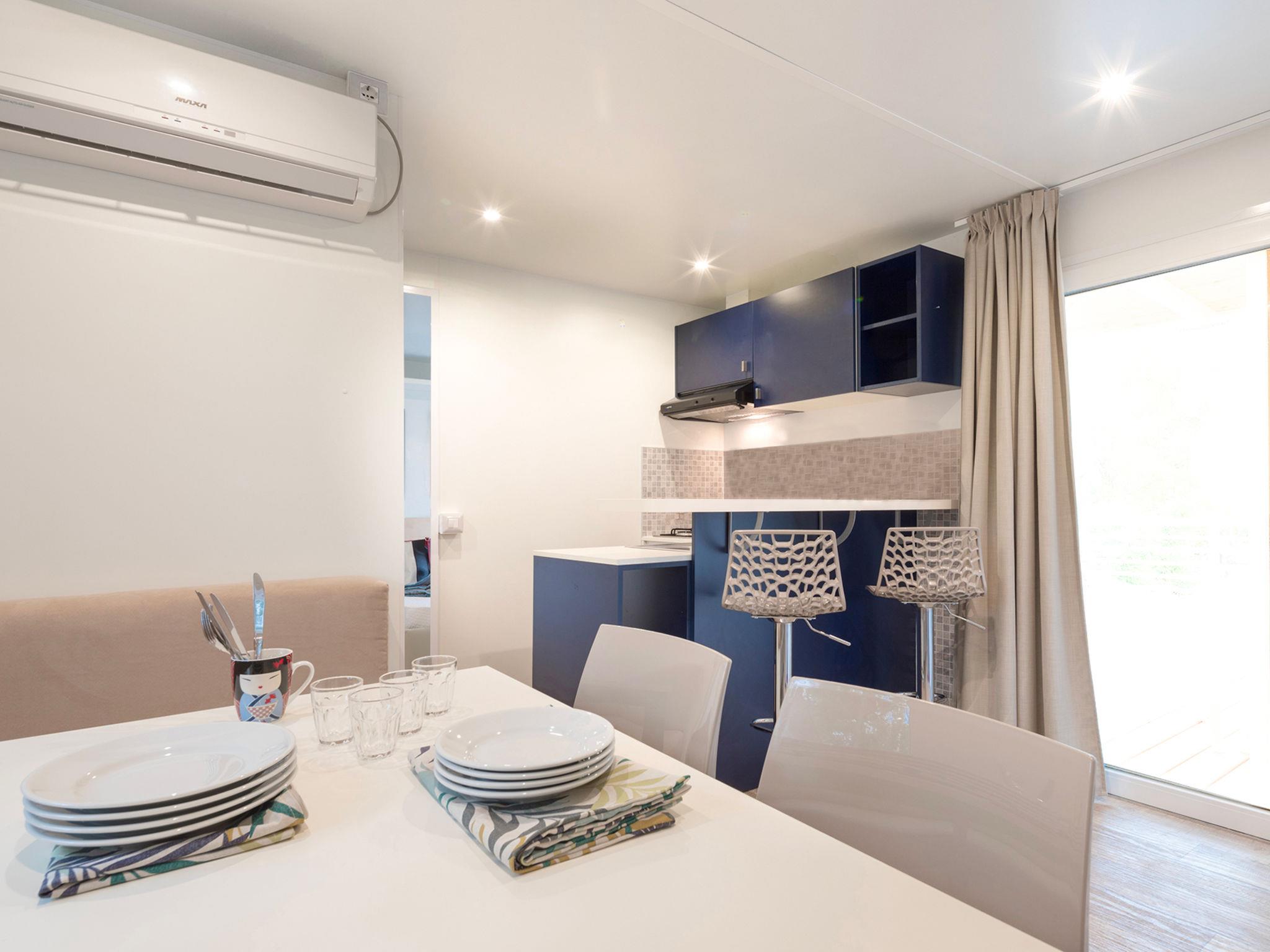 "Elite", 4-Zimmer-Mobilheim 33 m2. Modern eingerichtet: Wohn-/Esszimmer mit Esstisch und Digital-TV. 1 Zimmer mit 1 franz. Bett (140 cm). 2 Zimmer, jedes Zimmer mit 2 Betten (70 cm). Kochnische (4 Flammen, Tiefkühler). Dusche/WC, sep. WC. Klimaanlage, Warmluftheizung. Terrasse teilweise überdacht. Terrassenmöbel. Zur Verfügung: Fliegengitter. Parkplatz (1 Auto) beim Haus. Bitte beachten: Nichtraucher-Unterkunft. IT058091B15DOBLBCU