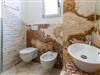 Diese Ferienwohnung ist die größte in der Villa und kann bis zu neun Personen beherbergen. Sie ist in kühlen Weiß- und Blautönen gehalten und verfügt über zwei Schlafzimmer. Das Vierbettzimmer ist mit einem Doppelbett (180x190cm) und einem Etagenbett (je 90x190cm) ausgestattet und ist ideal für eine Familie. Das zweite Zimmer hat ebenfalls ein Doppelbett (180x190cm) und ein Einzelbett für ein Kind (80x170cm). Das Wohnzimmer verfügt über ein Sofa, das in zwei Einzelbetten oder ein Doppelbett umgewandelt werden kann. In der Mitte befindet sich ein Esstisch mit Stühlen. Die offene Küche, die durch eine halbe Wand vom Wohnzimmer getrennt ist, ist mit einem Gasherd, Backofen, Mikrowelle, Toaster und Kühlschrank mit Gefrierfach ausgestattet. Die Wohnung hat zwei Bäder mit Dusche: eines im Erdgeschoss und eines im Obergeschoss. Sie ist auch mit einer Waschmaschine ausgestattet. Die beiden Schlafzimmer und das Wohnzimmer sind klimatisiert.