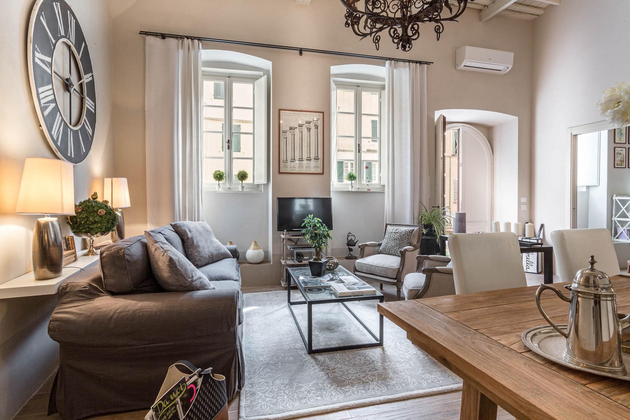 Erleben Sie den Charme der Altstadt von Lucca bei einem Aufenthalt in diesem bezaubernden Apartment im Erdgeschoss, das mittelalterlichen Charme mit modernen Annehmlichkeiten perfekt verbindet. Gelegen an der malerischen Via del Fosso, die einst als lebhafter Fluss eine alte Festung umgab, bietet diese Unterkunft einen Einblick in die reiche Vergangenheit der Stadt und ist gleichzeitig ein gemütlicher Rückzugsort für Reisende von heute. Genießen Sie den Blick auf den ruhigen Kanal mit seinen malerischen Brücken und die beeindruckende Kirche San Francesco, die für ihre markante romanische Fassade aus weißem Marmor bekannt ist. Die erstklassige Lage des Apartments bietet einen idealen Ausgangspunkt zu den berühmtesten Sehenswürdigkeiten Luccas. Nur einen kurzen Spaziergang entfernt befinden sich die Via Fillungo, die geschäftige Haupteinkaufsstraße der Stadt, sowie historische Highlights wie die Via Santa Croce und das berühmte Amphitheater. Die zentrale Lage lädt zu gemütlichen Erkundungstouren durch bezaubernde Straßen ein und bietet die Möglichkeit, die lokale Küche in charmanten Cafés und Restaurants in der Nähe zu genießen. So können Sie ganz einfach in die lebendige Kultur dieser faszinierenden Stadt eintauchen. Das auf Komfort und Bequemlichkeit ausgelegte Interieur bietet ein geräumiges Wohnzimmer mit einem bequemen Doppelschlafsofa für zusätzliche Gäste und Blick auf den Kanal. Die voll ausgestattete Küche ist mit modernen Geräten ausgestattet, während das ruhige Doppelzimmer über ein eigenes Bad mit moderner Dusche verfügt. Ein zusätzliches Badezimmer, Waschmaschinenmöglichkeit, Klimaanlage und zuverlässiges WLAN sorgen für einen entspannten und angenehmen Aufenthalt. Dank des einfachen Zugangs vom Erdgeschoss und der durchdachten Raumaufteilung verbindet das Apartment Komfort perfekt mit dem Charme des historischen Luccas. Hinweis: Kurtaxe ist vor Ort zu entrichten.