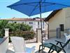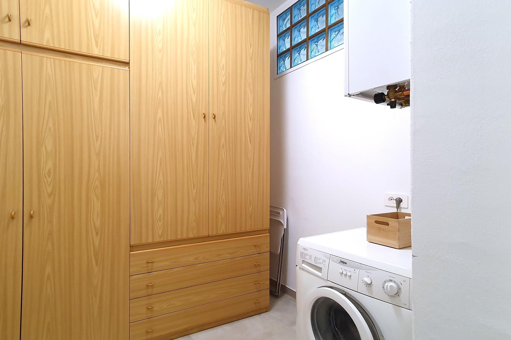 In der 2. Etage: (Wohnzimmer(Doppelschlafcouch, TV, Esstisch, Sitzecke), offene Küche(Kochplatte, Dunstabzugshaube, Backofen, Mikrowelle, Spülmaschine, Kühl-/Gefrierkombination, Waschbecken), Schlafzimmer(Doppelbett, Balkon), Badezimmer(Dusche, Waschbecken, Toilette, Bidet), Waschraum(Waschmaschine), Klimaanlage) Esstisch, Dachterasse, Liegen, Sonnenschirm