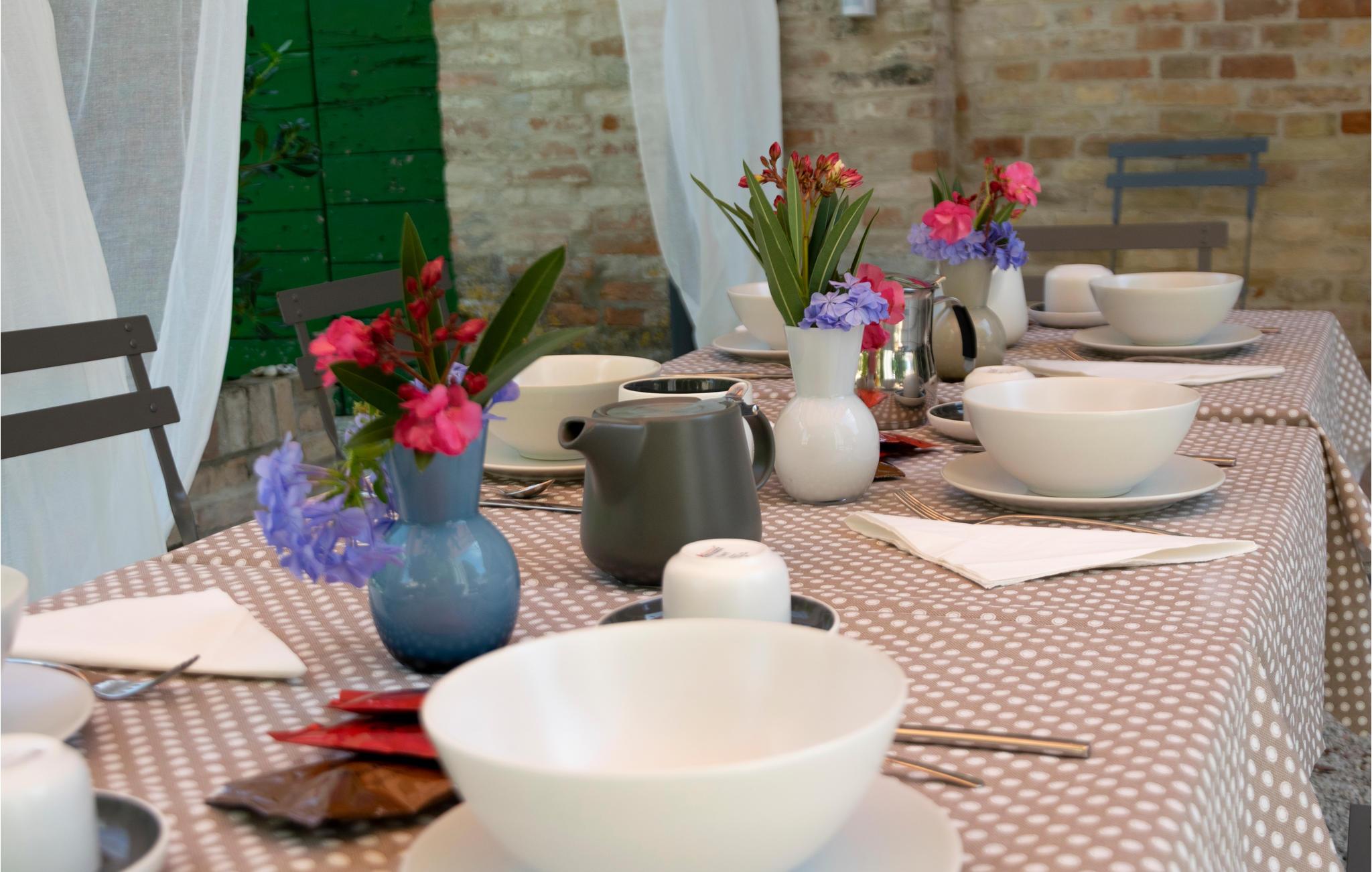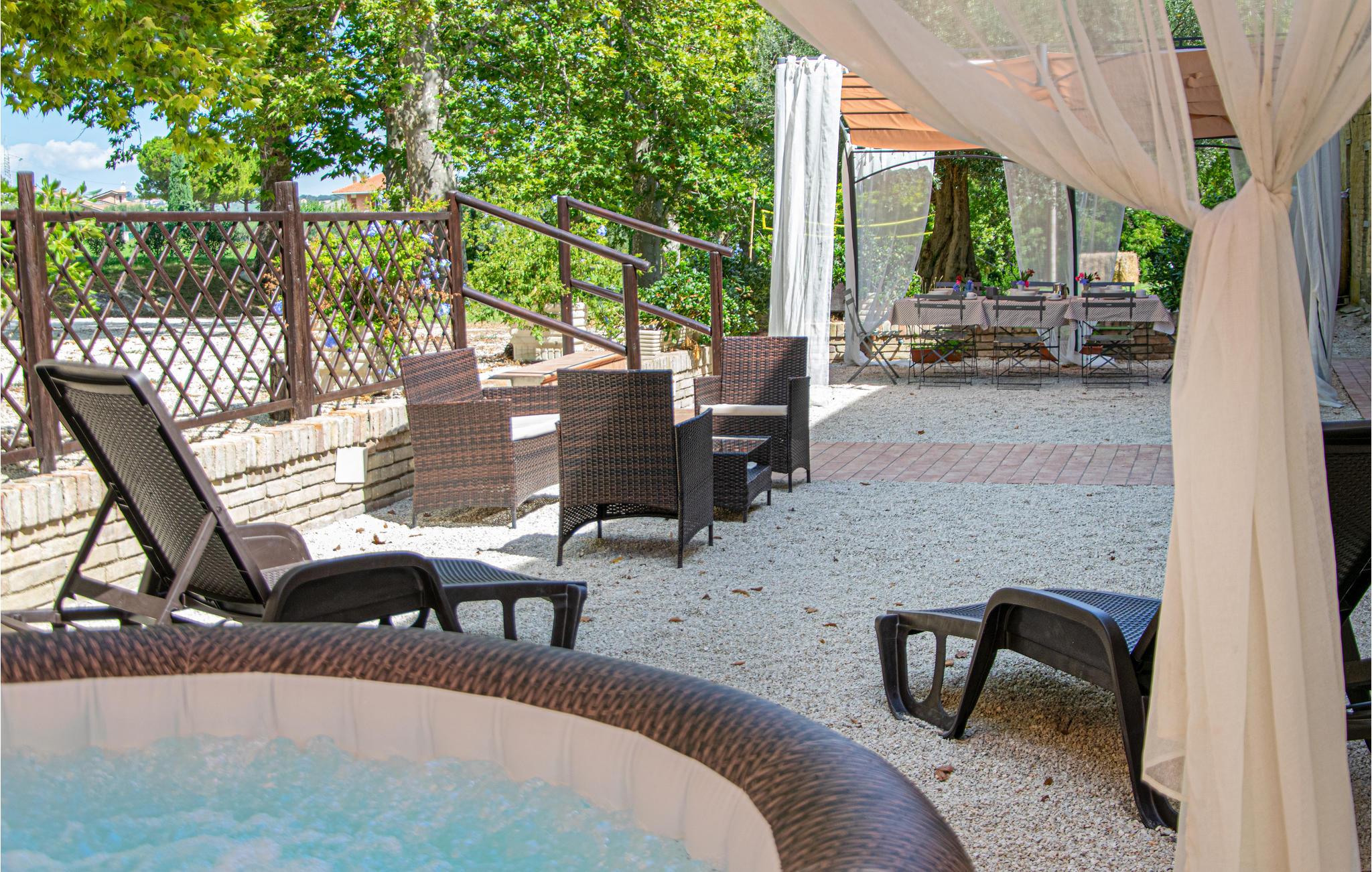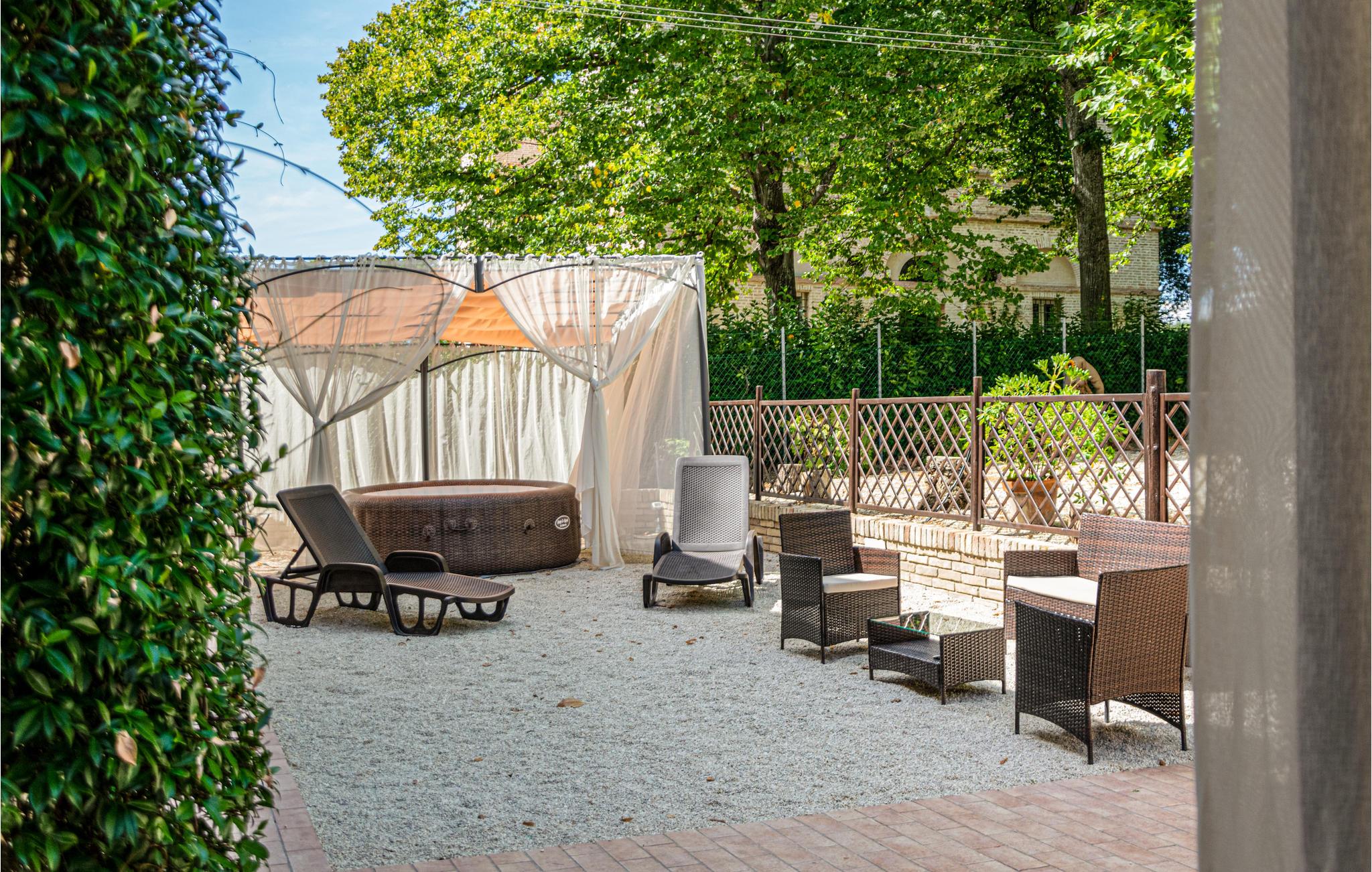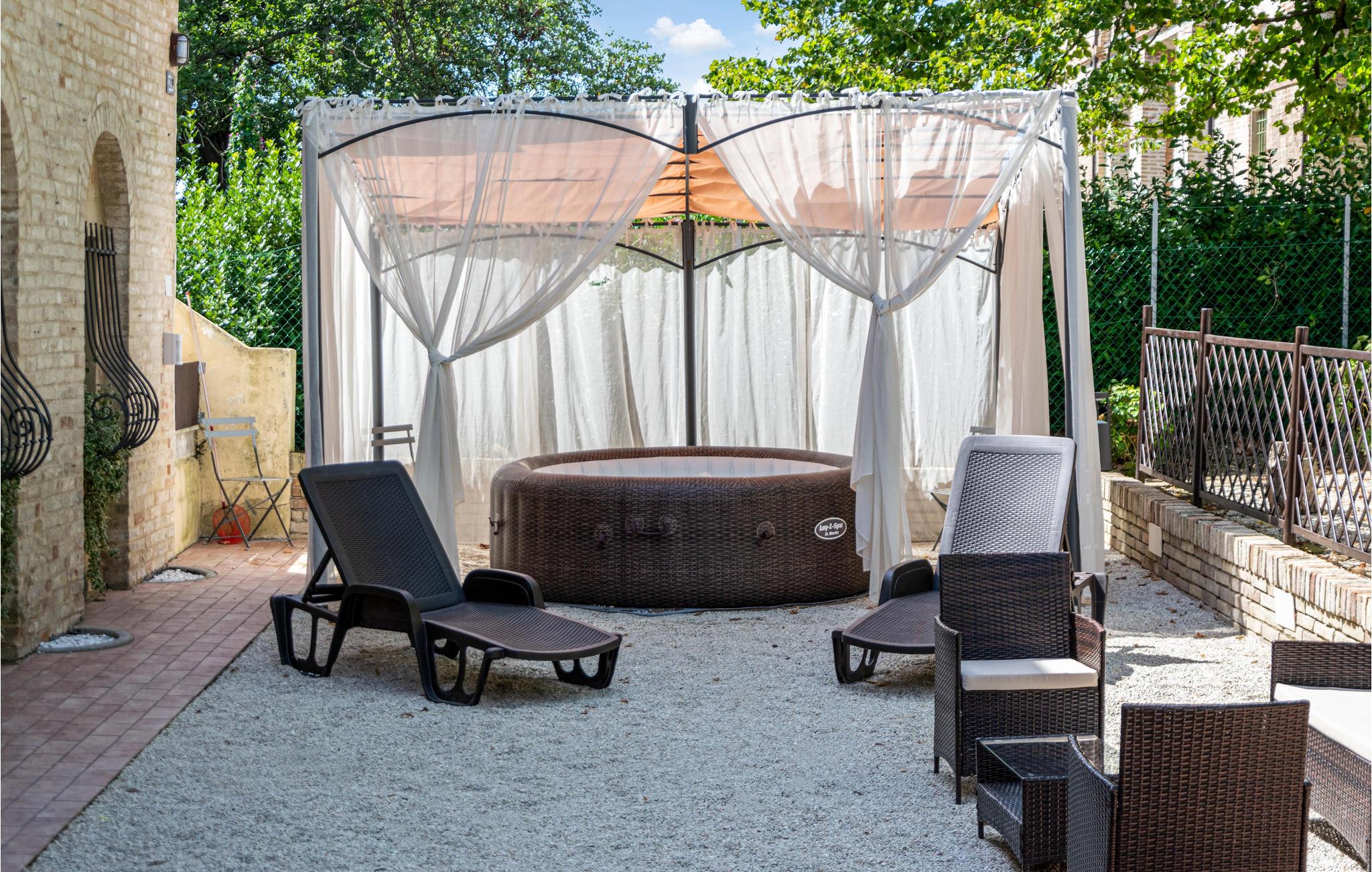 Genießen Sie ein gemütliches Frühstück oder Abendessen im Freien, umgeben vom sanften Schatten der Platanen. Lehnen Sie sich anschließend im warmen Whirlpool zurück und spüren Sie, wie die Ruhe des Gartens Sie vollkommen entspannen lässt. Verbringen Sie zwischendurch Zeit auf den Liegen oder in den Pavillons und genießen Sie einfach die friedliche Atmosphäre unter freiem Himmel.