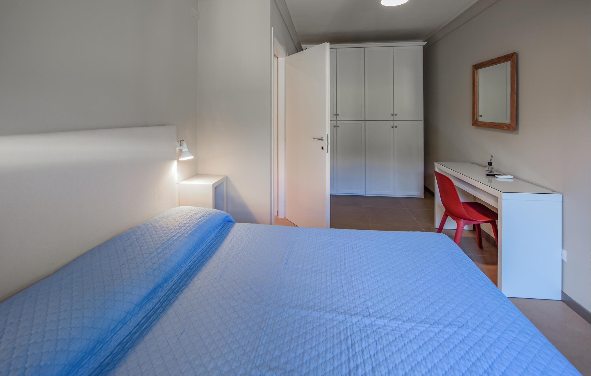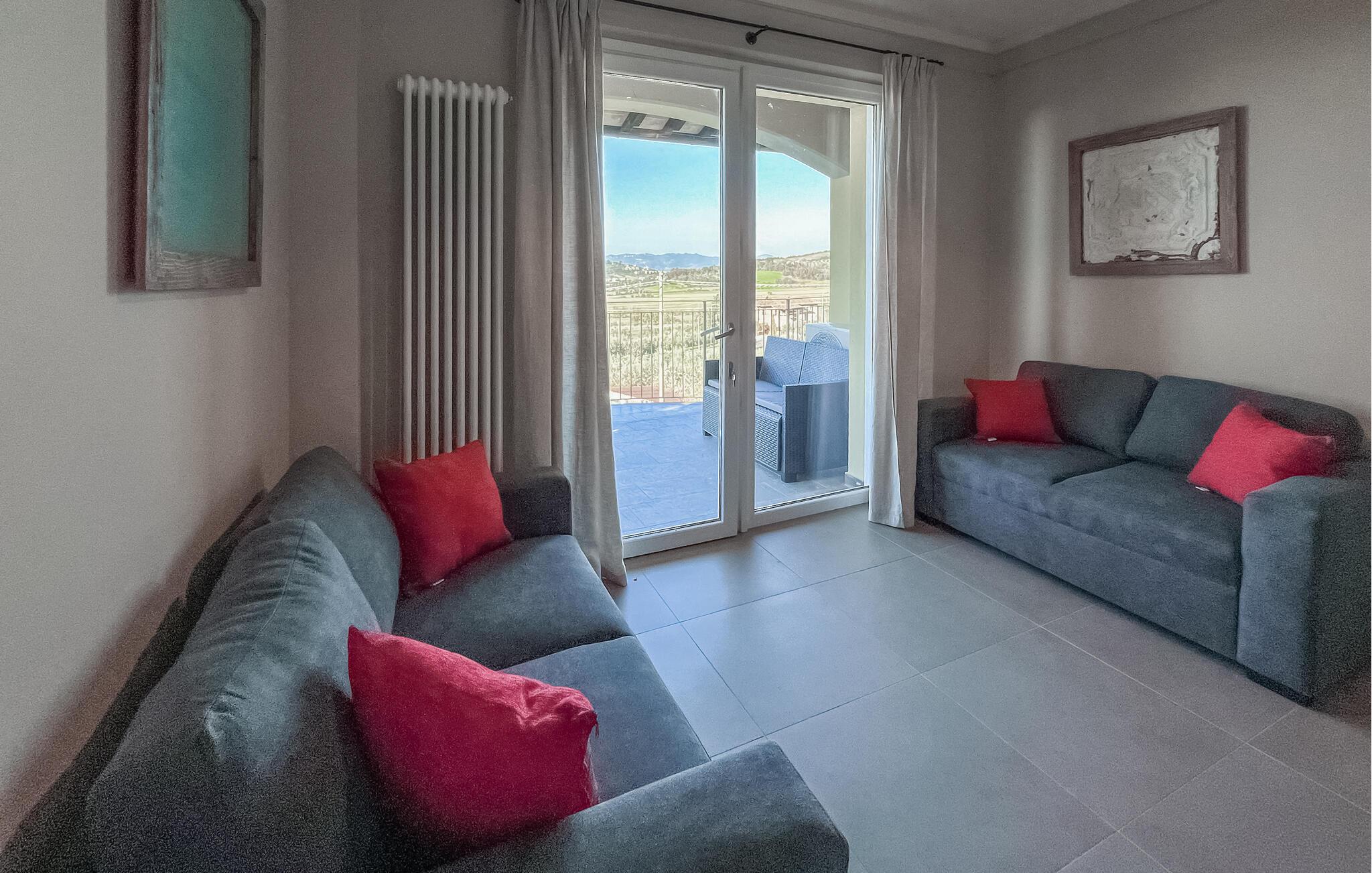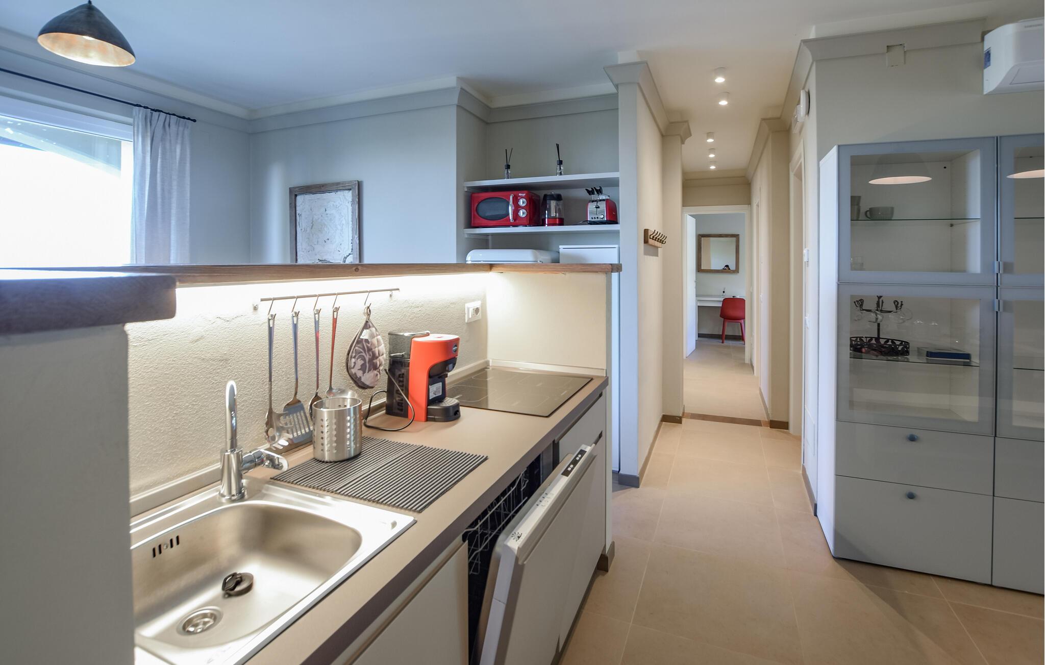 Freuen Sie sich auf eine entspannte Auszeit in diesem hellen, modern eingerichteten Urlaubsdomizil. Experimentieren Sie in der voll ausgestatteten Küche mit lokalen Zutaten und feiern Sie gemeinsame Mahlzeiten im wohnlichen Ambiente. Der offene Wohnbereich bietet viel Platz für gesellige Abende – machen Sie es sich auf dem bequemen Sofa gemütlich oder nutzen Sie den großen Esstisch für ein gemeinsames Dinner.