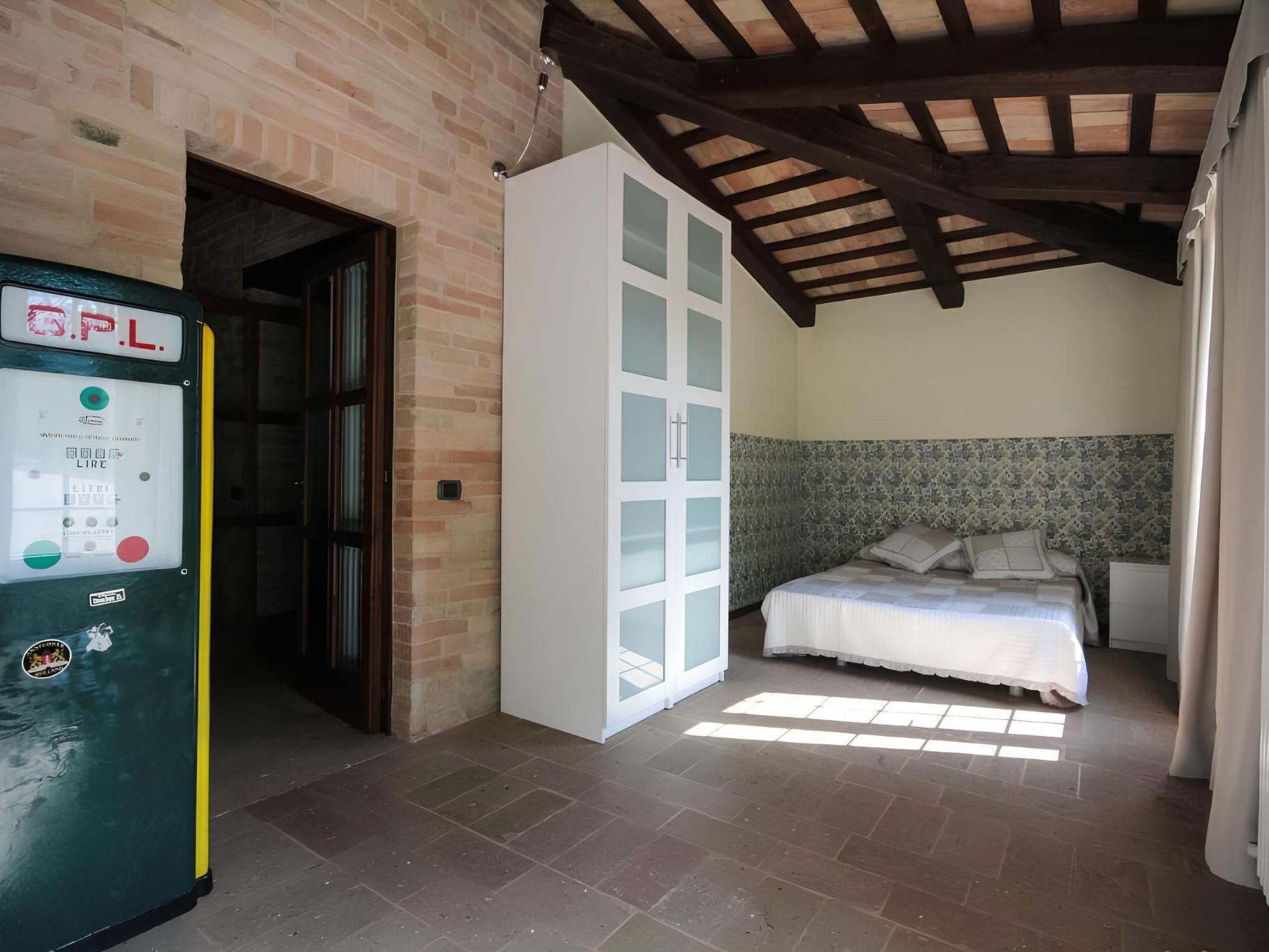 Das Äußere der Wohnung ist ebenso reizvoll. Die Terrasse bietet nicht nur einen herrlichen Platz zum Essen im Freien, sondern auch die Möglichkeit, sich auf bequemen Liegestühlen zu entspannen, ideal zum Sonnenbaden oder einfach nur, um die Ruhe der Landschaft zu genießen, in der Nähe des Swimmingpools, der das grüne Tal bis zum Meer von Porto San Giorgio überblickt. Ein alter Brunnen, ein Holzofen sowie Stein- und Ziegelmauern tragen zu einer ruhigen Atmosphäre bei.