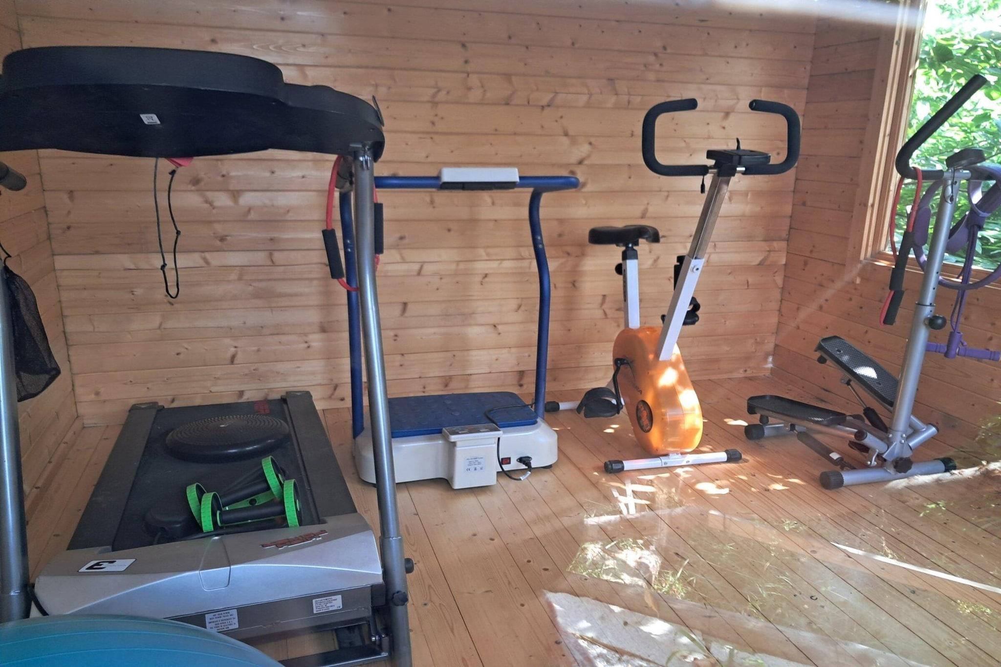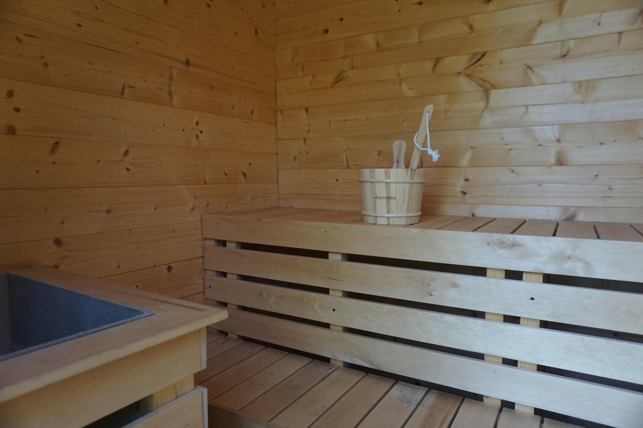 Parterre: (Kochnische(Kochplatte, Kühlschrank, ), Wohn-/Schlafzimmer(Doppelschlafcouch, Schrankbett für 2 Personen), Badezimmer(Massagedusche, Waschbecken, Toilette)) Fitnessraum(Gemeinschaftliche Nutzung mit anderen Gästen), Sauna(Gemeinschaftliche Nutzung mit anderen Gästen), Parkplatz, Pool(Gemeinschaftliche Nutzung mit anderen Gästen)