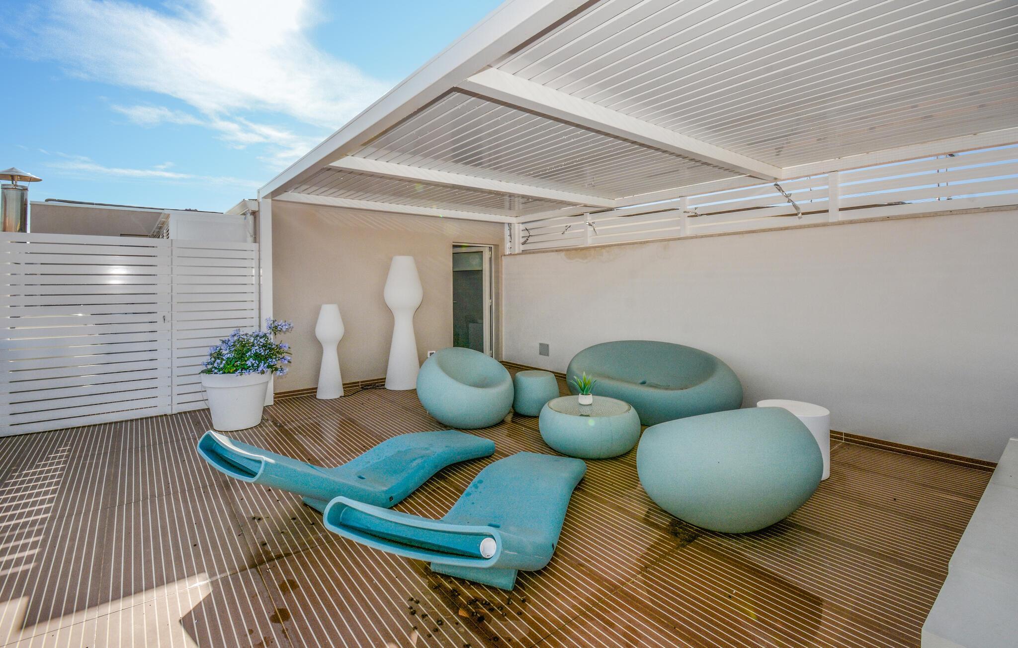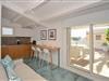 Diese Wohnung ist ideal für einen sonnigen Urlaub am Meer. Die Kombination aus weißen Balkendecken, sanften Holztönen und mediterranen Farbakzenten schafft eine frische, entspannte Atmosphäre. Große Fenster lassen viel Licht herein und öffnen den Blick auf die Terrasse, die den Wohnraum nahtlos nach draußen verlängert. Lehnen Sie sich hier entspannt bei einer Tasse Kaffee zurück oder zaubern Sie leckere Mahlzeiten in der Küche.
