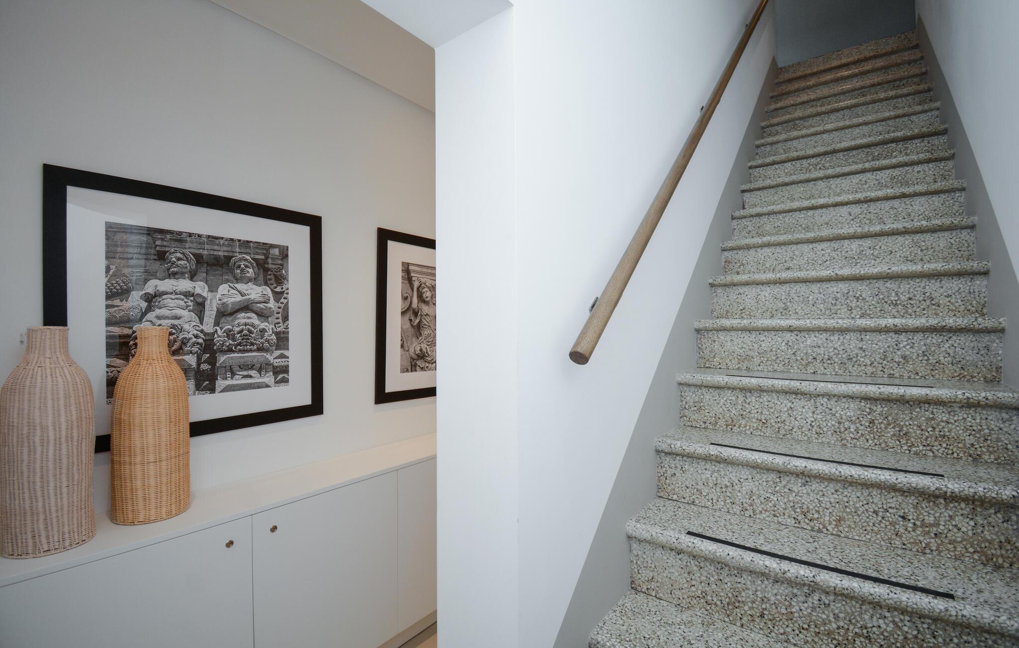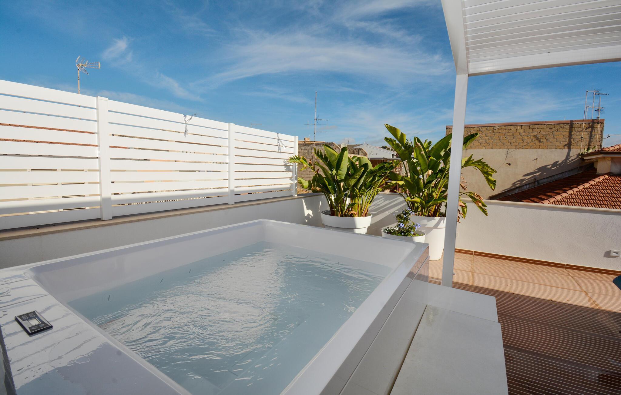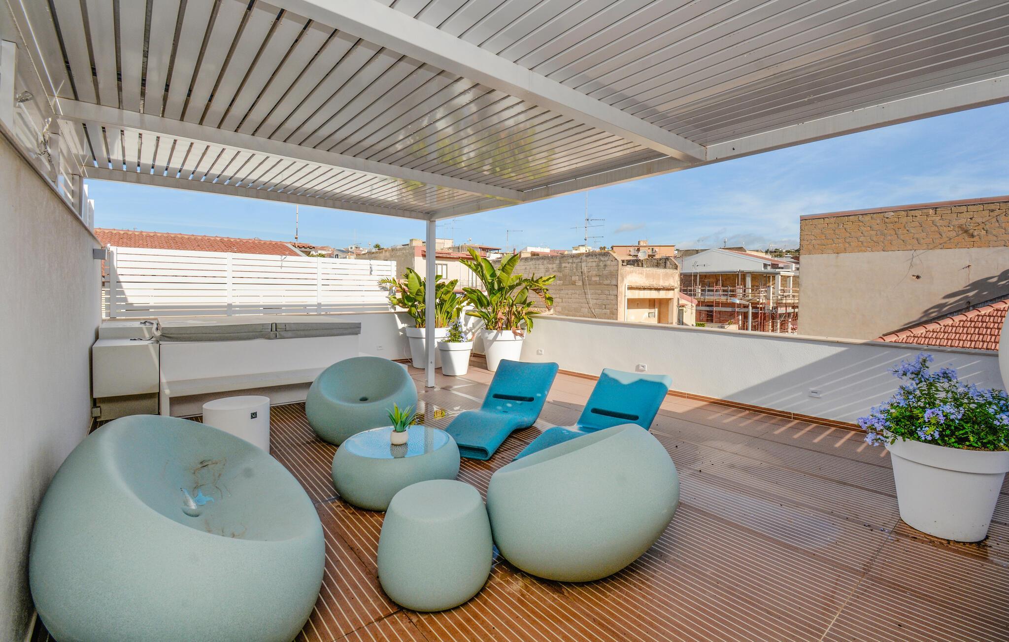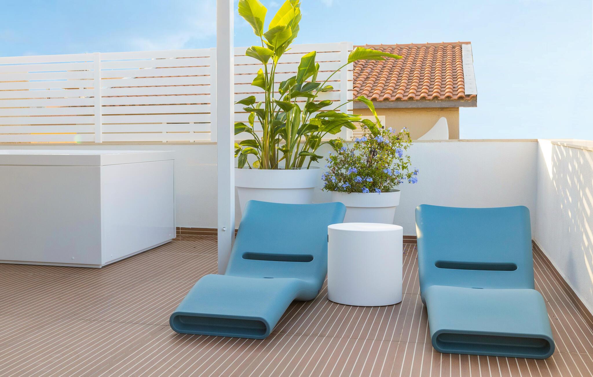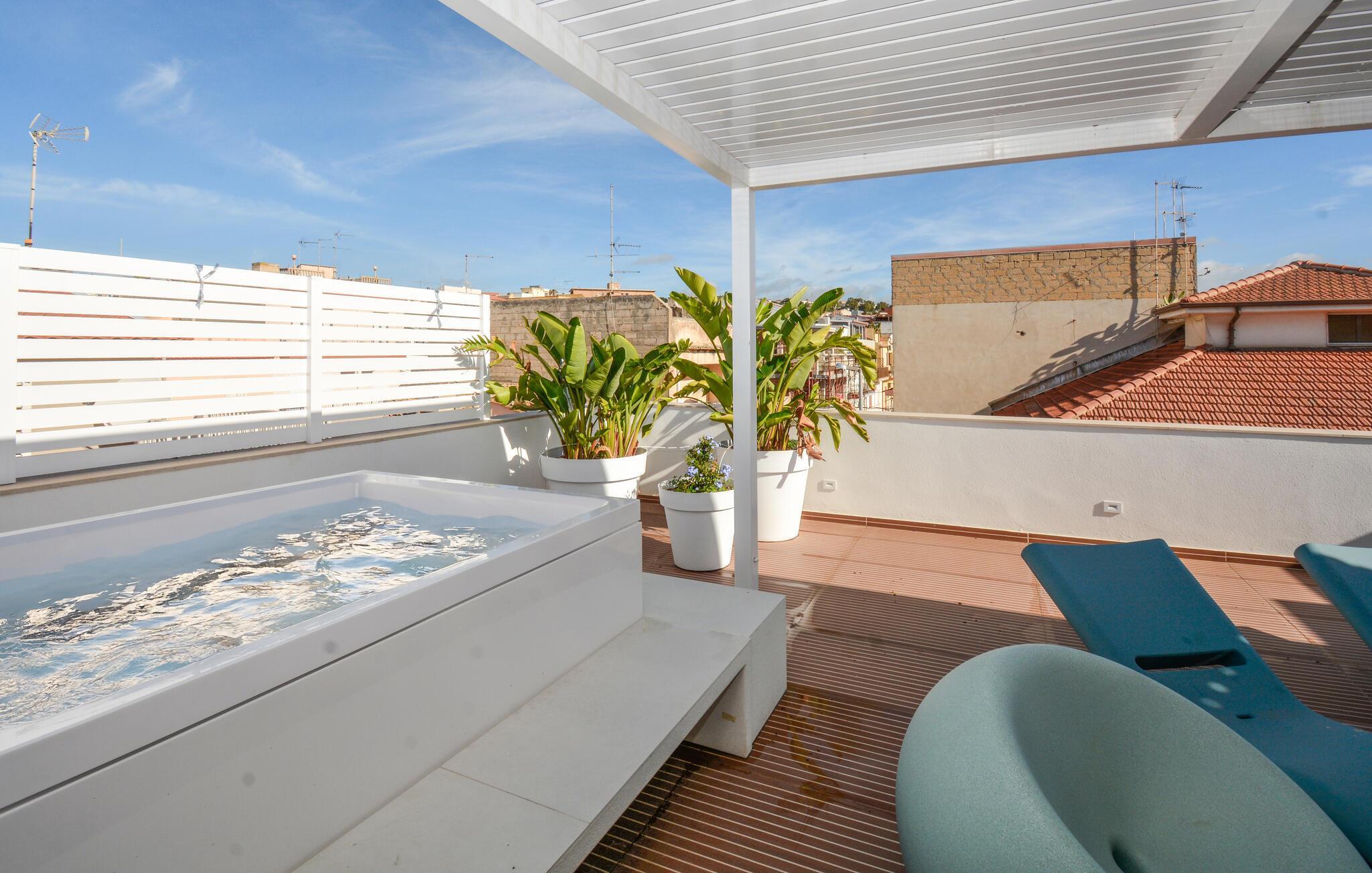 Öffnen Sie morgens die Tür weit zur stilvollen Terrasse und genießen Sie den Blick auf die Stadt. Entspannen Sie sich jederzeit auf den modernen Loungemöbeln oder im Whirlpool. Die sanfte Beleuchtung ist wie geschaffen für laue Sommerabende unter dem Sternenhimmel – genießen Sie hier den Sonnenuntergang bei einem Glas Wein umgeben von Pflanzen und warmen Licht.