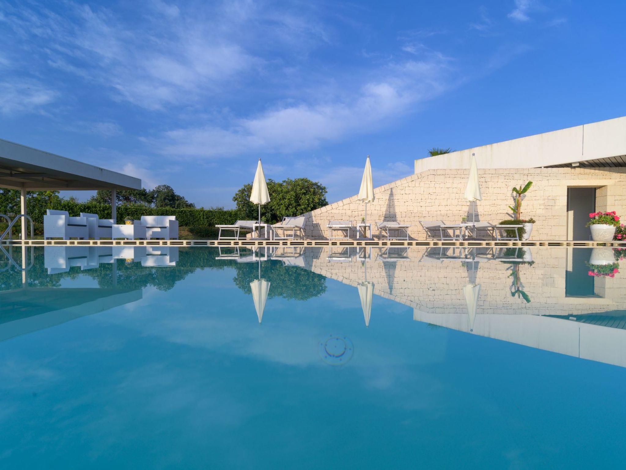 Zum privaten Pool, umgeben von einer Grünzone, gehört eine Sonnenterrasse mit Gartenmöbeln und Außendusche.