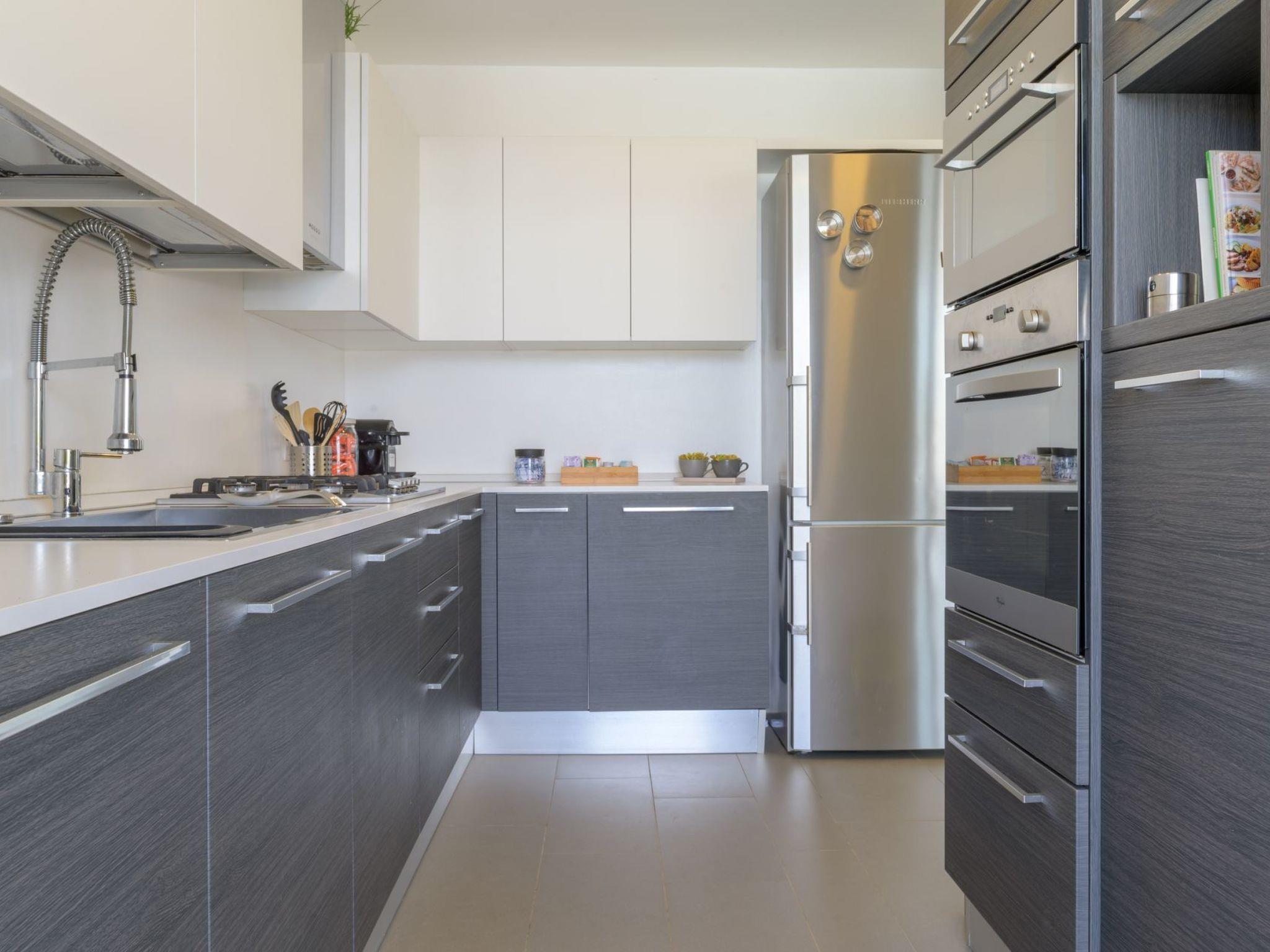Eine Küche mit Blick aufs Pool, vollständig eingerichtet mit Kühlschrank, Tiefkühlfach, Geschirrspüler und Mikrowelle.