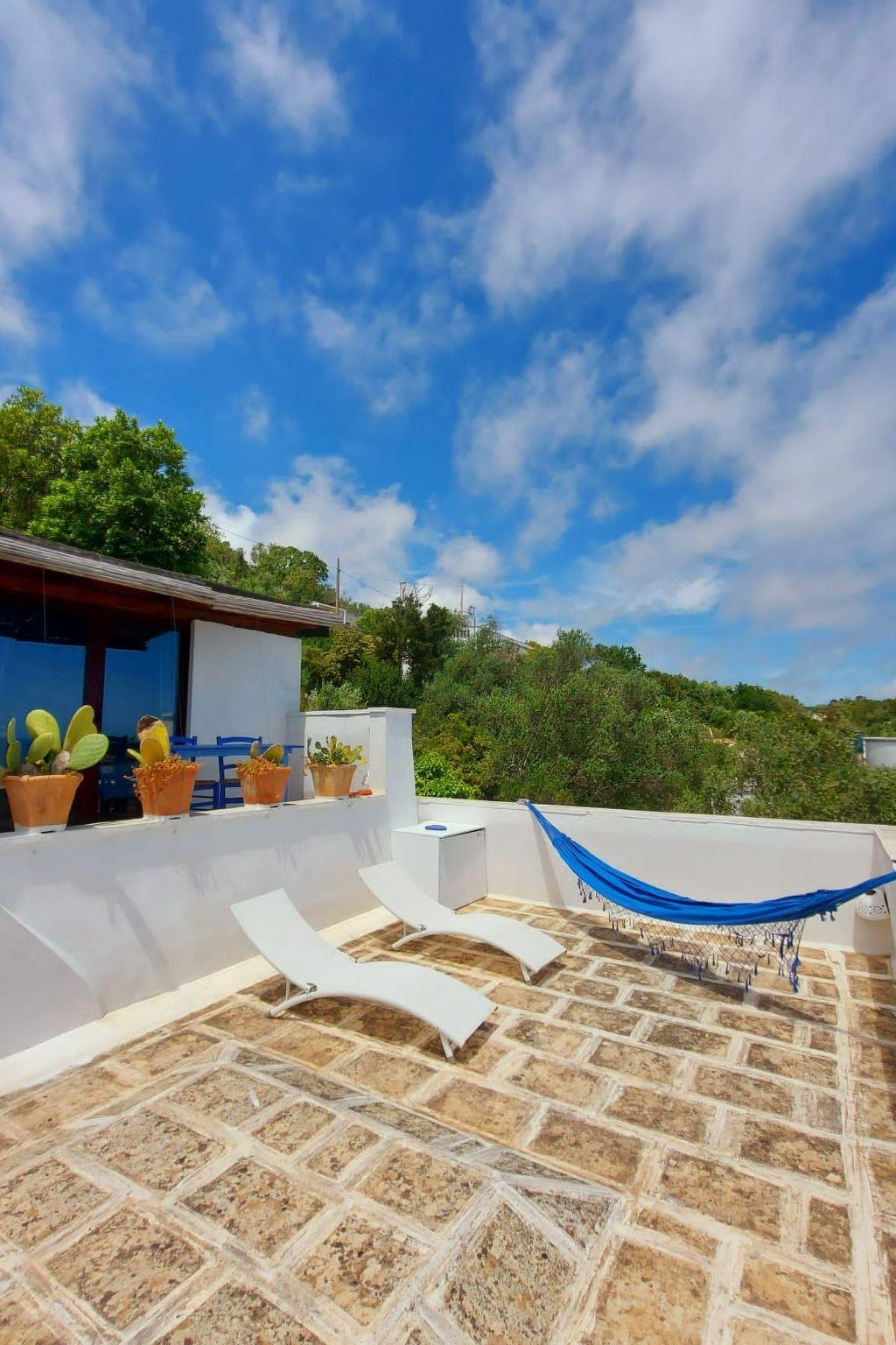 Draußen ist die Terrasse der Wohnung ein privates Paradies. Ausgestattet mit Liegestühlen, einer Hängematte und einem kleinen Tisch ist sie der ideale Ort, um in der Sonne zu entspannen, ein Buch zu lesen oder einfach nur den Blick aufs Meer zu genießen. Der gemeinsame Swimmingpool, ebenfalls mit Blick aufs Meer, bietet einen weiteren Platz zum Entspannen und Genießen. Inmitten der Ruhe dieses Ortes können Sie den Alltagsstress vergessen und sich Momente des reinen Wohlbefindens gönnen.