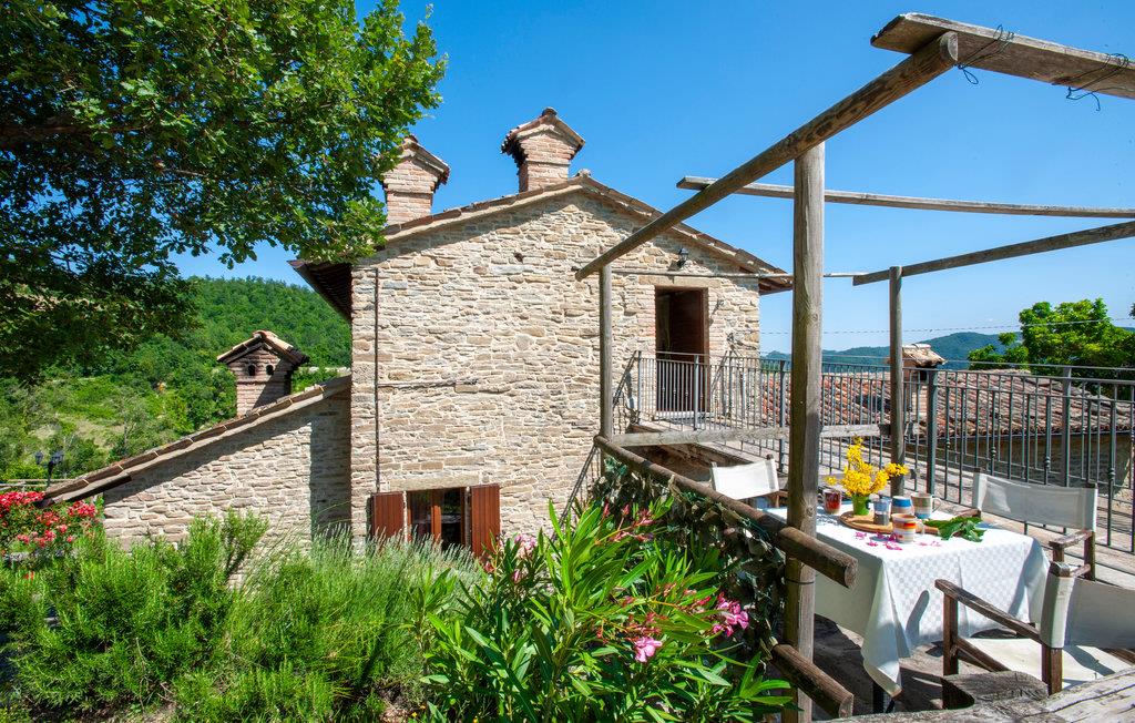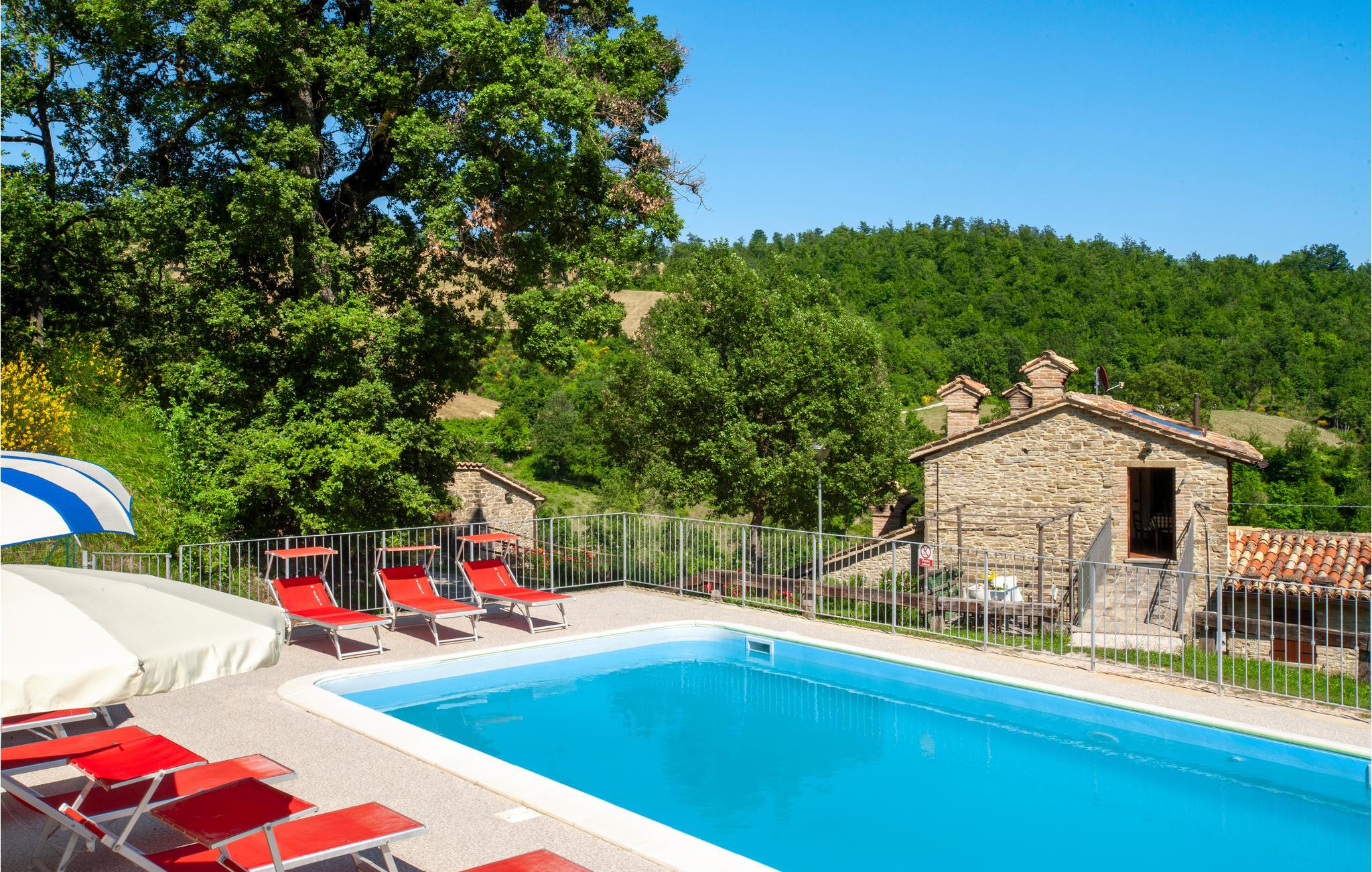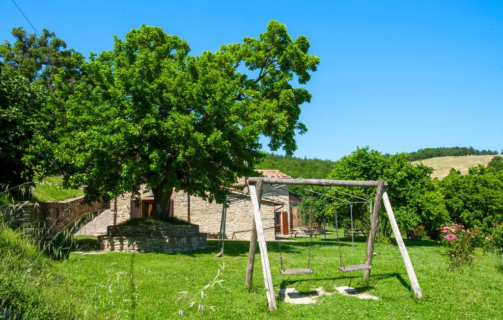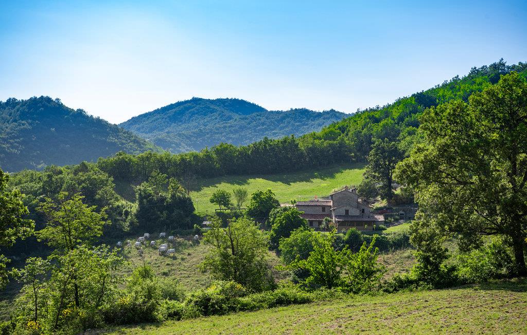 Etwa 6 km oberhalb von Mercatello sul Metauro liegt diese gemütliche Ferienwohnung mit Pool in romantischer Hügellage. Die Wohnung gehört zu einem kleinen Bio-Hof mit Tierhaltung; sie hat einen ebenerdigen Zugang zur Wohnküche, mit offenem Kamin und Schlafcouch (Etagenbetten); ein komfortables Bad (Dusche mit Wassermassage) und ein Schlafzimmer mit Baldachin-Bett. Vor der Wohnung gibt es einen privaten überdachten Sitzplatz; etwas oberhalb liegt der umzäunte Poolbereich mit Sonnenterrassen und Talblick (gemeinsam mit weiteren zwei Ferienwohnungen). – Die Eigentümerin bietet ihren Gästen auf Anfrage lokale Küche in der hauseigenen Trattoria, sowie biologische Produkte aus eigener Produktion. Von der Ferienwohnung können Sie direkt loswandern oder biken – etwa zur Badestelle im Wildbach (5 km) oder nach Mercatello sul Metauro, einer der schönsten mittelalterlichen Städte der Marken, mit Geschäften, Restaurants, Bars auf der Piazza. Spezialitäten der Gegend sind Steinpilze und Trüffelgerichte! Die Lage ist ideal für Erkundungen der sehenswerten Städte der Umgebung: Sant‘Angelo in Vado 10 km, Urbino 35 km, Sansepolcro 42 km oder für einen Badetag an der Adria (Küste bei Fano 70km). Unasphaltierte Zufahrt.
