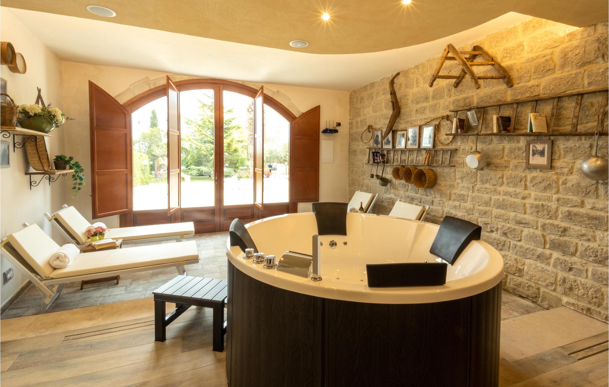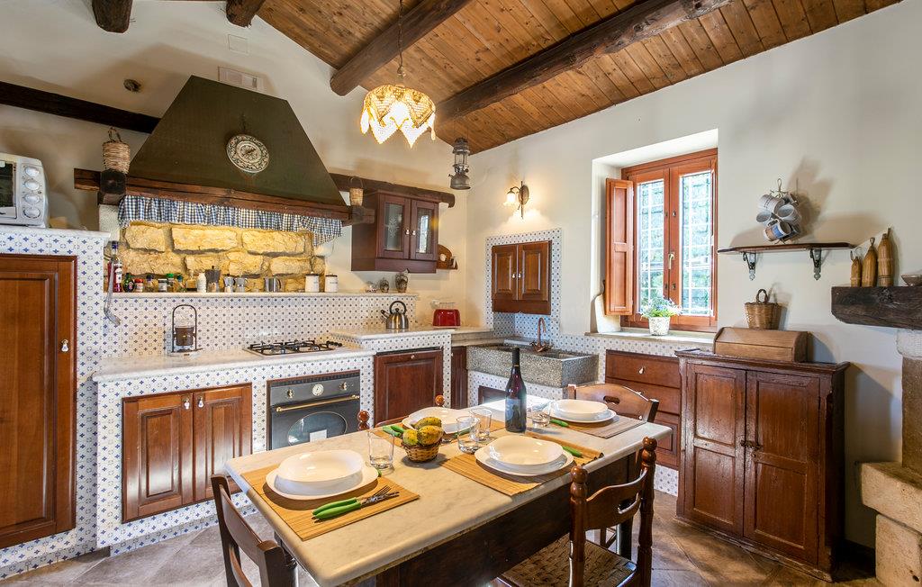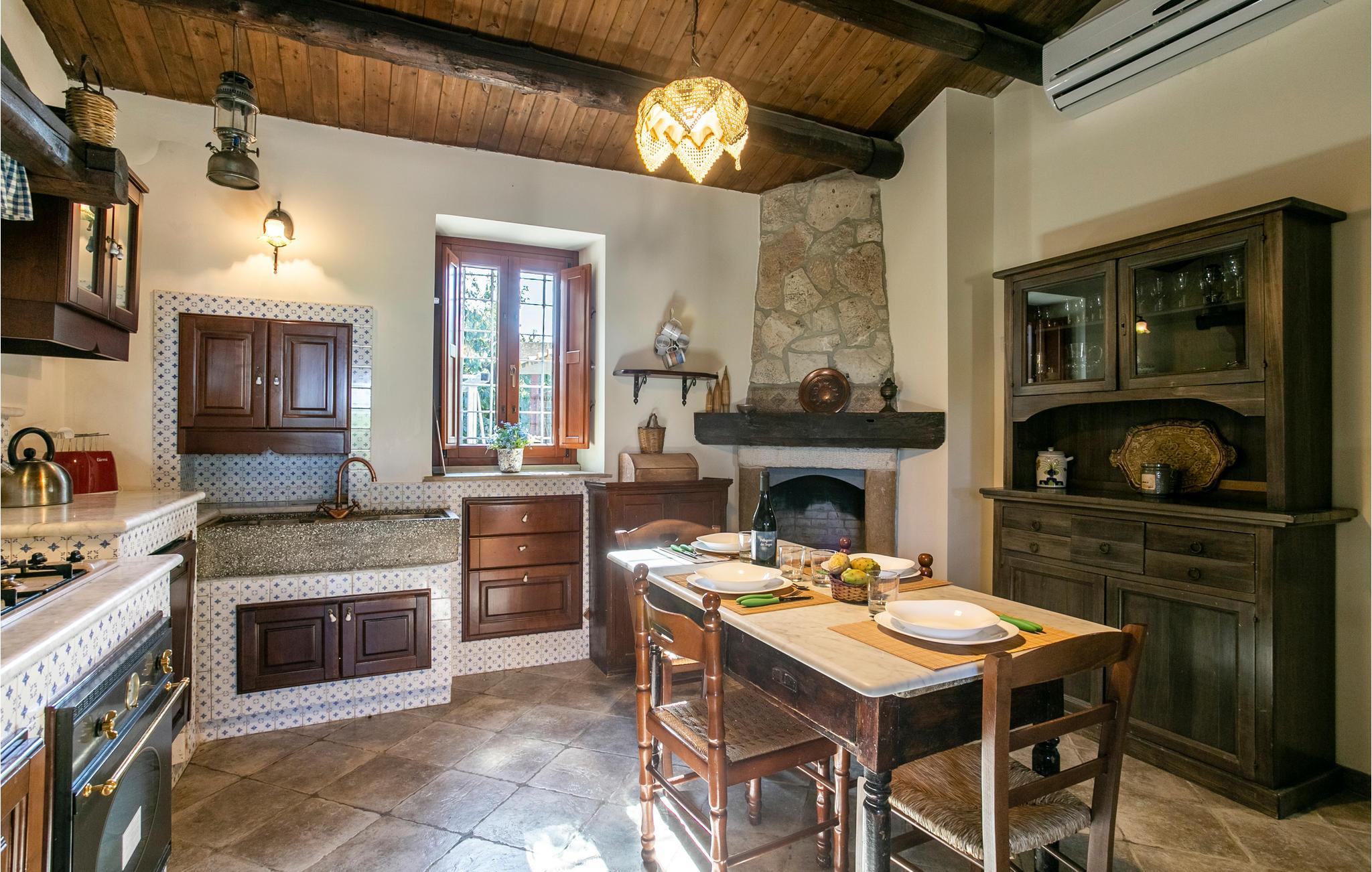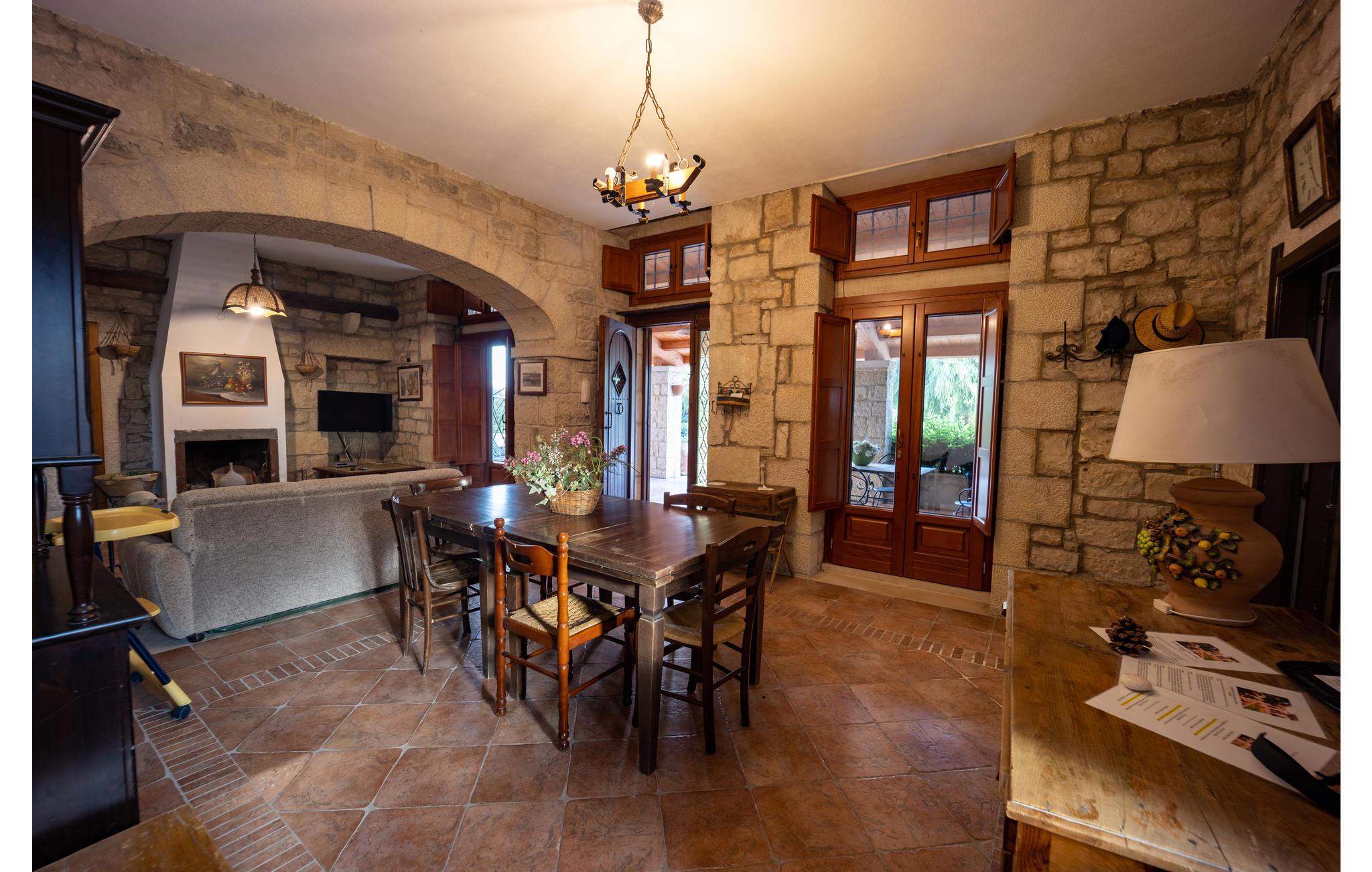 Entdecken Sie den einladenden Innenbereich mit seinen Natursteinwänden, warmen Farben und liebevoll gewählten Details. Entspannen Sie im gemütlichen Wohnzimmer oder bereiten Sie in der traditionellen Küche mit Holzdecke und gemusterten Fliesen köstliche Mahlzeiten zu. Nutzen Sie den direkten Zugang zur großen, überdachten Terrasse, um im Schatten zu speisen. Ein besonderes Highlight ist der private Wellnessbereich mit Whirlpool, Sauna, schottischer Dusche und gemütlichem Ruhebereich – ideal für entspannte Stunden zu jeder Jahreszeit.