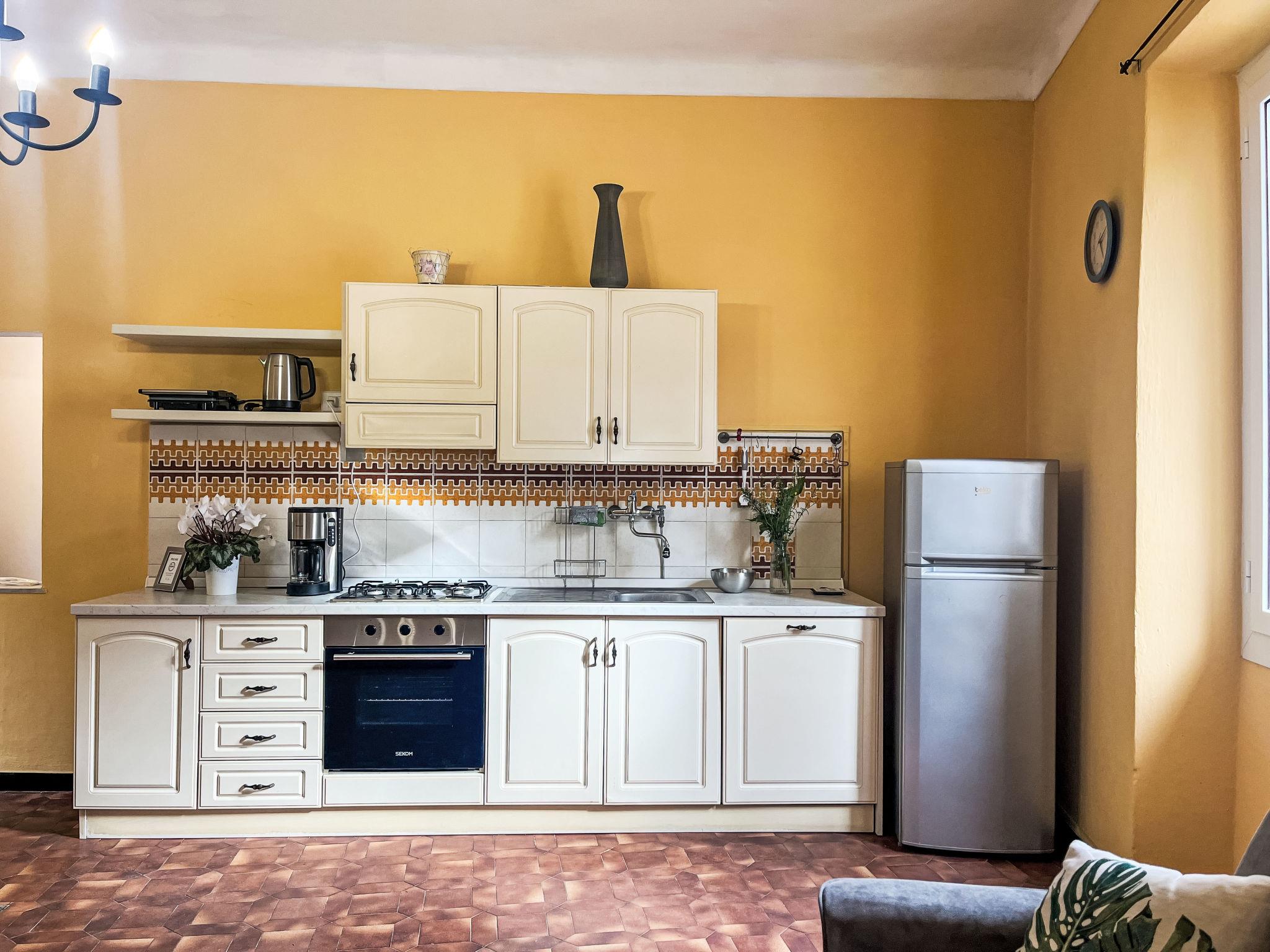 "Giove", 2-Zimmer-Wohnung 50 m2, im erhöhten Erdgeschoss. Geräumig und hell, renoviert im Jahre 2024, geschmackvoll und gemütlich eingerichtet: Wohn-/Schlafzimmer mit 1 Doppeldiwanbett (1 x 160 cm, Länge 200 cm), Esstisch, Küchenblock und Sat-TV. Ausgang zum Garten. 1 Zimmer mit 1 Doppelbett (1 x 160 cm, Länge 200 cm). Kochnische (Backofen, Gasherd, 4 Flammen, Toaster, Wasserkocher, Tiefkühler, elektrische Kaffeemaschine) mit Esstisch. Dusche/WC. G-Heizung. Kleiner Balkon 6 m2, Gartensitzplatz. Terrassenmöbel, Balkonmöbel, Gartengrill. Schöne Sicht auf den Garten und die Ortschaft. Zur Verfügung: Waschmaschine, Bügeleisen, Kinderhochstuhl, Babybett, Haartrockner. Internet (WLAN, gratis). Bitte beachten: Maximal 1 Haustier/Hund erlaubt. Eigener Eingang, Rauchmelder, Feuerlöscher. IT008047C22UITOF52