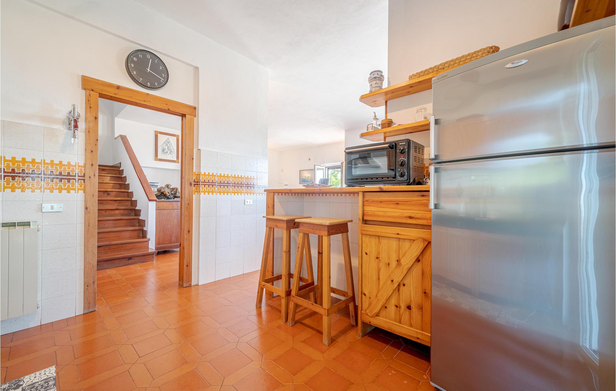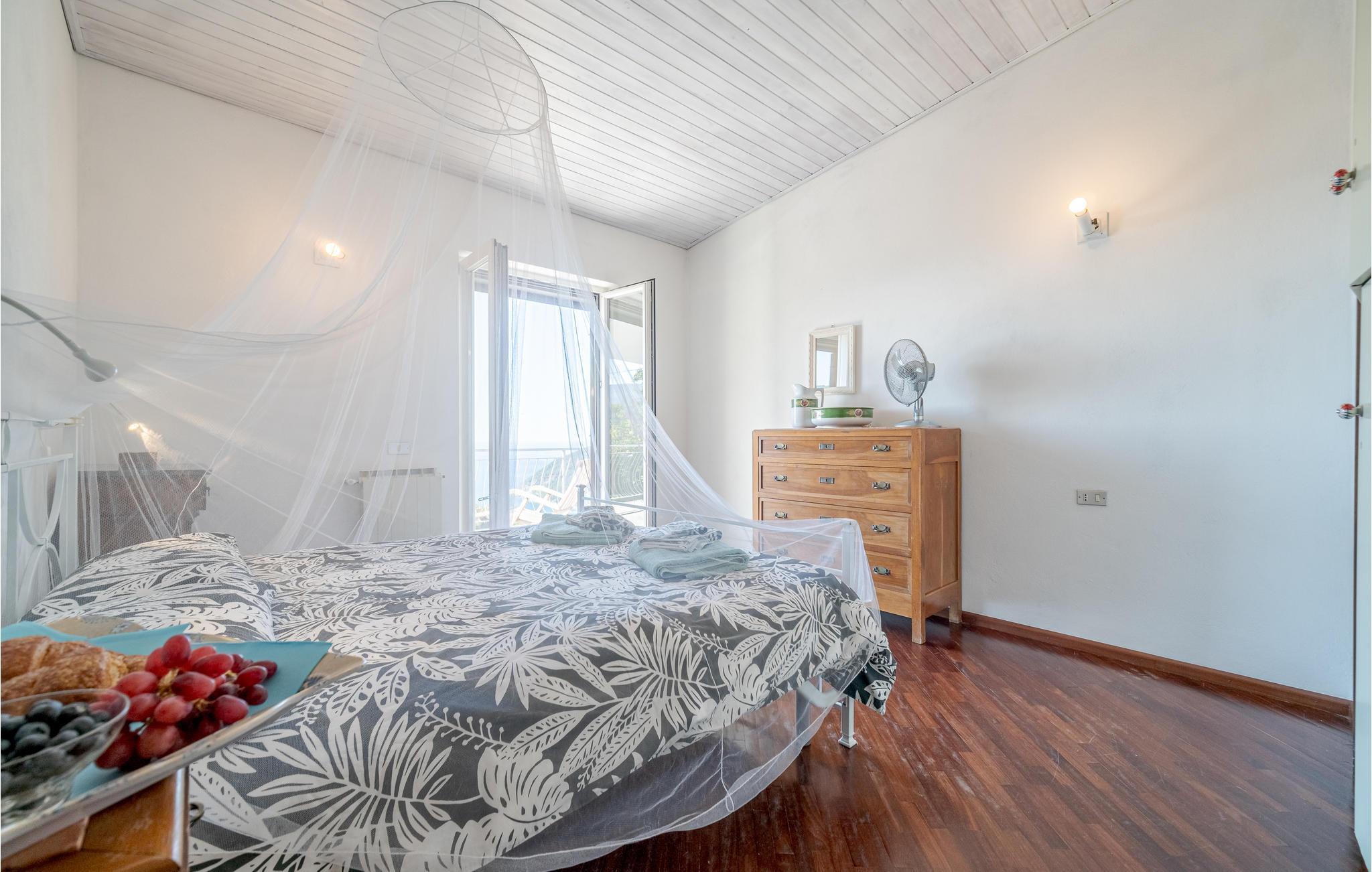 Dieses zweistöckige Ferienhaus bitetet Ihnen einen entspanndenden Aufenthalt unweit vom Sandstrand und Gebirge. Das Haus ist hell und nett eingerichtet. Vom Wohnzimmer aus gelangen Sie auf die von Weinreben teilweise übereckte Terrasse, wo Sie einen großartigen Panoramablick auf das Meer und die Bucht haben. Hier können Sie am Esstisch gemeinsam frühstücken, sich auf den Liegestühlen entspannen oder abends ein Glas Wein genießen und den Tag ausklingen lassen.